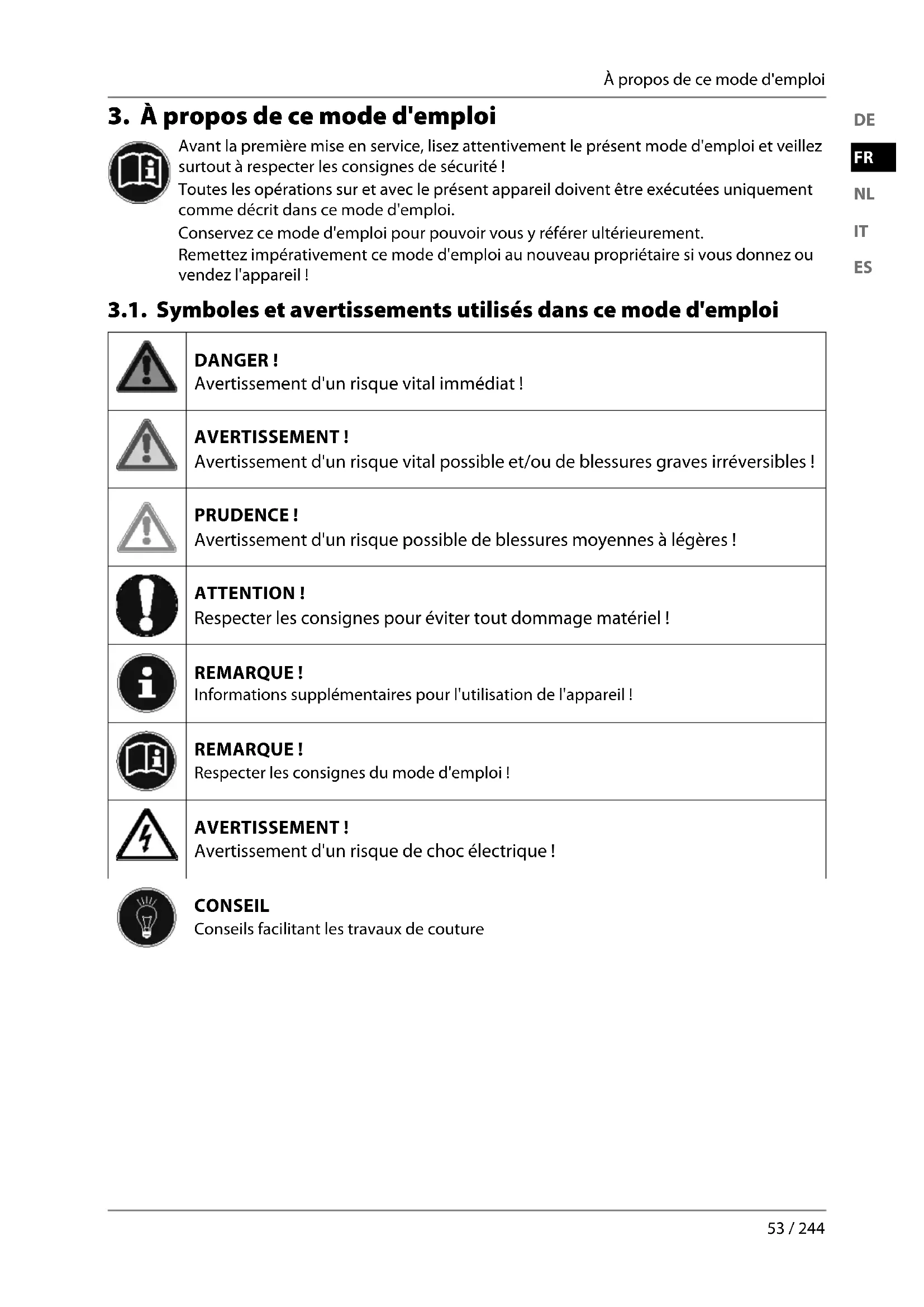 Avant la première mise en service, lisez attentivement le présent mode d'emploi et veillez surtout à respecter les consignes de sécurité ! Toutes les opérations sur et avec le présent appareil doivent être exécutées uniquement comme décrit dans ce mode d'emploi. Conservez ce mode d'emploi pour pouvoir vous y référer ultérieurement. Remettez impérativement ce mode d'emploi au nouveau propriétaire si vous donnez ou vendez l'appareil ! 3.1. Symboles et avertissements utilisés dans ce mode d'emploi DANGER! Avertissement d'un risque vital immédiat ! AVERTISSEMENT ! Avertissement d'un risque vital possible et/ou de blessures graves irréversibles ! PRUDENCE ! Avertissement d'un risque possible de blessures moyennes à légères ! ATTENTION! Respecter les consignes pour éviter tout dommage matériel ! REMARQUE ! Informations supplémentaires pour l'utilisation de l'appareil ! REMARQUE ! Respecter les consignes du mode d'emploi ! AVERTISSEMENT ! Avertissement d'un risque de choc électrique ! CONSEIL Conseils facilitant les travaux de couture 18205 ML WE ML Content 5005 6038 final.indb 5318205 ML WE ML Content 5005 6038 final.indb 53 06.07.2017 08:12:4506.07.2017 08:12:4554 / 244 Utilisation conforme
