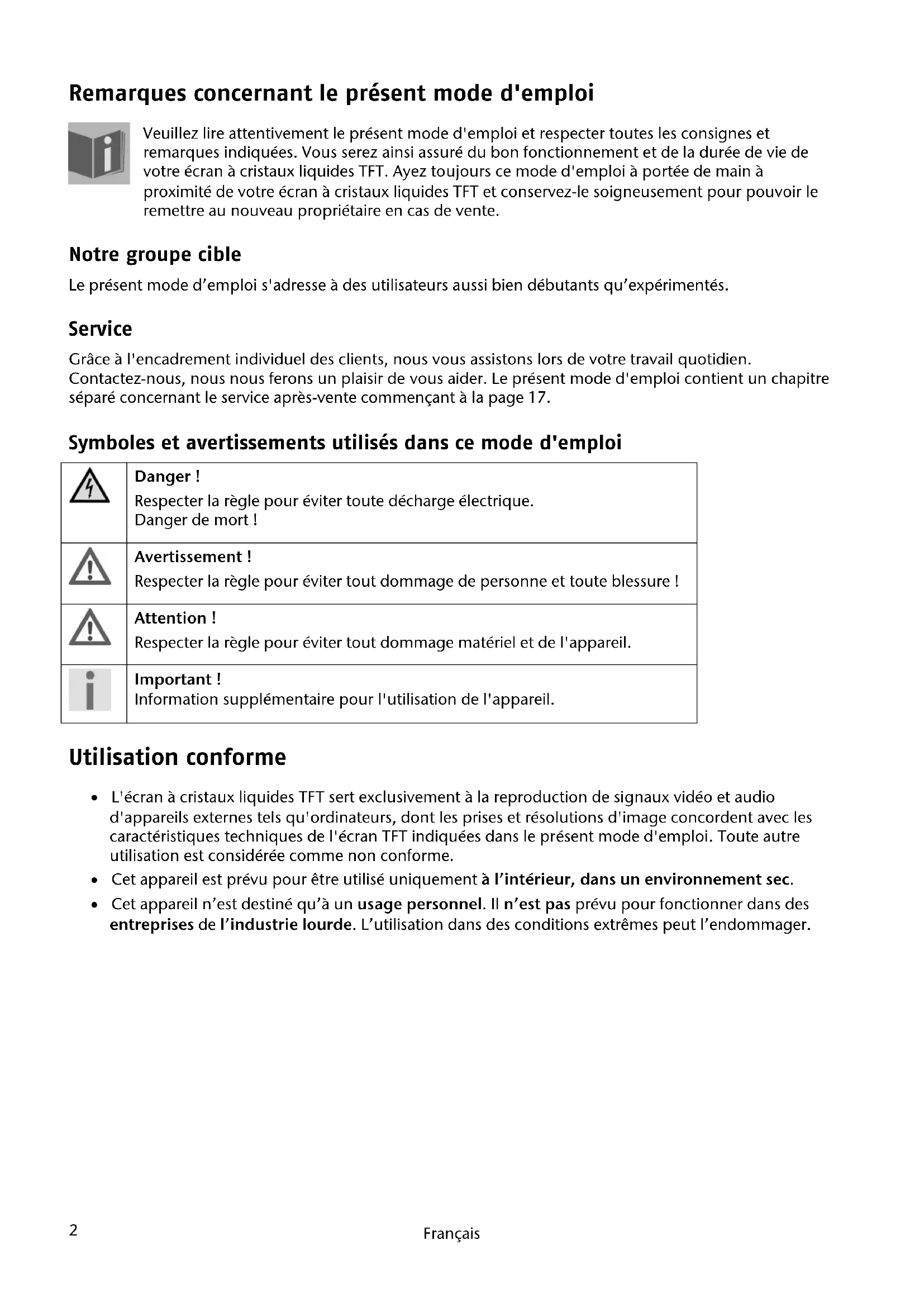 Remarques concernant le présent mode d'emploi Veuillez lire attentivement le présent mode d'emploi et respecter toutes les consignes et remarques indiquées. Vous serez ainsi assuré du bon fonctionnement et de la durée de vie de votre écran à cristaux liquides TFT. Ayez toujours ce mode d'emploi à portée de main à proximité de votre écran à cristaux liquides TFT et conservez-le soigneusement pour pouvoir le remettre au nouveau propriétaire en cas de vente. Notre groupe cible Le présent mode d’emploi s'adresse à des utilisateurs aussi bien débutants qu’expérimentés. Service Grâce à l'encadrement individuel des clients, nous vous assistons lors de votre travail quotidien. Contactez-nous, nous nous ferons un plaisir de vous aider. Le présent mode d'emploi contient un chapitre séparé concernant le service après-vente commençant à la page 17. Symboles et avertissements utilisés dans ce mode d'emploi Danger ! Respecter la règle pour éviter toute décharge électrique. Danger de mort ! Avertissement ! Respecter la règle pour éviter tout dommage de personne et toute blessure ! Attention ! Respecter la règle pour éviter tout dommage matériel et de l'appareil. Important ! Information supplémentaire pour l'utilisation de l'appareil. Utilisation conforme L'écran à cristaux liquides TFT sert exclusivement à la reproduction de signaux vidéo et audio d'appareils externes tels qu'ordinateurs, dont les prises et résolutions d'image concordent avec les caractéristiques techniques de l'écran TFT indiquées dans le présent mode d'emploi. Toute autre utilisation est considérée comme non conforme. Cet appareil est prévu pour être utilisé uniquement à l’intérieur, dans un environnement sec. Cet appareil n’est destiné qu’à un usage personnel. Il n’est pas prévu pour fonctionner dans des entreprises de l’industrie lourde. L’utilisation dans des conditions extrêmes peut l’endommager.Inventaire de la livraison