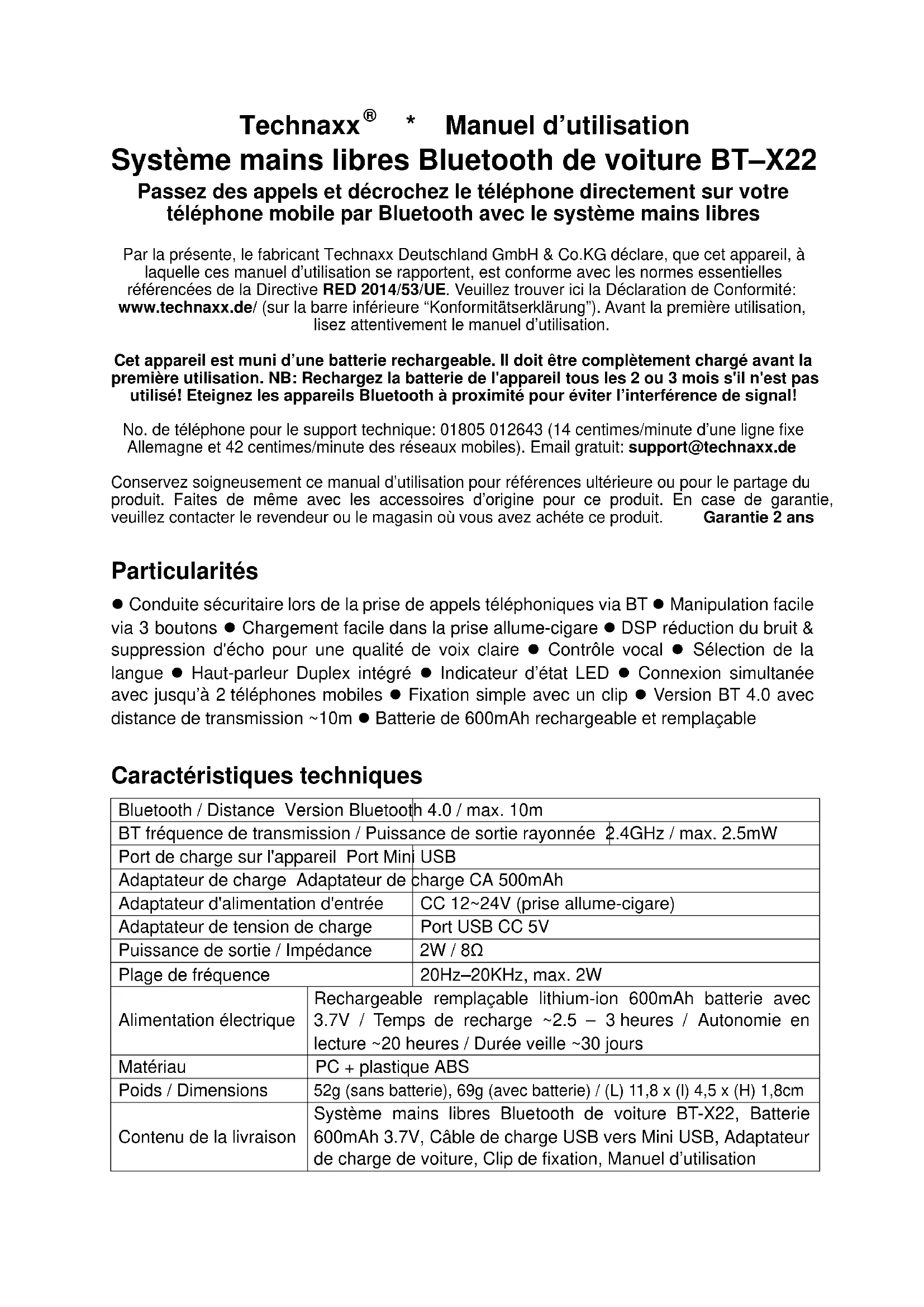 - Manuel d’utilisation Système mains libres Bluetooth de voiture BT–X22 Passez des appels et décrochez le téléphone directement sur votre téléphone mobile par Bluetooth avec le système mains libres Par la présente, le fabricant Technaxx Deutschland GmbH & Co.KG déclare, que cet appareil, à laquelle ces manuel d’utilisation se rapportent, est conforme avec les normes essentielles référencées de la Directive RED 2014/53/UE. Veuillez trouver ici la Déclaration de Conformité: www.technaxx.de/ (sur la barre inférieure “Konformitätserklärung”). Avant la première utilisation, lisez attentivement le manuel d’utilisation. Cet appareil est muni d’une batterie rechargeable. Il doit être complètement chargé avant la première utilisation. NB: Rechargez la batterie de l'appareil tous les 2 ou 3 mois s'il n'est pas utilisé! Eteignez les appareils Bluetooth à proximité pour éviter l’interférence de signal! No. de téléphone pour le support technique: 01805 012643 (14 centimes/minute d’une ligne fixe Allemagne et 42 centimes/minute des réseaux mobiles). Email gratuit: support@technaxx.de Conservez soigneusement ce manual d’utilisation pour références ultérieure ou pour le partage du produit. Faites de même avec les accessoires d’origine pour ce produit. En case de garantie, veuillez contacter le revendeur ou le magasin où vous avez achéte ce produit. Garantie 2 ans Particularités Conduite sécuritaire lors de la prise de appels téléphoniques via BT Manipulation facile via 3 boutons Chargement facile dans la prise allume-cigare DSP réduction du bruit & suppression d'écho pour une qualité de voix claire Contrôle vocal Sélection de la langue Haut-parleur Duplex intégré Indicateur d’état LED Connexion simultanée avec jusqu’à 2 téléphones mobiles Fixation simple avec un clip Version BT 4.0 avec distance de transmission ~10m Batterie de 600mAh rechargeable et remplaçable Caractéristiques techniques Bluetooth / Distance Version Bluetooth 4.0 / max. 10m BT fréquence de transmission / Puissance de sortie rayonnée 2.4GHz / max. 2.5mW Port de charge sur l'appareil Port Mini USB Adaptateur de charge Adaptateur de charge CA 500mAh Adaptateur d'alimentation d'entrée CC 12~24V (prise allume-cigare) Adaptateur de tension de charge Port USB CC 5V Puissance de sortie / Impédance 2W / 8Ω Plage de fréquence 20Hz–20KHz, max. 2W Alimentation électrique Rechargeable remplaçable lithium-ion 600mAh batterie avec 3.7V / Temps de recharge ~2.5 – 3 heures / Autonomie en lecture ~20 heures / Durée veille ~30 jours Matériau PC + plastique ABS Poids / Dimensions 52g (sans batterie), 69g (avec batterie) / (L) 11,8 x (l) 4,5 x (H) 1,8cm Contenu de la livraison Système mains libres Bluetooth de voiture BT-X22, Batterie 600mAh 3.7V, Câble de charge USB vers Mini USB, Adaptateur de charge de voiture, Clip de fixation, Manuel d’utilisationAperçu du produit