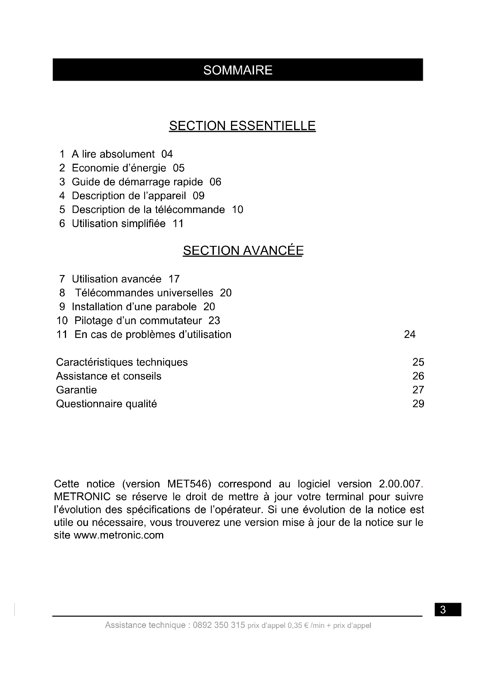 7 Utilisation avancée 17 8 Télécommandes universelles 20 9 Installation d’une parabole 20 10 Pilotage d’un commutateur 23 11 En cas de problèmes d’utilisation 24 Caractéristiques techniques 25 Assistance et conseils 26 Garantie 27 Questionnaire qualité 29 SOMMAIRE Cette notice (version MET546) correspond au logiciel version 2.00.007. METRONIC se réserve le droit de mettre à jour votre terminal pour suivre l’évolution des spécifications de l’opérateur. Si une évolution de la notice est utile ou nécessaire, vous trouverez une version mise à jour de la notice sur le site www.metronic.com4 Assistance technique : 0892 350 315 prix d’appel 0,35 € /min + prix d’appel