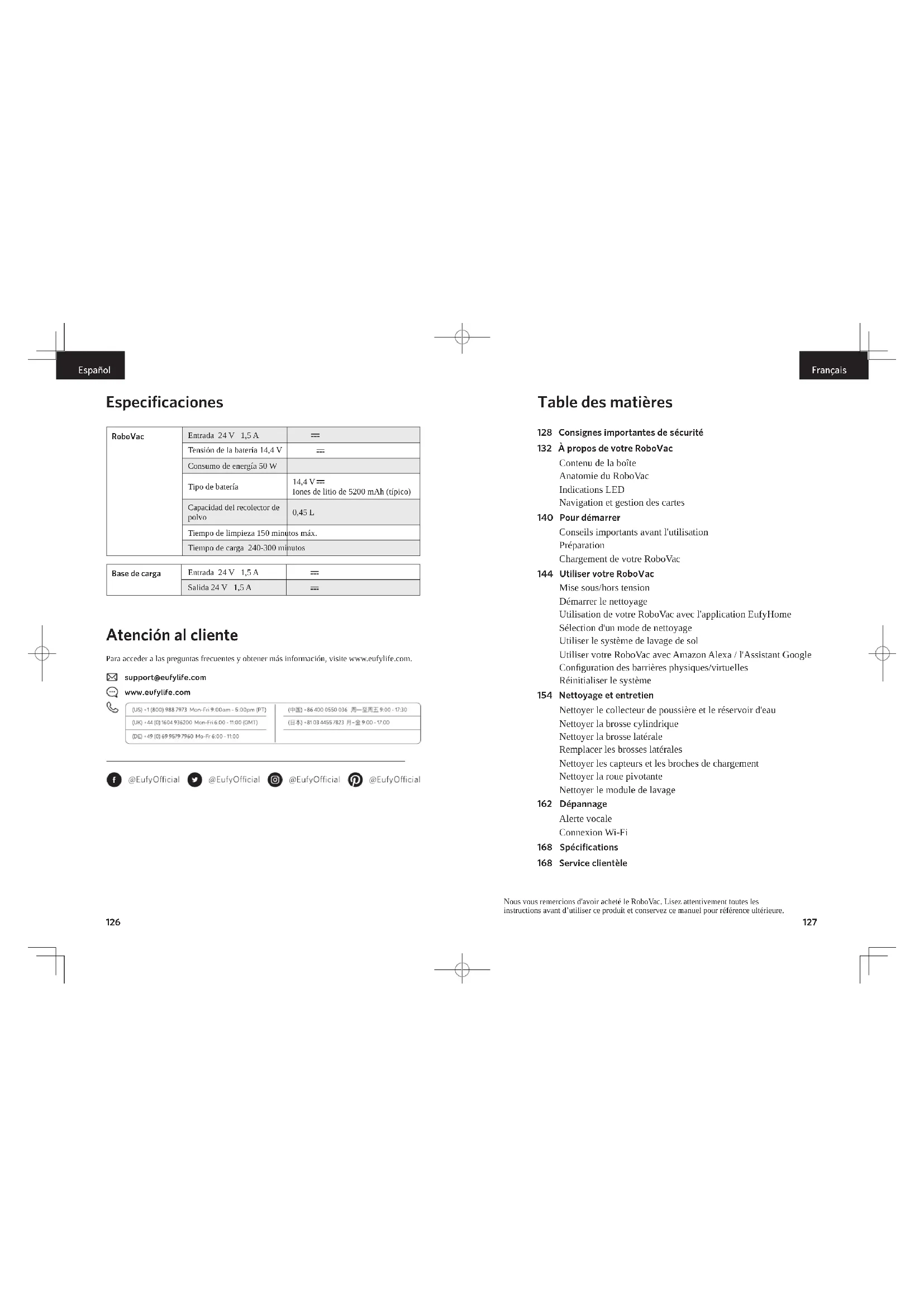 Español Especificaciones RoboVac Entrada 24 V 1,5 A Tensión de la batería 14,4 V Consumo de energía 50 W Tipo de batería 14,4 V Iones de litio de 5200 mAh (típico) Capacidad del recolector de polvo 0,45 L Tiempo de limpieza 150 minutos máx. Tiempo de carga 240-300 minutos Base de carga Entrada 24 V 1,5 A Salida 24 V 1,5 A Atención al cliente Para acceder a las preguntas frecuentes y obtener más información, visite www.eufylife.com. support@eufylife.com www.eufylife.com Nous vous remercions d'avoir acheté le RoboVac. Lisez attentivement toutes les instructions avant d’utiliser ce produit et conservez ce manuel pour référence ultérieure. Table des matières 128 Consignes importantes de sécurité 132 À propos de votre RoboVac Contenu de la boîte Anatomie du RoboVac Indications LED Navigation et gestion des cartes 140 Pour démarrer Conseils importants avant l'utilisation Préparation Chargement de votre RoboVac 144 Utiliser votre RoboVac Mise sous/hors tension Démarrer le nettoyage Utilisation de votre RoboVac avec l'application EufyHome Sélection d'un mode de nettoyage Utiliser le système de lavage de sol Utiliser votre RoboVac avec Amazon Alexa / l'Assistant Google Configuration des barrières physiques/virtuelles Réinitialiser le système 154 Nettoyage et entretien Nettoyer le collecteur de poussière et le réservoir d'eau Nettoyer la brosse cylindrique Nettoyer la brosse latérale Remplacer les brosses latérales Nettoyer les capteurs et les broches de chargement Nettoyer la roue pivotante Nettoyer le module de lavage 162 Dépannage Alerte vocale Connexion Wi-Fi 168 Spécifications 168 Service clientèle128 129 Français Français Consignes importantes de sécurité Pour réduire le risque de blessure ou de dommage, lisez attentivement les consignes de sécurité et gardez-les à portée de main lors de la configuration, l'utilisation et l'entretien de cet appareil.