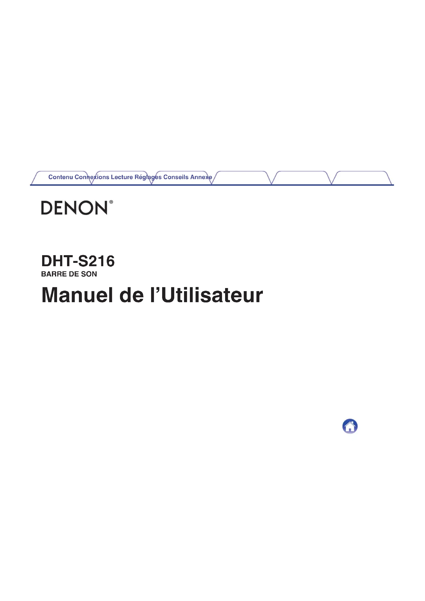Téléchargez la notice de votre Barre de son au format PDF gratuitement ! Retrouvez votre notice DHTS216 - DENON et reprennez votre appareil électronique en main. Sur cette page sont publiés tous les documents nécessaires à l'utilisation de votre appareil DHTS216 de la marque DENON.