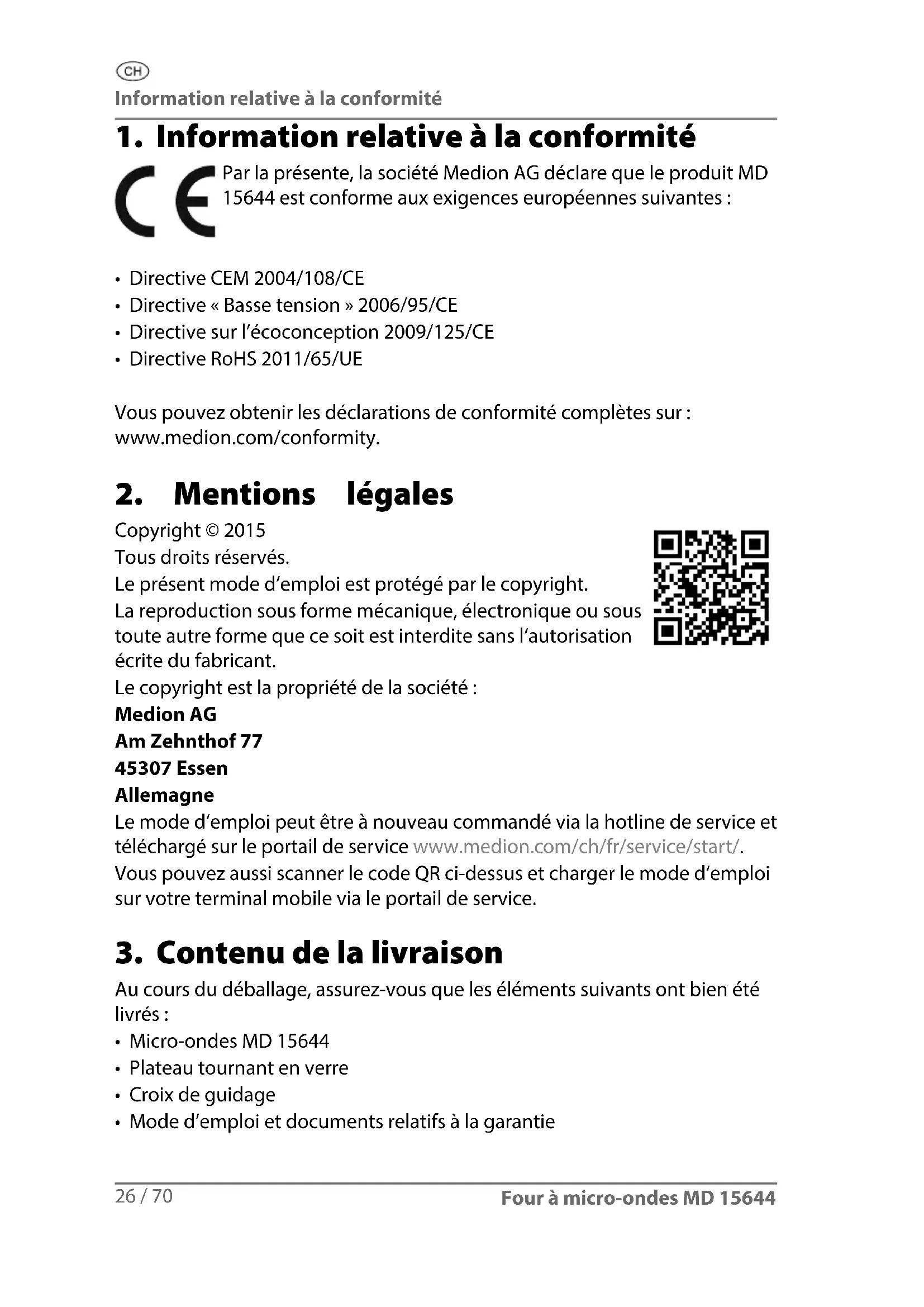 Copyright © 2015 Tous droits réservés. Le présent mode d‘emploi est protégé par le copyright. La reproduction sous forme mécanique, électronique ou sous toute autre forme que ce soit est interdite sans l‘autorisation écrite du fabricant. Le copyright est la propriété de la société : Medion AG Am Zehnthof 77 45307 Essen Allemagne Le mode d‘emploi peut être à nouveau commandé via la hotline de service et téléchargé sur le portail de service www.medion.com/ch/fr/service/start/. Vous pouvez aussi scanner le code QR ci-dessus et charger le mode d‘emploi sur votre terminal mobile via le portail de service.