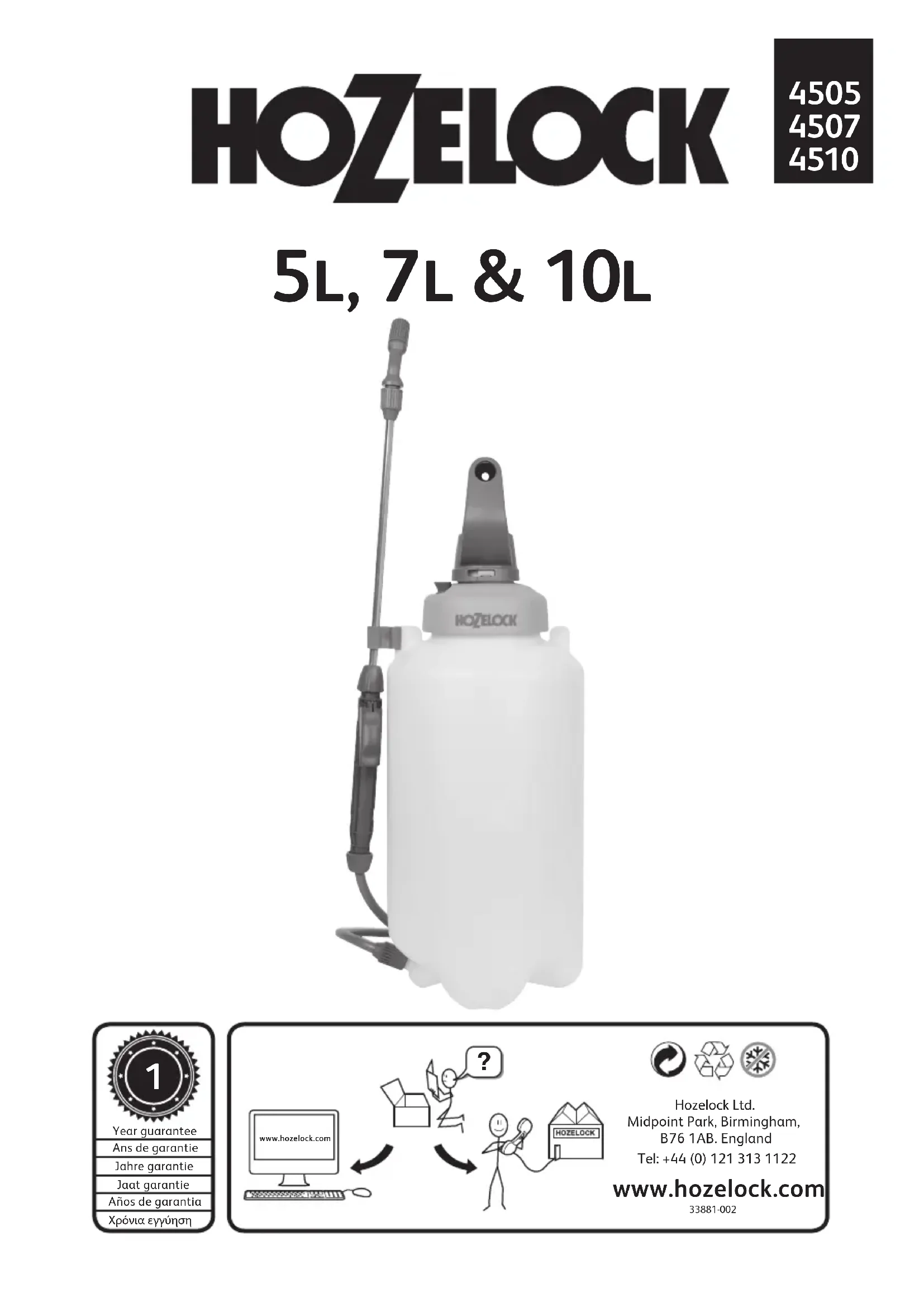 - Hozelock garantit ce pulvérisateur pour tout défaut résultant d’un vice de matériaux ou de fabrication pendant une période de 1 ans à compter de la date de l’achat, à condition qu’il soit utilisé conformément à ces instructions. La garantie est limitée à la réparation ou au remplacement de tout article défectueux. La preuve d’achat doit être conservée.