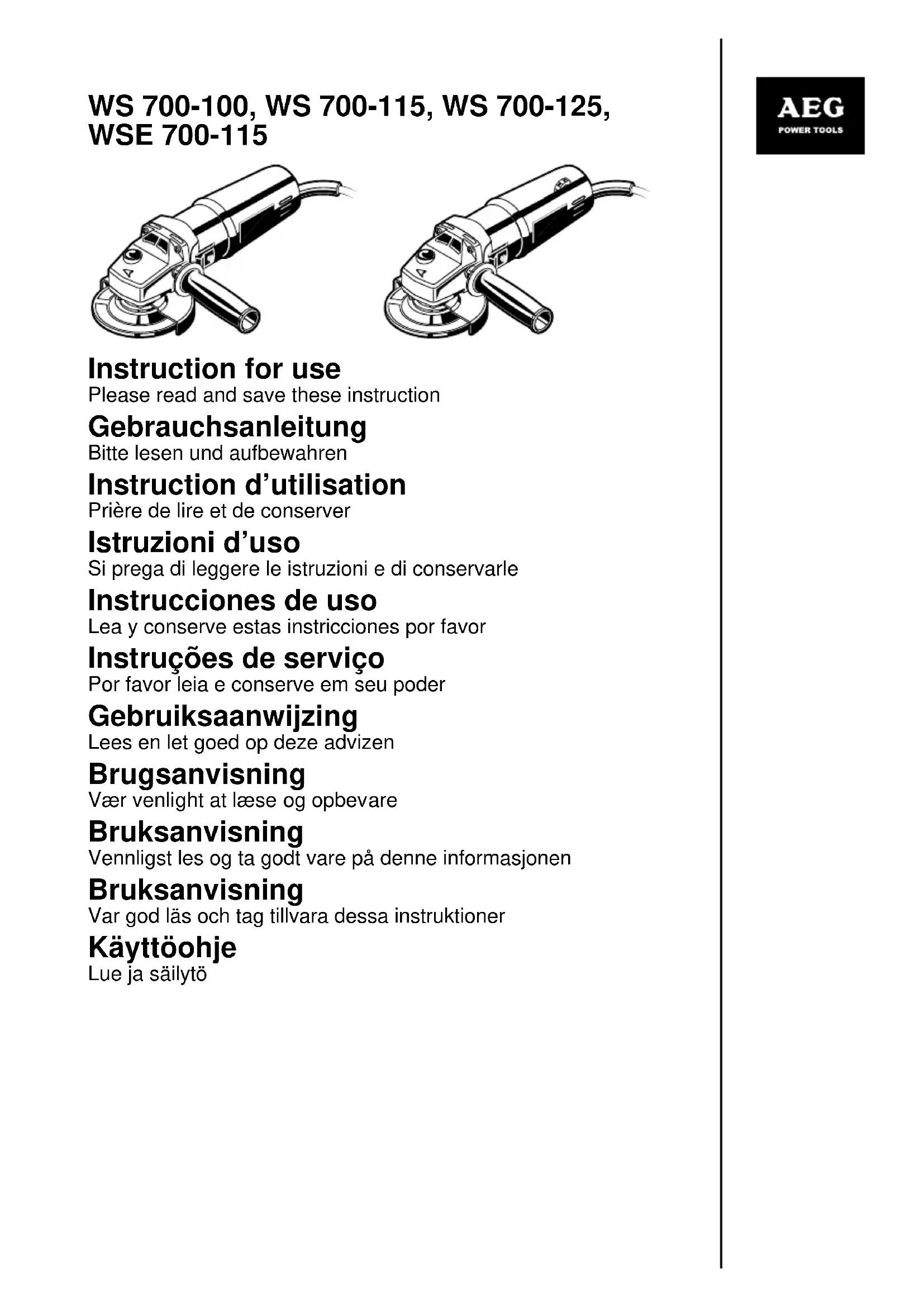 2FRANÇAIS 14 WS 700-100, WS 700-115, WS 700-125, WSE 700-115 Modifications: Les textes, les illustrations et les données techniques correspondent à la situation au moment de l’impression. Toutes modifications techniques sont réservées dans le cadre du développe- ment technique permanent. Blocage de l’arbre moteur Sens de rotation Arbre moteur Interrupteur Marche/Arrêt avec blocage Limitation de vitesse à vide pour une marche silencieuse (uniquement sur WSE 700-115) L’électronique de commande permet d’obtenir une vitesse constante quel que soit le degré de sollicita- tion du moteur (uniquement sur WSE 700-115) Outil Description succinte Poignée complémentaire Capot de protection avec vis de serrage Flasque de serrage Ecrou du flasque Clé à ergots Molette de réglage de la vitesse (uniquement sur WSE 700-115)FRANÇAIS 15 WS 700-100, WS 700-115, WS 700-125, WSE 700-115 Electronique L’électronique règle la vitesse de rotation conformément au degré de sollicitation. En cas d’extrêmes perturbations électromagnétiques extérieures, il peut y avoir, dans des cas isolés, des variations temporaires de la vitesse de rotation. Présélection de la vitesse (WSE 700-115) Présélection de la vitesse par molette: A=Vitesse réduite G=Vitesse élevée Montage du capot protecteur Monter le capot de protection sur le col de serra- ge, si nécessaire desserrer légèrement la vis de serrage. Orienter le capot de protection suivant les be- soins, puis serrer la vis de serrage jusqu‘à ce que le capot de protection soit bien serré. Lorsque la vis de serrage est bien serrée, le capot de protection ne doit plus bouger. Veiller à ce que la meule puisse tourner librement. Fixation de l’outil Avant tous travaux sur la machine, la débrancher. Bloquer l’arbre moteur en appuyant sur le blocage de l’arbre moteur. Monter le flasque de serrage, l’outil et l’écrou du flasque conformément à la figure. Serrer et lâcher l’écrou du flasque à l’aide d’une clé à ergots.FRANÇAIS 16 WS 700-100, WS 700-115, WS 700-125, WSE 700-115 Instructions d’utilisation Lors du travail ne pas exercer une trop grande pression sur l’outil mais guider la meule de façon régulière sur la pièce à travailler. Travaux d’ébarbage Lors des travaux d’ébarbage, la plus grande efficacité est atteinte lorsque la meule est posée à au moins 30° par rapport au plan de travail. Une sollicitation trop élevée durant le travail nuit à la machine et provoque une usure plus rapide des disques. La performance s’en trouve réduite. Ne jamais utiliser de disques à tronçonner pour exécuter des travaux d’ébarbage. Ne pas exercer de pression latérale sur un disque à tronçonner. Travaux de tronçonnage Lors des travaux de tronçonnage, ne pas tenir l’outil de biais par rapport au plan de travail. La meule de tronçonnage doit présenter une arête de coupe irréprochable. Le chariot de guidage est obligatoire pour des travaux de tronçonnage de la pierre. Ponçage des surfaces Pour le ponçage des surfaces utiliser un plateau de ponçage en matière plastique avec disque abrasif. Utiliser une brosse métallique pour éliminer la rouille ou de vieilles couches de peinture. Vitesse de travail appropriée (WSE 700-115) La vitesse de rotation dépend en outre de la dureté du matériau à travailler ainsi que de la qualité de l’abrasif: Entretien La machine et ses ouïes de refroidissement doivent toujours rester propres. N’utiliser que des pièces et accessoires AEG. Pour des pièces dont l’échange n’est pas décrit, s’adresser de préférence aux stations de service après-vente AEG (voir brochure Garantie/Adresses des stations de service après-vente). Si besoin est, une vue éclatée de l’appareil peut être fournie. S’adresser, en indi- quant bien le type de la machine et le numéro à dix chiffres figurant sur la plaque signalétique, à votre station de service après-vente (voir liste jointe) ou directement à Atlas Copco Electric Tools GmbH, B.P. 320, D-71361 Winnenden. Accessoire Consulter nos catalogues qui vous renseignent sur notre programme d’accessoires avec leur référence. Utilisation Electronique Ponçage des plastiques avec plateau de ponçage et feuille abrasive A-C Ponçage de bois et décapage de peinture avec plateau de ponçage et feuille abrasive B-D Meulage des métaux et des mastics avec plateau de ponçage et abrasive C-F Dérouillage de piéces métalliques avec brosse métallique D-F Ebarbage d’acier, Tronçonnage pierre et acier G Polissage avec plateau et peau de mouton A-BITALIANO 17 WS 700-100, WS 700-115, WS 700-125, WSE 700-115 Premessa Lei è decisamente esigente e per questa ragione acquista solo prodotti di qualità. Qualità che la Atlas Copco è perfettamente in grado di garantirLe. Abbiamo realiz- zato proprio per Lei un utensile che sia il più possibile affidabile e sicuro. Ora tocca a Lei. Perchè anche il Suo lavoro sia sicuro e di ottima qualità, La preghiamo di voler leggere attentamente le istruzioni per l’uso. È nostro desiderio, infatti, che anche in futuro acquisti utensili elettrici AEG della Atlas Copco. Dati tecnici Norme di sicurezza ■ Attenersi alle norme di sicurezza riportate nell’allegato 4 000 333 024! ■ Evitare di forare la carcassa dell’utensile per non danneggiare l’isolamento. (Utiliz- zare placchette adesive). ■ Estrarre la spina dalla presa prima di eseguire una qualunque operazione di impo- stazione o di manutenzione. ■ Inserire la spina solo con interruttore su posizione „OFF“. ■ Tenere sempre lontano il cavo di collegamento dall’area di lavoro dell’attrezzo. ■ Prima di ogni utilizzo controllare che il cavo di alimentazione, eventuali prolunghe e la spina siano senza danni. Eventuali parti danneggate devono essere controllate e riparate da un tecnico. ■ L’alberino portautensile continua a girare dopo che la macchina viene disinserita. Appogiare la macchin