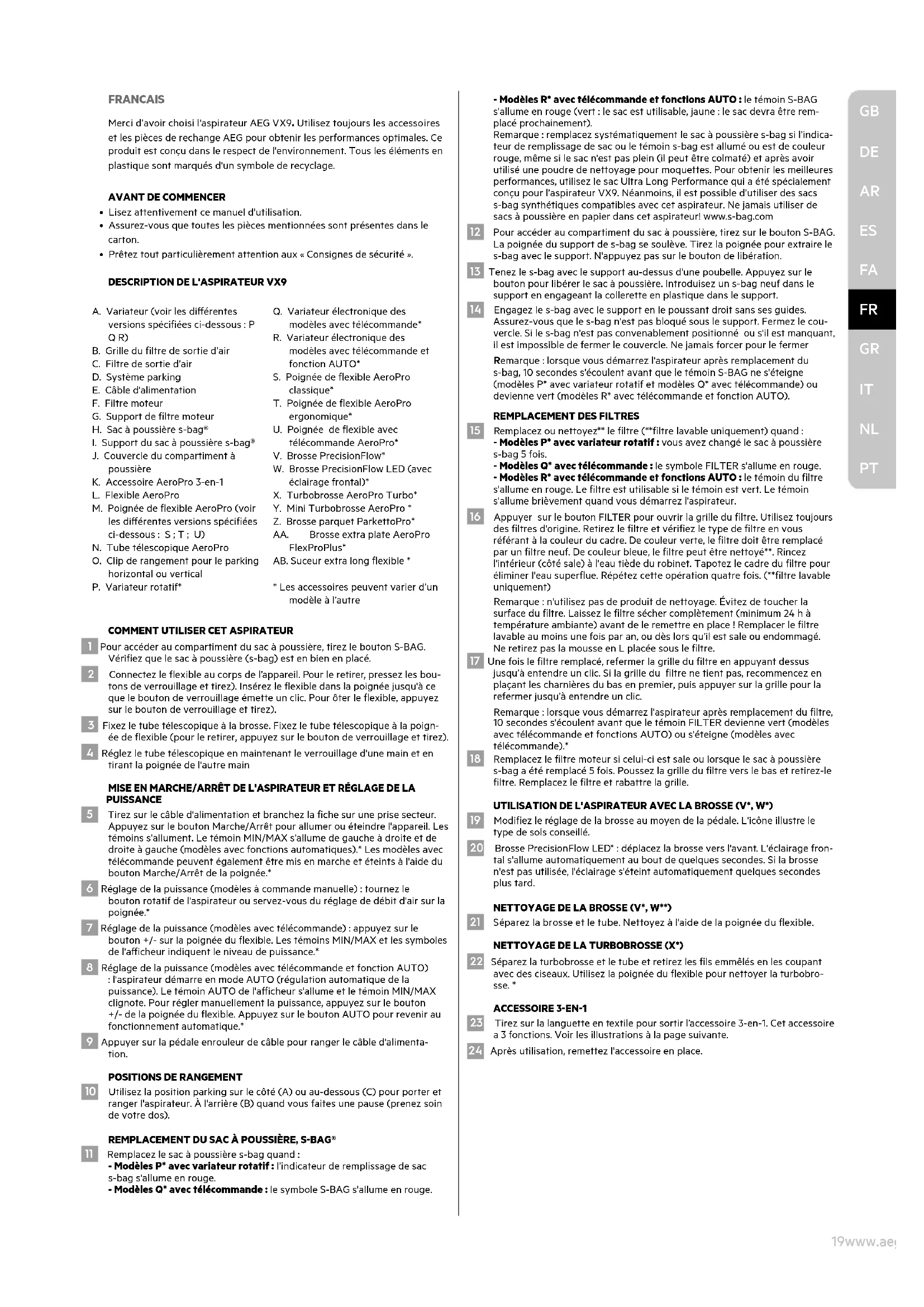 PT19www.aeg.com FRANCAIS Merci d’avoir choisi l'aspirateur AEG VX9. Utilisez toujours les accessoires et les pièces de rechange AEG pour obtenir les performances optimales. Ce produit est conçu dans le respect de l'environnement. Tous les éléments en plastique sont marqués d'un symbole de recyclage.