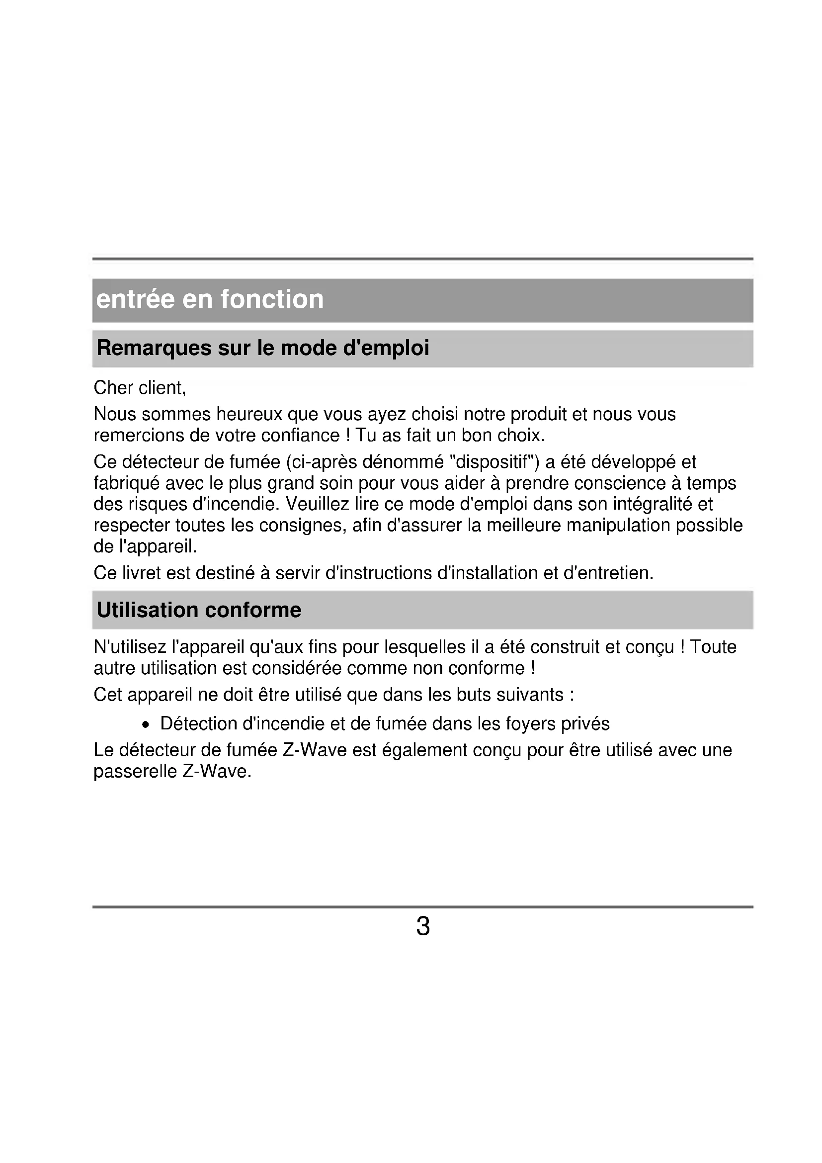 - déclaration de performance entrée en fonction Remarques sur le mode d'emploi Cher client, Nous sommes heureux que vous ayez choisi notre produit et nous vous remercions de votre confiance ! Tu as fait un bon choix. Ce détecteur de fumée (ci-après dénommé "dispositif") a été développé et fabriqué avec le plus grand soin pour vous aider à prendre conscience à temps des risques d'incendie. Veuillez lire ce mode d'emploi dans son intégralité et respecter toutes les consignes, afin d'assurer la meilleure manipulation possible de l'appareil. Ce livret est destiné à servir d'instructions d'installation et d'entretien. Utilisation conforme N'utilisez l'appareil qu'aux fins pour lesquelles il a été construit et conçu ! Toute autre utilisation est considérée comme non conforme ! Cet appareil ne doit être utilisé que dans les buts suivants : Détection d'incendie et de fumée dans les foyers privés Le détecteur de fumée Z-Wave est également conçu pour être utilisé avec une passerelle Z-Wave.4 Limitation de responsabilité Vos droits se limitent à la réparation ou au remplacement de ce produit tel que livré. ABUS Security Center n'assume aucune responsabilité pour tout dommage spécial, accessoire ou consécutif, y compris, mais sans s'y limiter, la perte de revenus, la perte de profit, les restrictions dans l'utilisation du logiciel, la perte ou la récupération des données, les coûts de remplacement de l'équipement, les temps d'arrêt, les dommages matériels et les réclamations de tiers, à la suite de l'utilisation du logiciel et en relation avec l'utilisation du logiciel. a. la garantie, contractuelle, légale ou les réclamations pour dommages nonobstant d'autres dispositions de garantie limitée ou implicite ou dans le cas où la garantie limitée ne s'applique pas, l'étendue de la responsabilité d'ABUS Security Center est limitée au prix d'achat du produit. Le contenu de ce manuel peut être modifié sans préavis. ABUS Security-Center GmbH & Co KG, 10/20184 consignes de sécurité explication des symboles Les symboles suivants sont utilisés dans le manuel ou sur l'appareil : figure emblém atique mot de signaleme p. 263