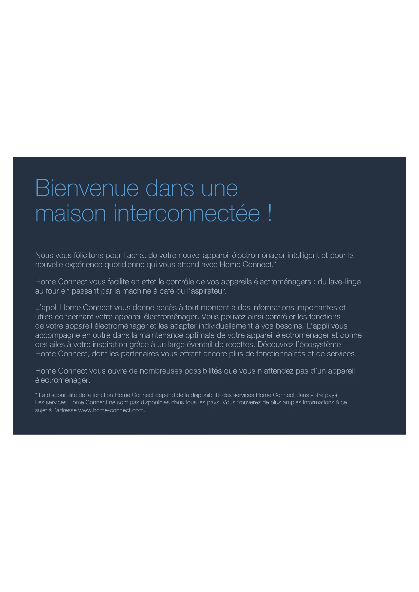 . Ha nalizado el proceso de conexión. Nota: Si no pudo establecerse la conexión, asegúrese de que el teléfono inteligente/tableta se encuentra en el margen de alcance de su red doméstica.20 DE Nous vous félicitons pour l’achat de votre nouvel appareil électroménager intelligent et pour la nouvelle expérience quotidienne qui vous attend avec Home Connect.* Home Connect vous facilite en eet le contrôle de vos appareils électroménagers : du lave-linge au four en passant par la machine à café ou l’aspirateur. L’appli Home Connect vous donne accès à tout moment à des informations importantes et utiles concernant votre appareil électroménager. Vous pouvez ainsi contrôler les fonctions de votre appareil électroménager et les adapter individuellement à vos besoins. L’appli vous accompagne en outre dans la maintenance optimale de votre appareil électroménager et donne des ailes à votre inspiration grâce à un large éventail de recettes. Découvrez l’écosystème Home Connect, dont les partenaires vous orent encore plus de fonctionnalités et de services. Home Connect vous ouvre de nombreuses possibilités que vous n’attendez pas d’un appareil électroménager.