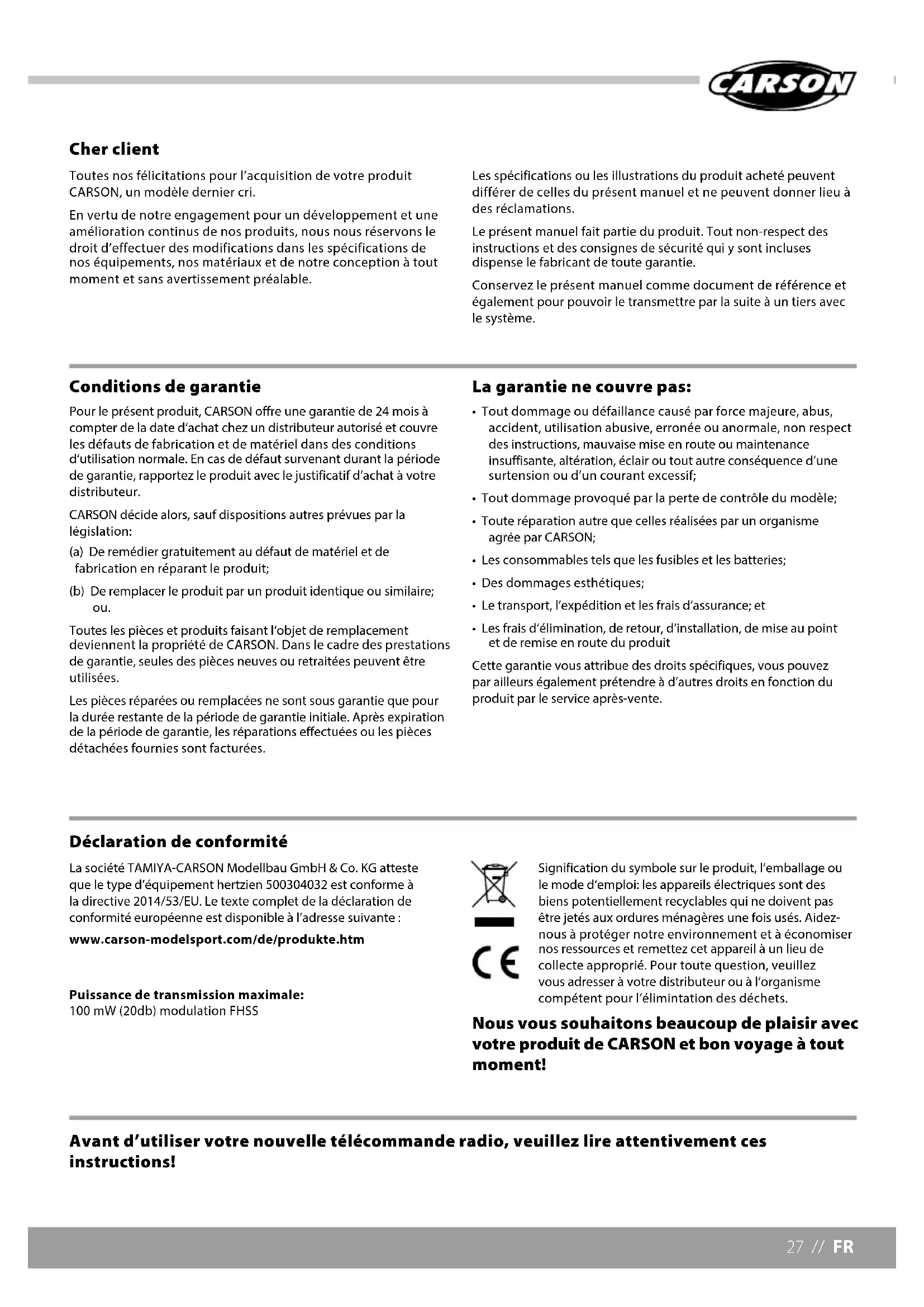 - Les frais d‘élimination, de retour, d’installation, de mise au point et de remise en route du produit Cette garantie vous attribue des droits spécifiques, vous pouvez par ailleurs également prétendre à d’autres droits en fonction du produit par le service après-vente. Avant d’utiliser votre nouvelle télécommande radio, veuillez lire attentivement ces instructions! La société TAMIYA-CARSON Modellbau GmbH & Co. KG atteste que le type d’équipement hertzien 500304032 est conforme à la directive 2014/53/EU. Le texte complet de la déclaration de conformité européenne est disponible à l’adresse suivante : www.carson-modelsport.com/de/produkte.htm Puissance de transmission maximale: 100 mW (20db) modulation FHSS Signification du symbole sur le produit, l’emballage ou le mode d‘emploi: les appareils électriques sont des biens potentiellement recyclables qui ne doivent pas être jetés aux ordures ménagères une fois usés. Aidez- nous à protéger notre environnement et à économiser nos ressources et remettez cet appareil à un lieu de collecte approprié. Pour toute question, veuillez vous adresser à votre distributeur ou à l‘organisme compétent pour l‘élimintation des déchets. Nous vous souhaitons beaucoup de plaisir avec votre produit de CARSON et bon voyage à tout moment! Déclaration de conformitéFR // 28