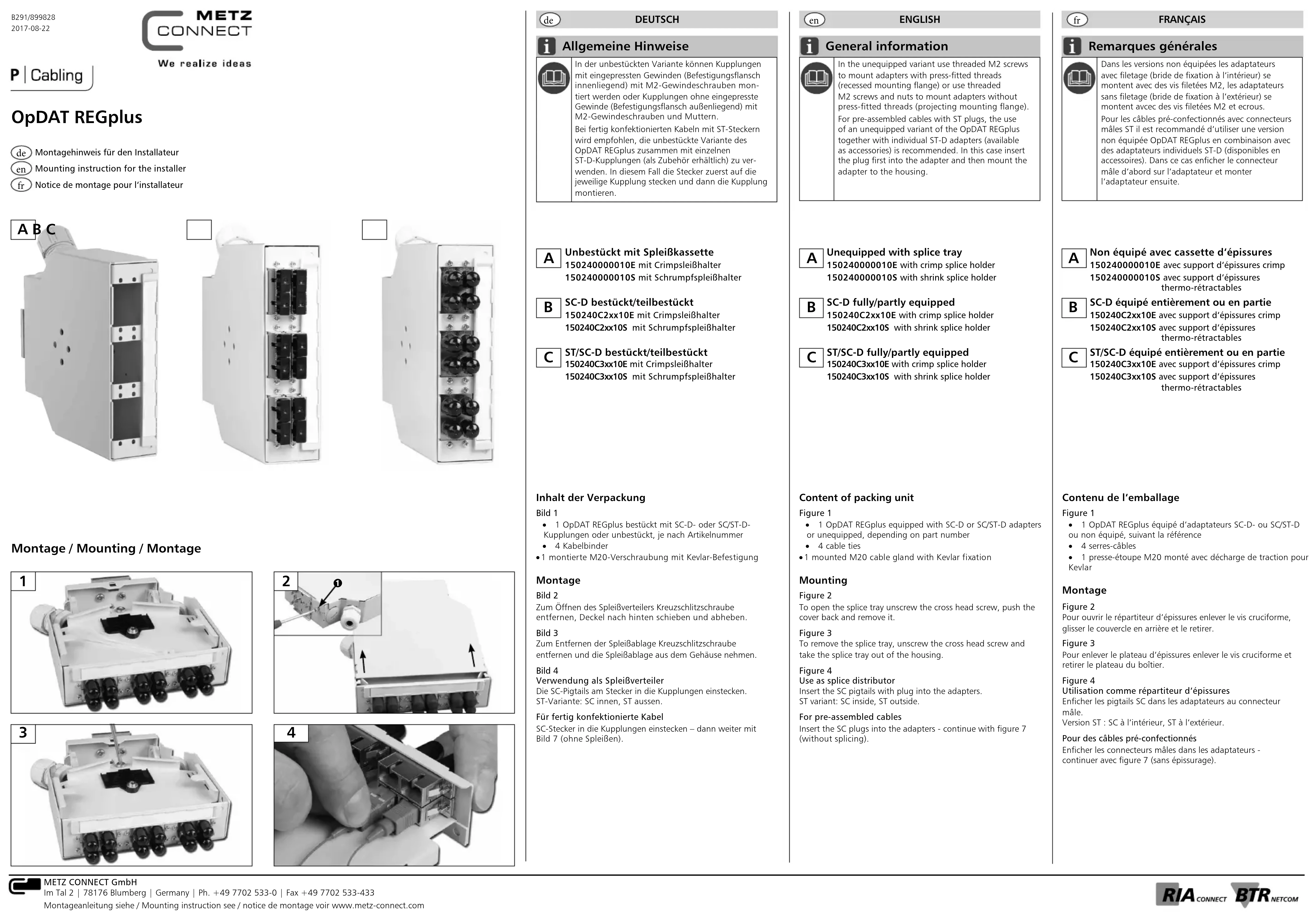 - 1 mounted M20 cable gland with Kevlar fixation Mounting Figure 2To open the splice tray unscrew the cross head screw, push the cover back and remove it. Figure 3To remove the splice tray, unscrew the cross head screw and take the splice tray out of the housing. Figure 4 Use as splice distributorInsert the SC pigtails with plug into the adapters. ST variant: SC inside, ST outside.For pre-assembled cablesInsert the SC plugs into the adapters - continue with figure 7 (without splicing). Contenu de l‘emballage Figure 1 • 1 OpDAT REGplus équipé d‘adaptateurs SC-D- ou SC/ST-D ou non équipé, suivant la référence • 4 serres-câbles • 1 presse-étoupe M20 monté avec décharge de traction pour Kevlar Montage Figure 2Pour ouvrir le répartiteur d‘épissures enlever le vis cruciforme, glisser le couvercle en arrière et le retirer.Figure 3Pour enlever le plateau d‘épissures enlever le vis cruciforme et retirer le plateau du boîtier. Figure 4 Utilisation comme répartiteur d‘épissuresEnficher les pigtails SC dans les adaptateurs au connecteur mâle. Version ST : SC à l‘intérieur, ST à l‘extérieur.Pour des câbles pré-confectionnésEnficher les connecteurs mâles dans les adaptateurs - continuer avec figure 7 (sans épissurage). In der unbestückten Variante können Kupplungen mit eingepressten Gewinden (Befestigungsflansch innenliegend) mit M2-Gewindeschrauben mon-tiert werden oder Kupplungen ohne eingepresste Gewinde (Befestigungsflansch außenliegend) mit M2-Gewindeschrauben und Muttern.Bei fertig konfektionierten Kabeln mit ST-Steckern wird empfohlen, die unbestückte Variante des OpDAT REGplus zusammen mit einzelnen ST-D-Kupplungen (als Zubehör erhältlich) zu ver-wenden. In diesem Fall die Stecker zuerst auf die jeweilige Kupplung stecken und dann die Kupplung montieren. Allgemeine Hinweise Dans les versions non équipées les adaptateurs avec filetage (bride de fixation à l‘intérieur) se montent avec des vis filetées M2, les adaptateurs sans filetage (bride de fixation à l‘extérieur) se montent avcec des vis filetées M2 et ecrous. Pour les câbles pré-confectionnés avec connecteurs mâles ST il est recommandé d‘utiliser une version non équipée OpDAT REGplus en combinaison avec des adaptateurs individuels ST-D (disponibles en accessoires). Dans ce cas enficher le connecteur mâle d‘abord sur l‘adaptateur et monter l‘adaptateur ensuite. Remarques générales DEUTSCH
