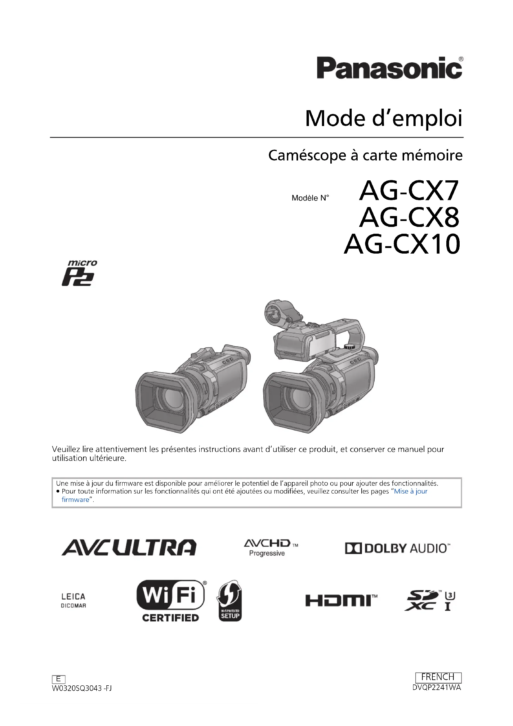 Mode d’emploi Caméscope à carte mémoire Modèle N° AG- CX7 AG- CX8 AG- CX10 Veuillez lire attentivement les présentes instructions avant d’utiliser ce produit, et conserver ce manuel pour utilisation ultérieure. Une mise à jour du firmware est disponible pour améliorer le potentiel de l’appareil photo ou pour ajouter des fonctionnalités. ≥ Pour toute information sur les fonctionnalités qui ont été ajoutées ou modifiées, veuillez consulter les pages “Mise à jour firmware”.