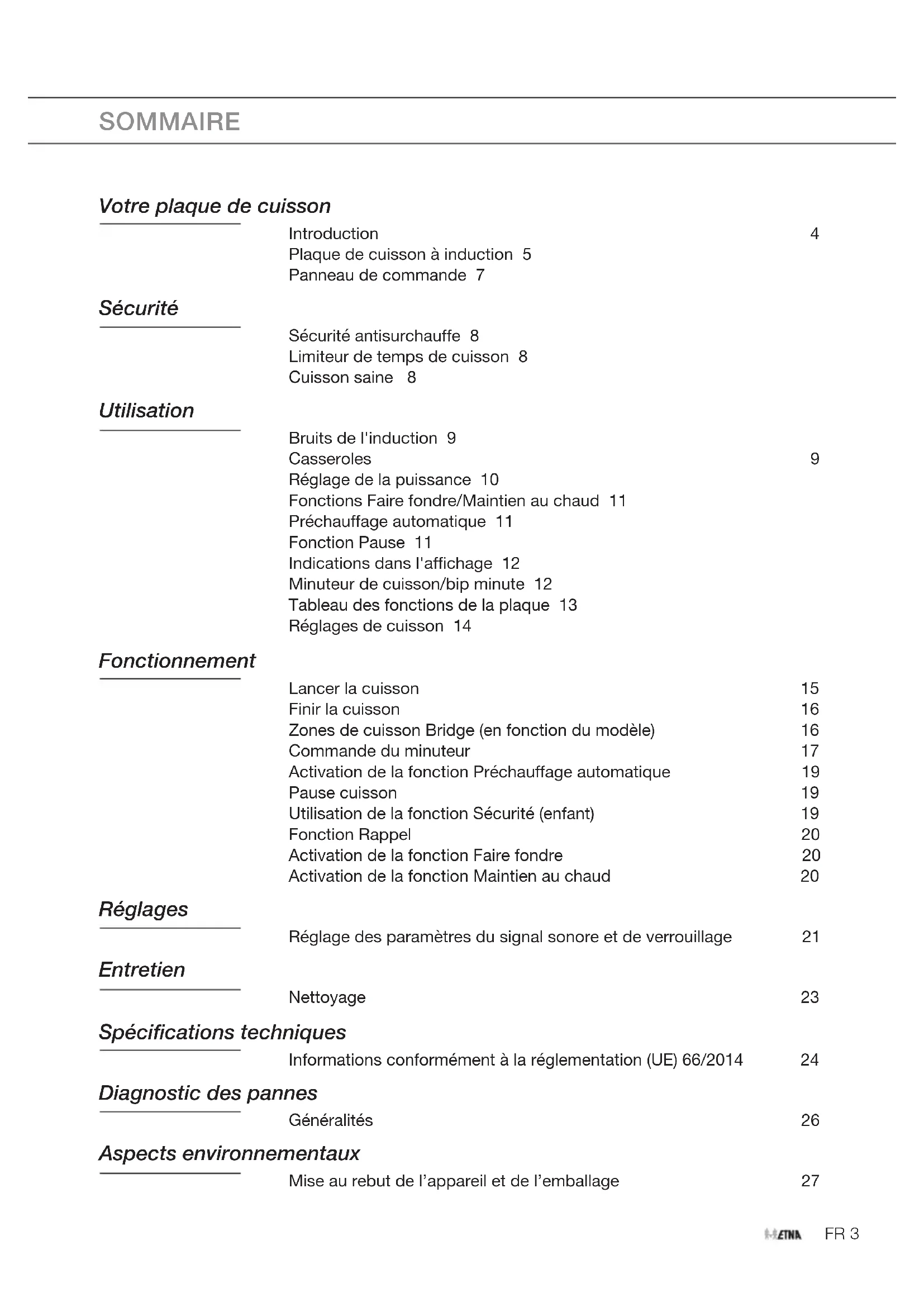 - CFC-free polystyrene (PS hard foam). Dispose of these materials in a responsible manner and in accordance with government regulations. As a reminder of the need to dispose of household appliances separately, the product is marked with the symbol of a crossed-out wheeled dustbin. This means that at the end of its working life, the product must not be disposed of as urban waste. It must be taken to a special local authority differentiated waste collection centre or to a dealer providing this service. Disposing of a household appliance separately avoids possible negative consequences for the environment and health deriving from inappropriate disposal and enables the constituent materials to be recovered to obtain significant savings in energy and resources. Declaration of conformity We declare that our products meet the applicable European Directives, Decisions and Regulations and the requirements listed in the standards referenced.EN 28FR 3 SOMMAIRE Votre plaque de cuisson Introduction 4 Plaque de cuisson à induction 5 Panneau de commande 7 Sécurité Sécurité antisurchauffe 8 Limiteur de temps de cuisson 8 Cuisson saine 8 Utilisation Bruits de l'induction 9 Casseroles 9 Réglage de la puissance 10 Fonctions Faire fondre/Maintien au chaud 11 Préchauffage automatique 11 Fonction Pause 11 Indications dans l'affichage 12 Minuteur de cuisson/bip minute 12 Tableau des fonctions de la plaque 13 Réglages de cuisson 14 Fonctionnement Lancer la cuisson 15 Finir la cuisson 16 Zones de cuisson Bridge (en fonction du modèle) 16 Commande du minuteur 17 Activation de la fonction Préchauffage automatique 19 Pause cuisson 19 Utilisation de la fonction Sécurité (enfant) 19 Fonction Rappel 20 Activation de la fonction Faire fondre 20 Activation de la fonction Maintien au chaud 20 Réglages Réglage des paramètres du signal sonore et de verrouillage 21 Entretien Nettoyage 23 Spécifications techniques Informations conformément à la réglementation (UE) 66/2014 24 Diagnostic des pannes Généralités 26 Aspects environnementaux Mise au rebut de l’appareil et de l’emballage 27FR 4 Introduction Cette plaque de cuisson est destinée aux véritables amateurs de cuisine. Cuire sur une plaque de cuisson à induction présente un certain nombre d’avantages. C’est facile parce que la plaque de cuisson réagit rapidement et aussi parce qu’il est possible de sélectionner des réglages de très faible puissance. Et comme il est de même possible de sélectionner des réglages très puissants, le point d’ébullition des plats est très vite atteint. L’espace généreux entre les zones de cuisson assure un grand confort d’utilisation. La cuisson sur une plaque à induction est différente de celle sur un appareil conventionnel. La cuisson par induction utilise un champ magnétique pour générer de la chaleur. Vous ne pouvez donc pas utiliser n’importe quelle casserole. Le chapitre Casseroles fournit de plus amples informations à ce sujet. Afin d’assurer une sécurité optimale, la plaque de cuisson à induction est équipée de plusieurs dispositifs de sécurité thermique et d'un indicateur de chaleur résiduelle. Ce dernier signale les zones de cuisson qui sont encore chaudes. Ce manuel indique comment utiliser la plaque à induction de façon optimale. En plus des informations relatives au fonctionnement du produit, vous y trouverez des renseignements de base susceptibles d'en faciliter l'utilisation. Il contient également des tableaux de cuisson et des conseils d'entretien. Avant d'utiliser l'appareil, lisez attentivement le manuel et rangez-le en lieu sûr afin de pouvoir le consulter ultérieurement. Le manuel sert également de document de référence pour le service après-vente. Par conséquent, veuillez coller la fiche signalétique de l'appareil dans l'espace prévu à cet effet au verso du manuel. La fiche signalétique de l'appareil contient toutes les informations nécessaires au technicien du service après-vente pour répondre à vos besoins et à vos questions de façon satisfaisante. Les instructions d’installation sont fournies séparément. Nous vous souhaitons bien du plaisir culinaire !