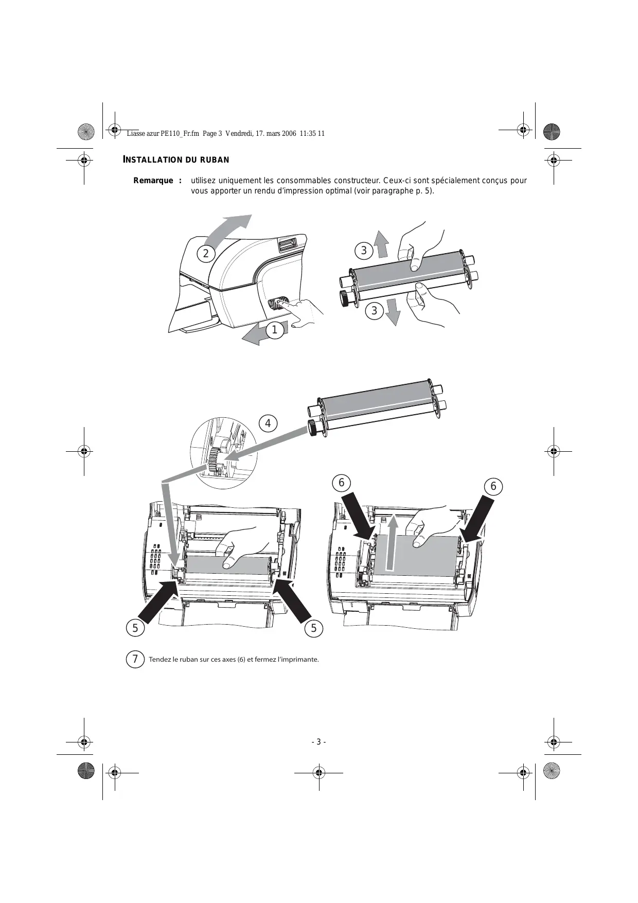 Tendez le ruban sur ces axes (6) et fermez l’imprimante.