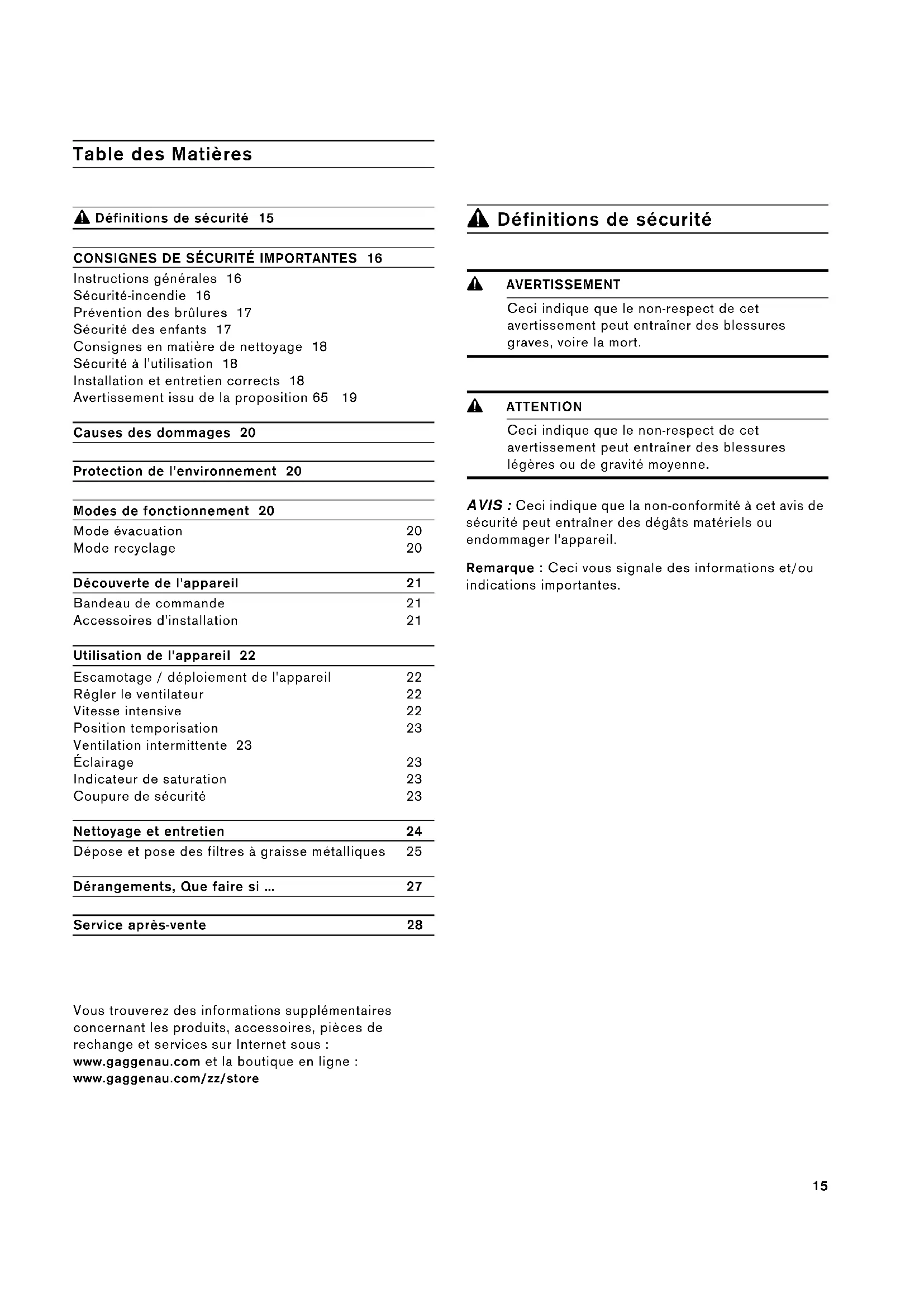 Instructions générales 16 Sécurité-incendie 16 Prévention des brûlures 17 Sécurité des enfants 17 Consignes en matière de nettoyage 18 Sécurité à l'utilisation 18 Installation et entretien corrects 18 Avertissement issu de la proposition 65 19 Causes des dommages 20 Protection de l'environnement 20 Modes de fonctionnement 20 Mode évacuation 20 Mode recyclage 20 Découverte de l'appareil 21 Bandeau de commande 21 Accessoires d'installation 21 Utilisation de l'appareil 22 Escamotage / déploiement de l'appareil 22 Régler le ventilateur 22 Vitesse intensive 22 Position temporisation 23 Ventilation intermittente 23 Éclairage 23 Indicateur de saturation 23 Coupure de sécurité 23 Nettoyage et entretien 24 Dépose et pose des filtres à graisse métalliques 25 Dérangements, Que faire si … 27 Service après-vente 28 Vous trouverez des informations supplémentaires concernant les produits, accessoires, pièces de rechange et services sur Internet sous : www.gaggenau.com et la boutique en ligne : www.gaggenau.com/zz/store 9 Définitions de sécurité Définitions de sécuri t é 9 AVERTISSEMENT Ceci indique que le non-respect de cet avertissement peut entraîner des blessures graves, voire la mort. 9 ATTENTION Ceci indique que le non-respect de cet avertissement peut entraîner des blessures légères ou de gravité moyenne. AVIS : Ceci indique que la non-conformité à cet avis de sécurité peut entraîner des dégâts matériels ou endommager l'appareil. Remarque : Ceci vous signale des informations et/ou indications importantes.9 CONSIGNES DE SÉCURITÉ IMPORTANTES