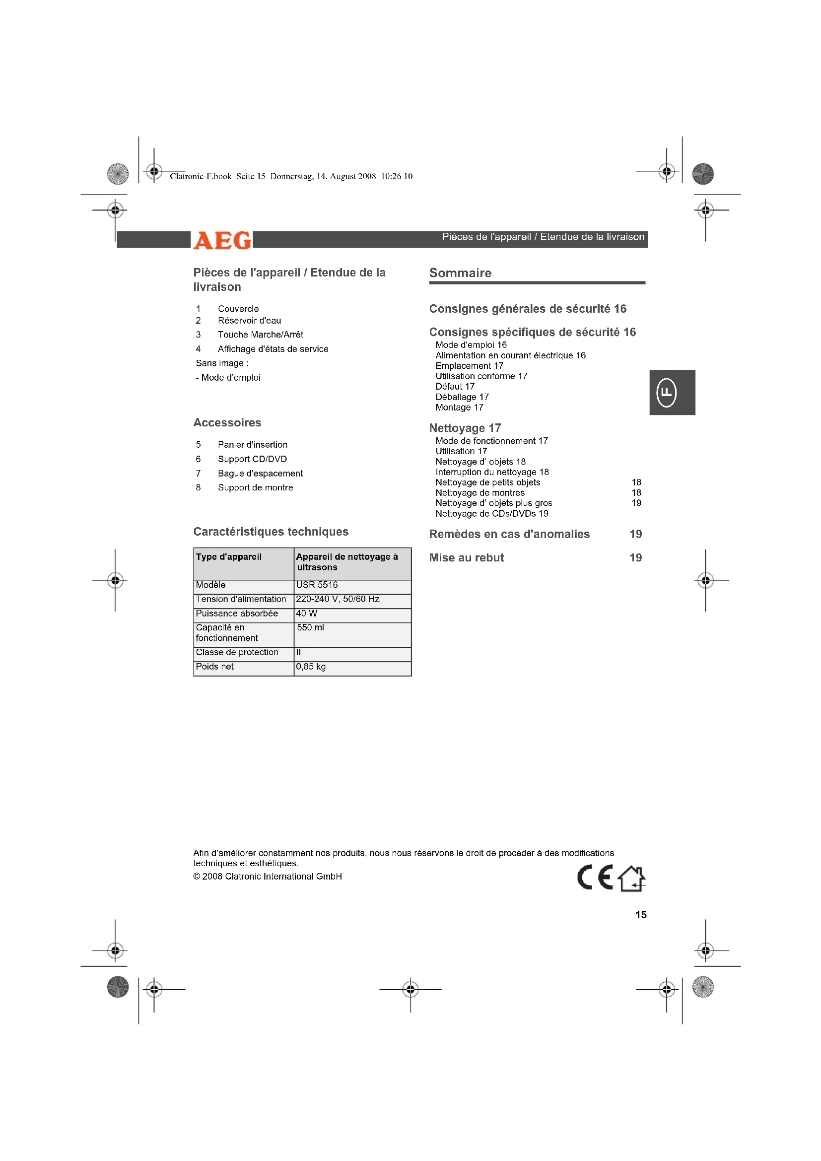 USR 5516 - Nettoyeur à ultrasons AEG - Notice d'utilisation et mode d'emploi gratuit