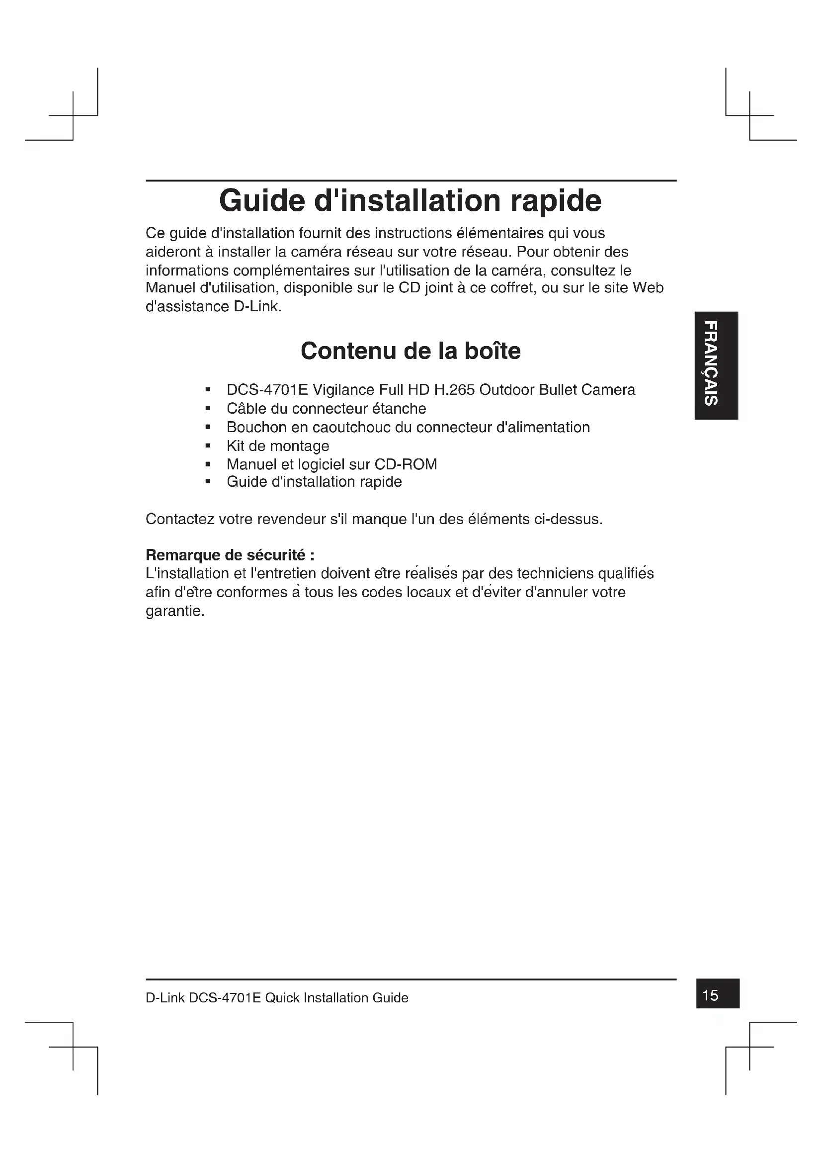 D-Link DCS-4701E Quick Installation Guide FRANÇAIS Guide d'installation rapide Ce guide d'installation fournit des instructions élémentaires qui vous aideront à installer la caméra réseau sur votre réseau. Pour obtenir des informations complémentaires sur l'utilisation de la caméra, consultez le Manuel d'utilisation, disponible sur le CD joint à ce coffret, ou sur le site Web d'assistance D-Link. Contenu de la boîte DCS-4701E Vigilance Full HD H.265 Outdoor Bullet Camera Câble du connecteur étanche Bouchon en caoutchouc du connecteur d'alimentation Kit de montage Manuel et logiciel sur CD-ROM Guide d'installation rapide Contactez votre revendeur s'il manque l'un des éléments ci-dessus. Remarque de sécurité : L'installation et l'entretien doivent etre realises par des techniciens qualifies afin d'etre conformes a tous les codes locaux et d'eviter d'annuler votre garantie.16