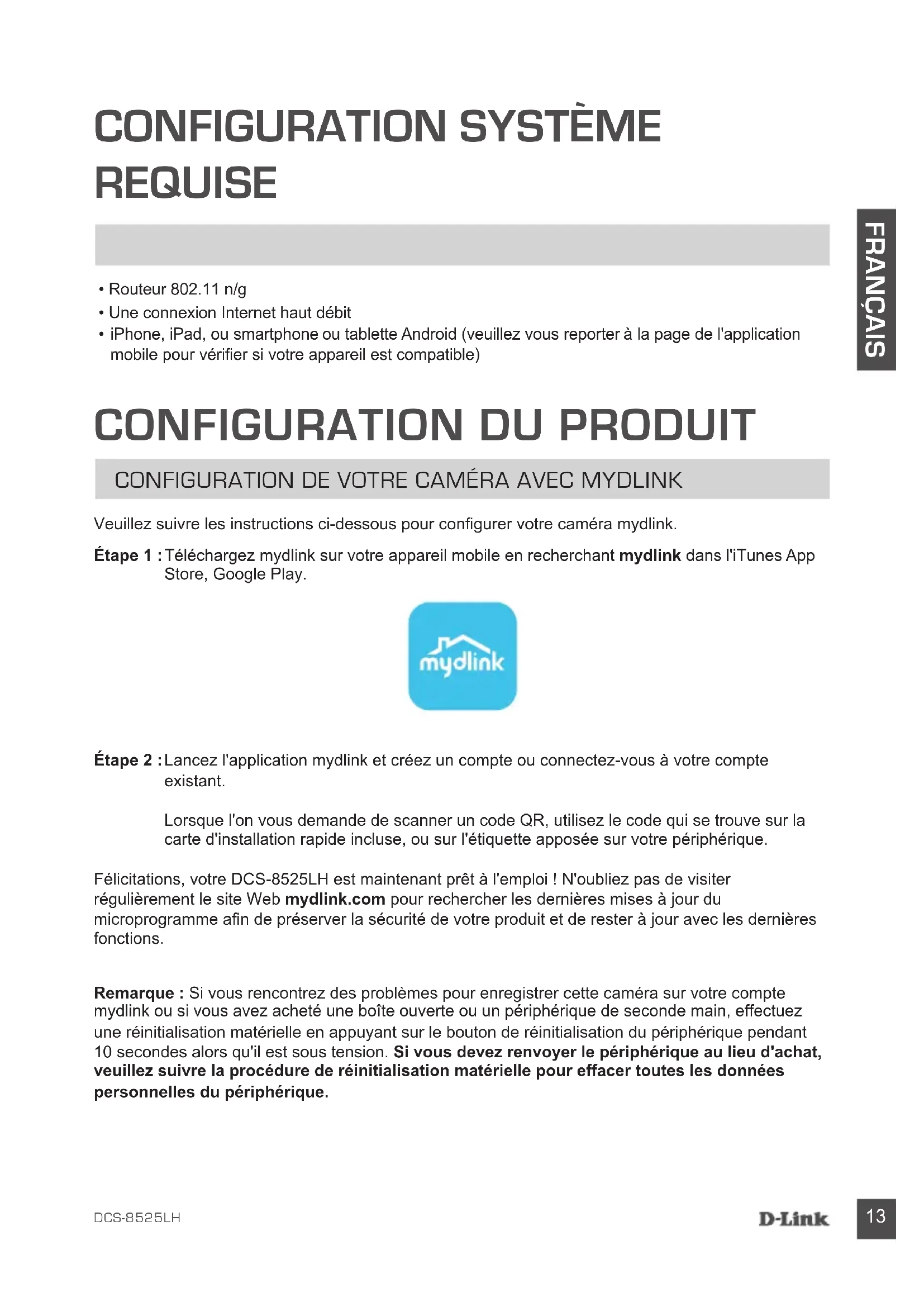 - iPhone, iPad, ou smartphone ou tablette Android (veuillez vous reporter à la page de l'application mobile pour vérier si votre appareil est compatible)Veuillez suivre les instructions ci-dessous pour congurer votre caméra mydlink.Félicitations, votre DCS-8525LH est maintenant prêt à l'emploi ! N'oubliez pas de visiter régulièrement le site Web mydlink.com pour rechercher les dernières mises à jour du microprogramme an de préserver la sécurité de votre produit et de rester à jour avec les dernières fonctions.Remarque : Si vous rencontrez des problèmes pour enregistrer cette caméra sur votre compte mydlink ou si vous avez acheté une boîte ouverte ou un périphérique de seconde main, effectuez une réinitialisation matérielle en appuyant sur le bouton de réinitialisation du périphérique pendant 10 secondes alors qu'il est sous tension. Si vous devez renvoyer le périphérique au lieu d'achat, veuillez suivre la procédure de réinitialisation matérielle pour effacer toutes les données personnelles du périphérique. Étape 1 : Téléchargez mydlink sur votre appareil mobile en recherchant mydlink dans l'iTunes App Store, Google Play. Étape 2 : Lancez l'application mydlink et créez un compte ou connectez-vous à votre compte existant. Lorsque l'on vous demande de scanner un code QR, utilisez le code qui se trouve sur la carte d'installation rapide incluse, ou sur l'étiquette apposée sur votre périphérique.