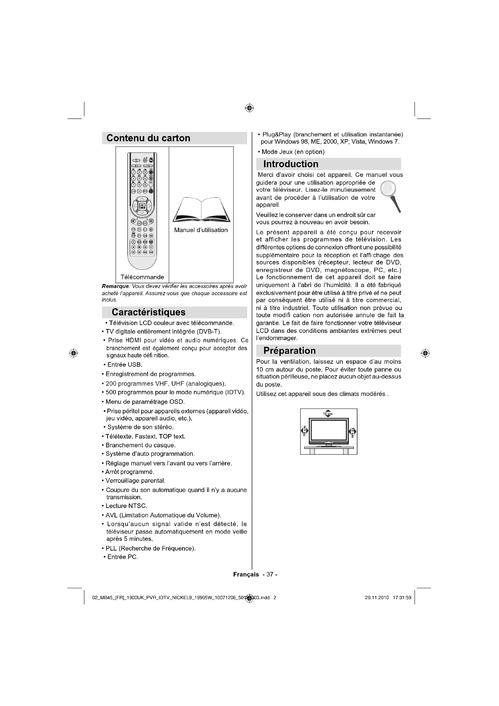 - Mode Jeux (en option) Introduction Merci d’avoir choisi cet appareil. Ce manuel vous guidera pour une utilisation appropriée de votre téléviseur. Lisez-le minutieusement avant de procéder à l’utilisation de votre appareil. Veuillez le conserver dans un endroit sûr car vous pourrez à nouveau en avoir besoin. Le présent appareil a été conçu pour recevoir et afficher les programmes de télévision. Les différentes options de connexion offrent une possibilité supplémentaire pour la réception et l’affi chage des sources disponibles (récepteur, lecteur de DVD, enregistreur de DVD, magnétoscope, PC, etc.) Le fonctionnement de cet appareil doit se faire uniquement à l’abri de l’humidité. Il a été fabriqué exclusivement pour être utilisé à titre privé et ne peut par conséquent être utilisé ni à titre commercial, ni à titre industriel. Toute utilisation non prévue ou toute modifi cation non autorisée annule de fait la garantie. Le fait de faire fonctionner votre téléviseur LCD dans des conditions ambiantes extrêmes peut l’endommager. Préparation Pour la ventilation, laissez un espace d’au moins 10 cm autour du poste. Pour éviter toute panne ou situation périlleuse, ne placez aucun objet au-dessus du poste. Utilisez cet appareil sous des climats modérés . 10 cm 10 cm 10 cm 02_MB45_[FR]_1900UK_PVR_IDTV_NICKEL9_19905W_10071206_50180303.indd 202_MB45_[FR]_1900UK_PVR_IDTV_NICKEL9_19905W_10071206_50180303.indd 2 29.11.2010 17:31:5929.11.2010 17:31:59Français - 38 - Chaleur et fl ammes L’appareil ne doit pas être placé à côté de fl ammes nues ou de sources de chaleur, à l’exemple d’un radiateur. Assurez- vous qu’aucune source de fl amme vive, telles que des bougies allumées, ne soit placée sur le téléviseur. Les piles ne doivent pas être exposées à une chaleur excessive comme le rayonnement solaire ou autre phénomène similaire . Foudre En cas d’orage et de foudre ou lorsque vous partez en vacances, débranchez le cordon d’alimentation de la prise murale . Pièces de rechange Lorsque des pièces de rechange sont requises, assurez-vous que le technicien utilise celles qui ont été préconisées par le fabricant ou celles qui ont les mêmes caractéristiques techniques que les pièces originales. Des substitutions non autorisées peuvent causer un incendie, une décharge électrique ou d’autres risques . Maintenance Veuillez confier toute la maintenance à un technicien qualifi é. Ne retirez pas le couvercle vous-même car ceci peut entraîner une décharge électrique . Mise au rebut Instructions pour la mise au rebut :