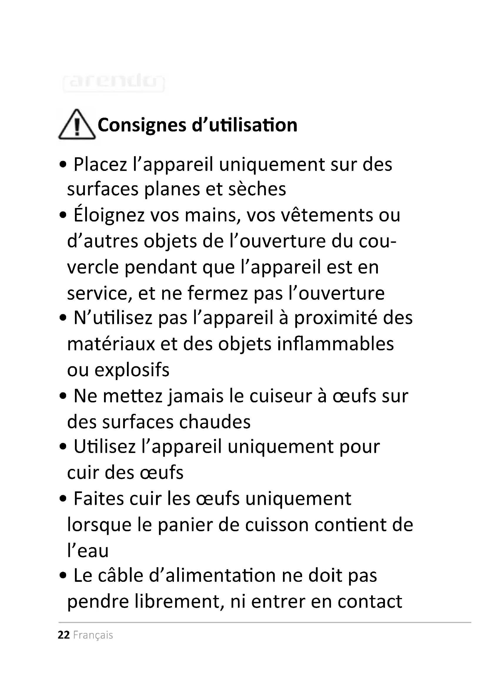 - Ne meez jamais le cuiseur à œufs sur des surfaces chaudes