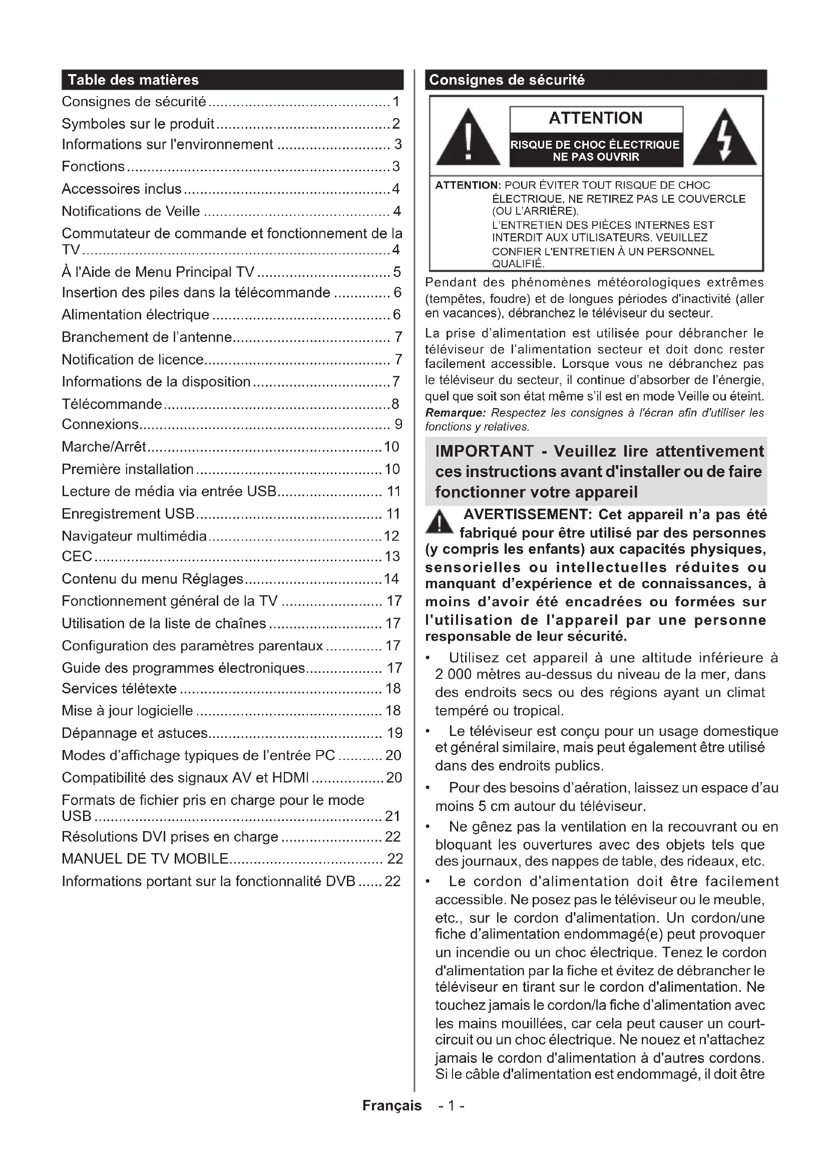 Utilisez cet appareil à une altitude inférieure à 2000 mètres au-dessus du niveau de la mer, dans des endroits secs ou des régions ayant un climat tempéré ou tropical. - Le téléviseur est conçu pour un usage domestique et général similaire, mais peut également être utilisé dans des endroits publics. Pour des besoins d'aération, laissez un espace d'au moins 5 cm adjacent au téléviseur. - Ne gênez pas la ventilation en la recouvrant ou en bloquant les ouvertures avec des objets tels que des journaux, des nappes de table, des rideaux, etc. - Le cordon d'alimentation doit être facilement accessible. Ne posez pas le téléviseur ou le meuble, etc., sur le cordon d'alimentation. Un cordon/une fiche d'alimentation endommagé(e) peut provoquer un incendie ou un choc électrique. Tenez le cordon d'alimentation par la fiche et évitez de débrancher le téléviseur en tirant sur le cordon d'alimentation. Ne touchez jamais le cordon/la fiche d'alimentation avec les mains mouillées, car cela peut causer un court-circuit ou un choc électrique. Ne nouez et n'attachez jamais le cordon d'alimentation à d'autres cordons. Si le câble d'alimentation est endommagé, il doit être