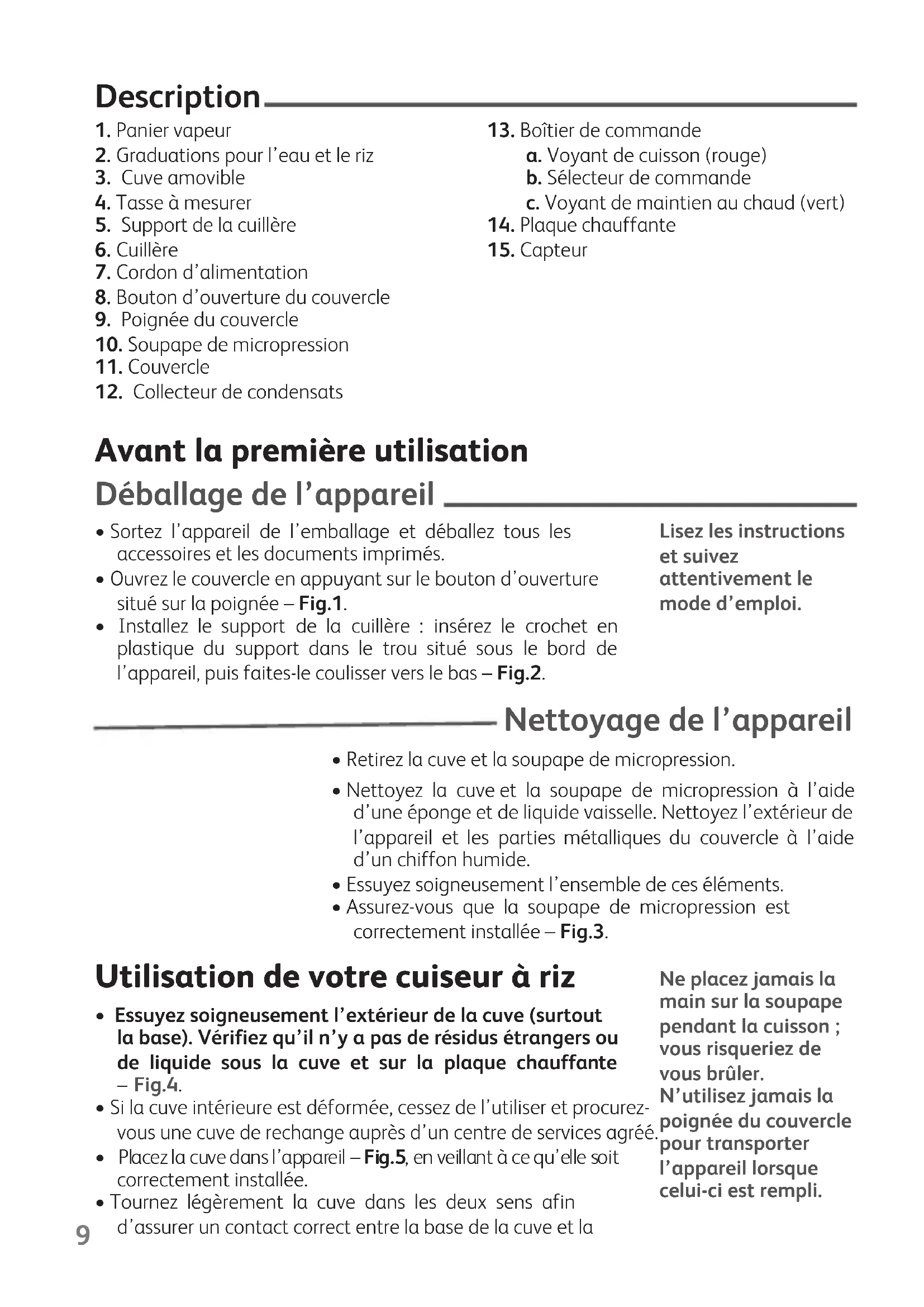 - Tournez légèrement la cuve dans les deux sens afin d’assurer un contact correct entre la base de la cuve et la Ne placez jamais la main sur la soupape pendant la cuisson ; vous risqueriez de vous brûler. N’utilisez jamais la poignée du couvercle pour transporter l’appareil lorsque celui-ci est rempli. Lisez les instructions et suivez attentivement le mode d’emploi. Avant la première utilisation Description