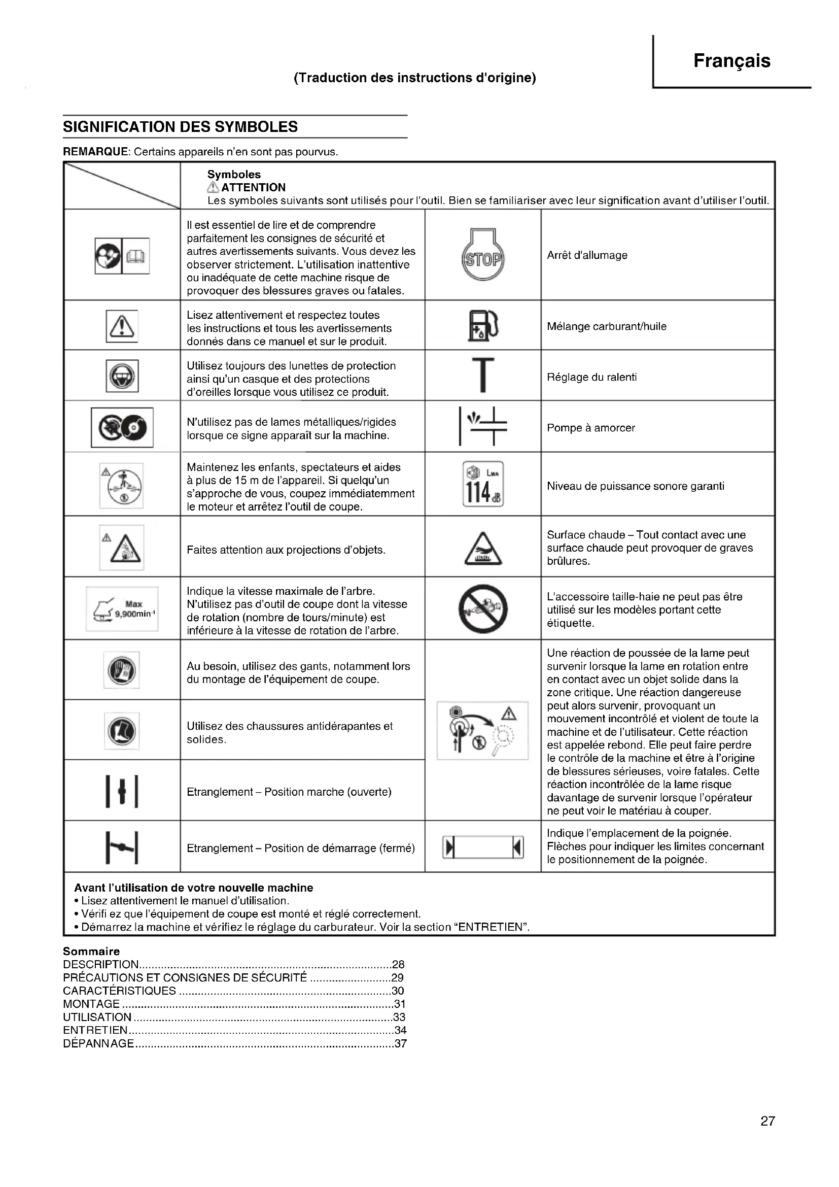 REMARQUE: Certains appareils n’en sont pas pourvus. Symboles ATTENTION Les symboles suivants sont utilisés pour l’outil. Bien se familiariser avec leur signifi cation avant d’utiliser l’outil. Il est essentiel de lire et de comprendre parfaitement les consignes de sécurité et autres avertissements suivants. Vous devez les observer strictement. L’utilisation inattentive ou inadéquate de cette machine risque de provoquer des blessures graves ou fatales. Arrêt d'allumage Lisez attentivement et respectez toutes les instructions et tous les avertissements donnés dans ce manuel et sur le produit. Mélange carburant/huile Utilisez toujours des lunettes de protection ainsi qu’un casque et des protections d’oreilles lorsque vous utilisez ce produit. Réglage du ralenti N’utilisez pas de lames métalliques/rigides lorsque ce signe apparaît sur la machine. Pompe à amorcer Maintenez les enfants, spectateurs et aides à plus de 15 m de l’appareil. Si quelqu’un s’approche de vous, coupez immédiatemment le moteur et arrêtez l’outil de coupe.