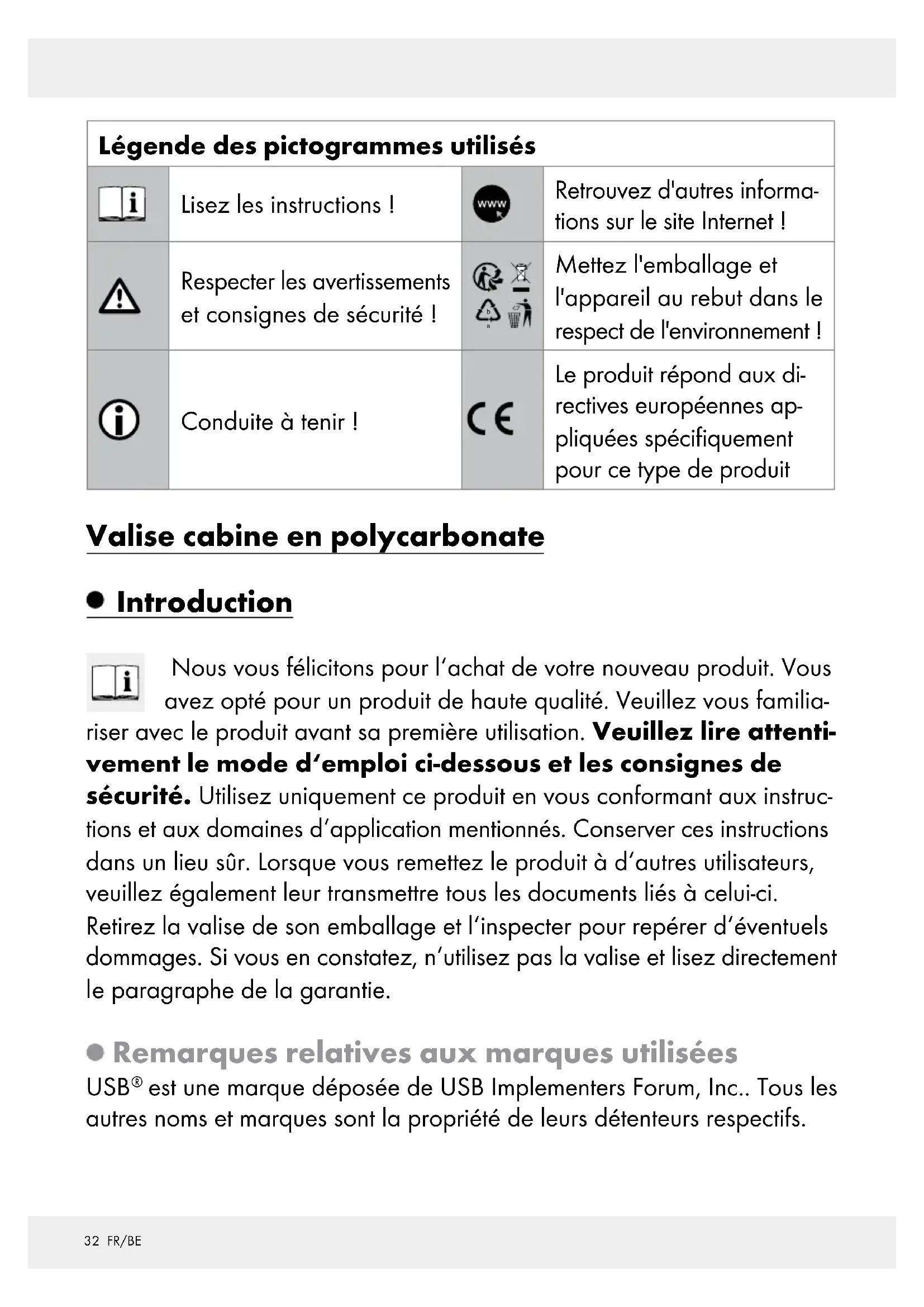 Mettez l'emballage et l'appareil au rebut dans le respect de l'environnement ! Conduite à tenir ! Le produit répond aux di- rectives européennes ap- pliquées spécifiquement pour ce type de produit Valise cabine en polycarbonate Introduction Nous vous félicitons pour l‘achat de votre nouveau produit. Vous avez opté pour un produit de haute qualité. Veuillez vous familia- riser avec le produit avant sa première utilisation. Veuillez lire attenti- vement le mode d‘emploi ci-dessous et les consignes de sécurité. Utilisez uniquement ce produit en vous conformant aux instruc- tions et aux domaines d‘application mentionnés. Conserver ces instructions dans un lieu sûr. Lorsque vous remettez le produit à d‘autres utilisateurs, veuillez également leur transmettre tous les documents liés à celui-ci. Retirez la valise de son emballage et l‘inspecter pour repérer d‘éventuels dommages. Si vous en constatez, n‘utilisez pas la valise et lisez directement