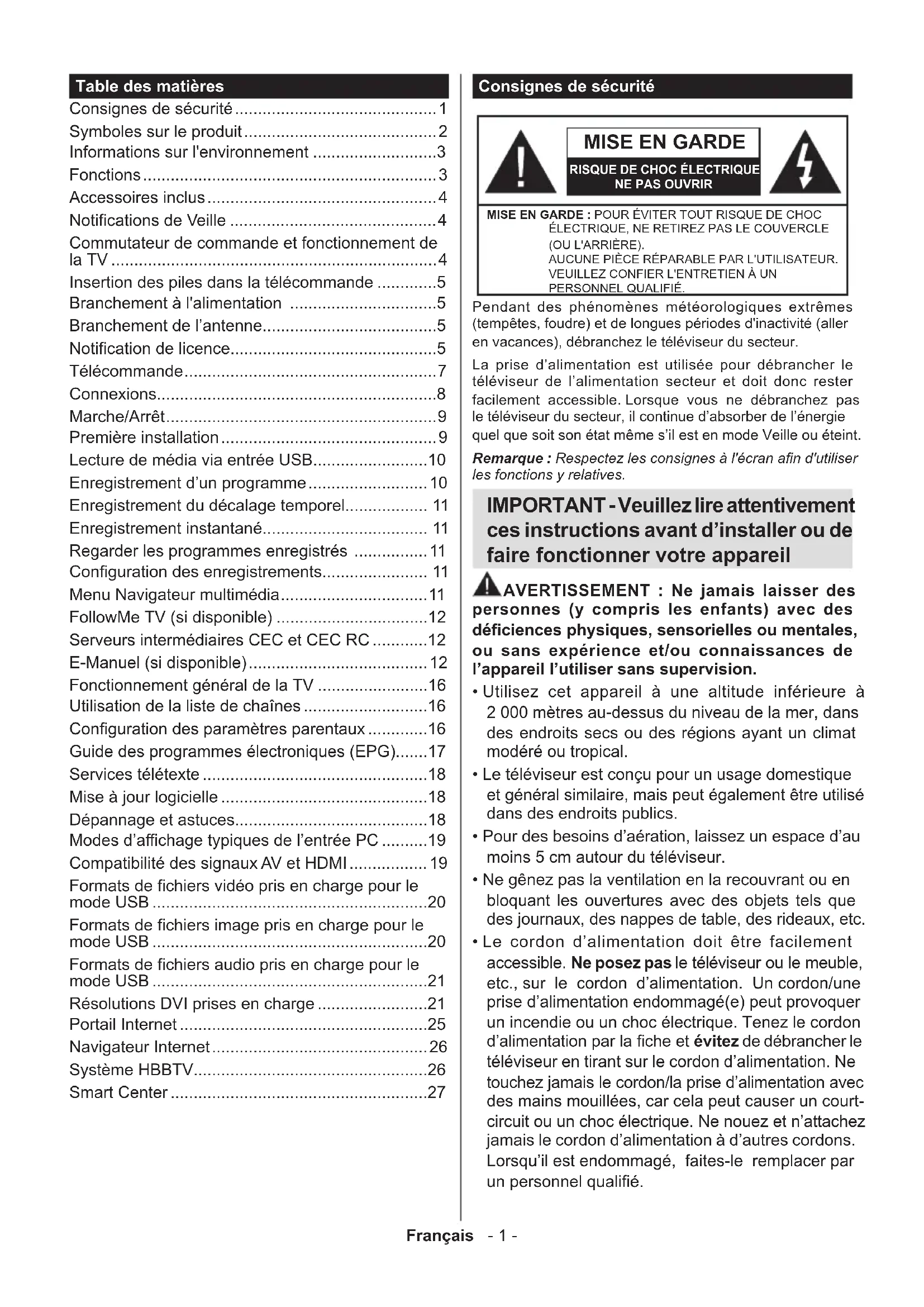 | Réception numérique | Téléviseur avec cable terrerestre numérique entièrement intégré (DVB-T2-C) | Digital Reception | Fully integrated digital terrestrial-cable TV (DVB-T2-C) |