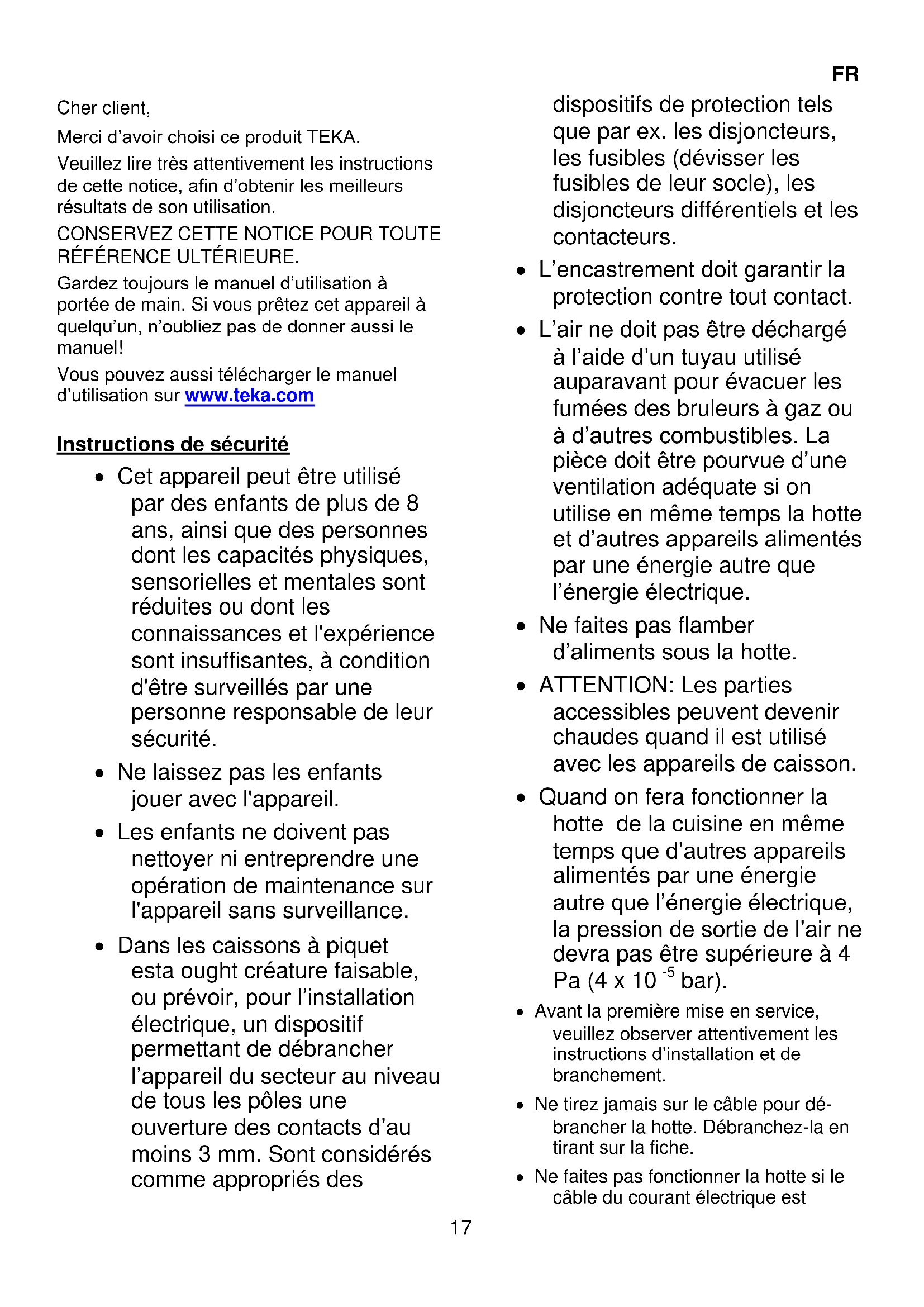 RÉFÉRENCE ULTÉRIEURE. Gardez toujours le manuel d’utilisation à portée de main. Si vous prêtez cet appareil à quelqu’un, n’oubliez pas de donner aussi le manuel! Vous pouvez aussi télécharger le manuel d’utilisation sur www.teka.com Instructions de sécurité Cet appareil peut être utilisé par des enfants de plus de 8 ans, ainsi que des personnes dont les capacités physiques, sensorielles et mentales sont réduites ou dont les connaissances et l'expérience sont insuffisantes, à condition d'être surveillés par une personne responsable de leur sécurité. Ne laissez pas les enfants jouer avec l'appareil. Les enfants ne doivent pas nettoyer ni entreprendre une opération de maintenance sur l'appareil sans surveillance. Dans les caissons à piquet esta ought créature faisable, ou prévoir, pour l’installation électrique, un dispositif permettant de débrancher l’appareil du secteur au niveau de tous les pôles une ouverture des contacts d’au moins 3 mm. Sont considérés comme appropriés des dispositifs de protection tels que par ex. les disjoncteurs, les fusibles (dévisser les fusibles de leur socle), les disjoncteurs différentiels et les contacteurs. L’encastrement doit garantir la protection contre tout contact. L’air ne doit pas être déchargé à l’aide d’un tuyau utilisé auparavant pour évacuer les fumées des bruleurs à gaz ou à d’autres combustibles. La pièce doit être pourvue d’une ventilation adéquate si on utilise en même temps la hotte et d’autres appareils alimentés par une énergie autre que l’énergie électrique. Ne faites pas flamber d’aliments sous la hotte. ATTENTION: Les parties accessibles peuvent devenir chaudes quand il est utilisé avec les appareils de caisson. Quand on fera fonctionner la hotte de la cuisine en même temps que d’autres appareils alimentés par une énergie autre que l’énergie électrique, la pression de sortie de l’air ne devra pas être supérieure à 4 Pa (4 x 10