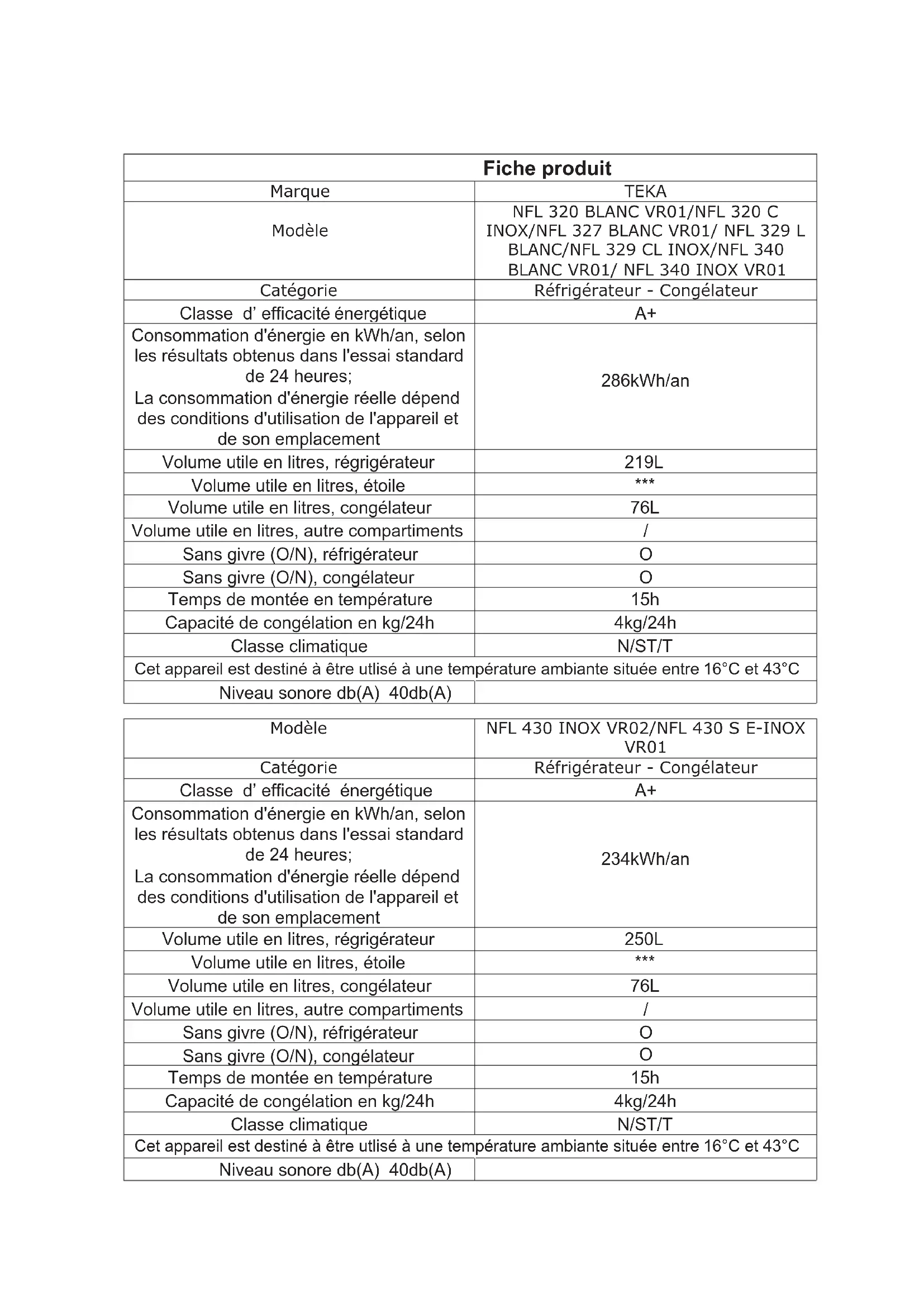 Temps de montée en température 15h Capacité de congélation en kg/24h 4kg/24h Classe climatique N/ST/T Cet appareil est destiné à être utlisé à une température ambiante située entre 16°C et 43°C Niveau sonore db(A) 40db(A)