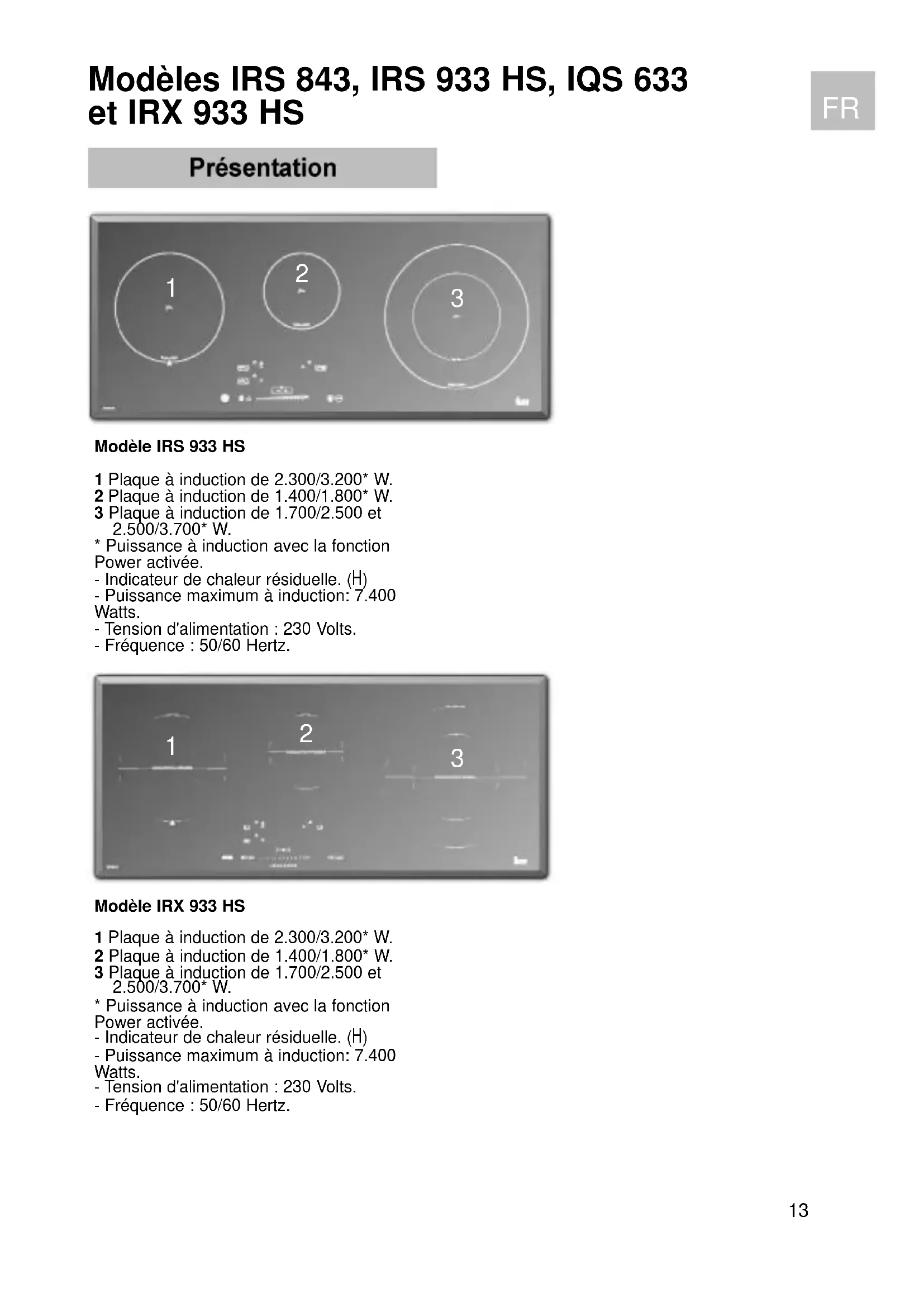 Modèle IRS 933 HS 1 Plaque à induction de 2.300/3.200* W. 2 Plaque à induction de 1.400/1.800* W. 3 Plaque à induction de 1.700/2.500 et 2.500/3.700* W.