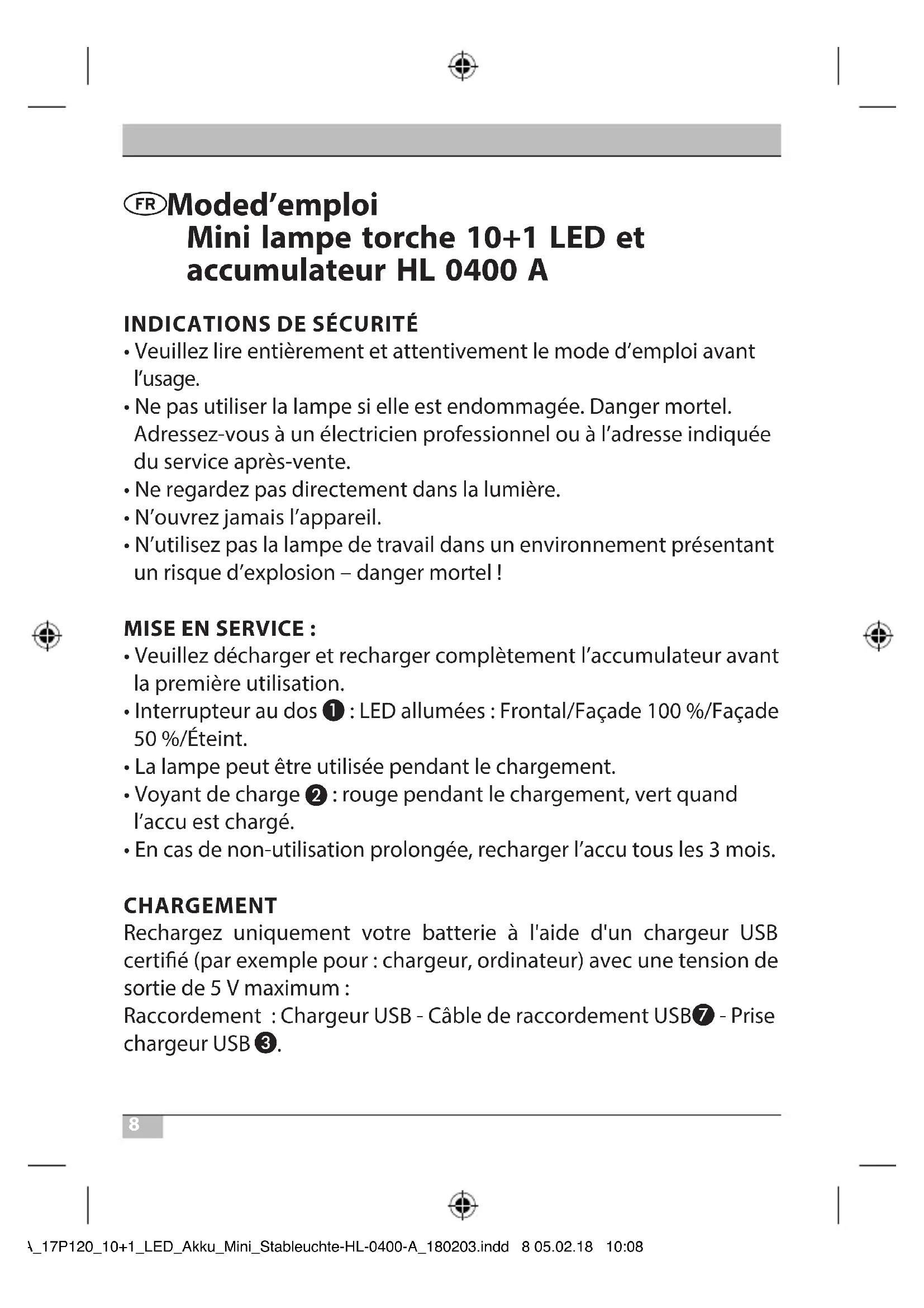 La déclaration de conformité est déposée chez le fabricant. BA_17P120_10+1_LED_Akku_Mini_Stableuchte-HL-0400-A_180203.indd 10 05.02.18 10:0811