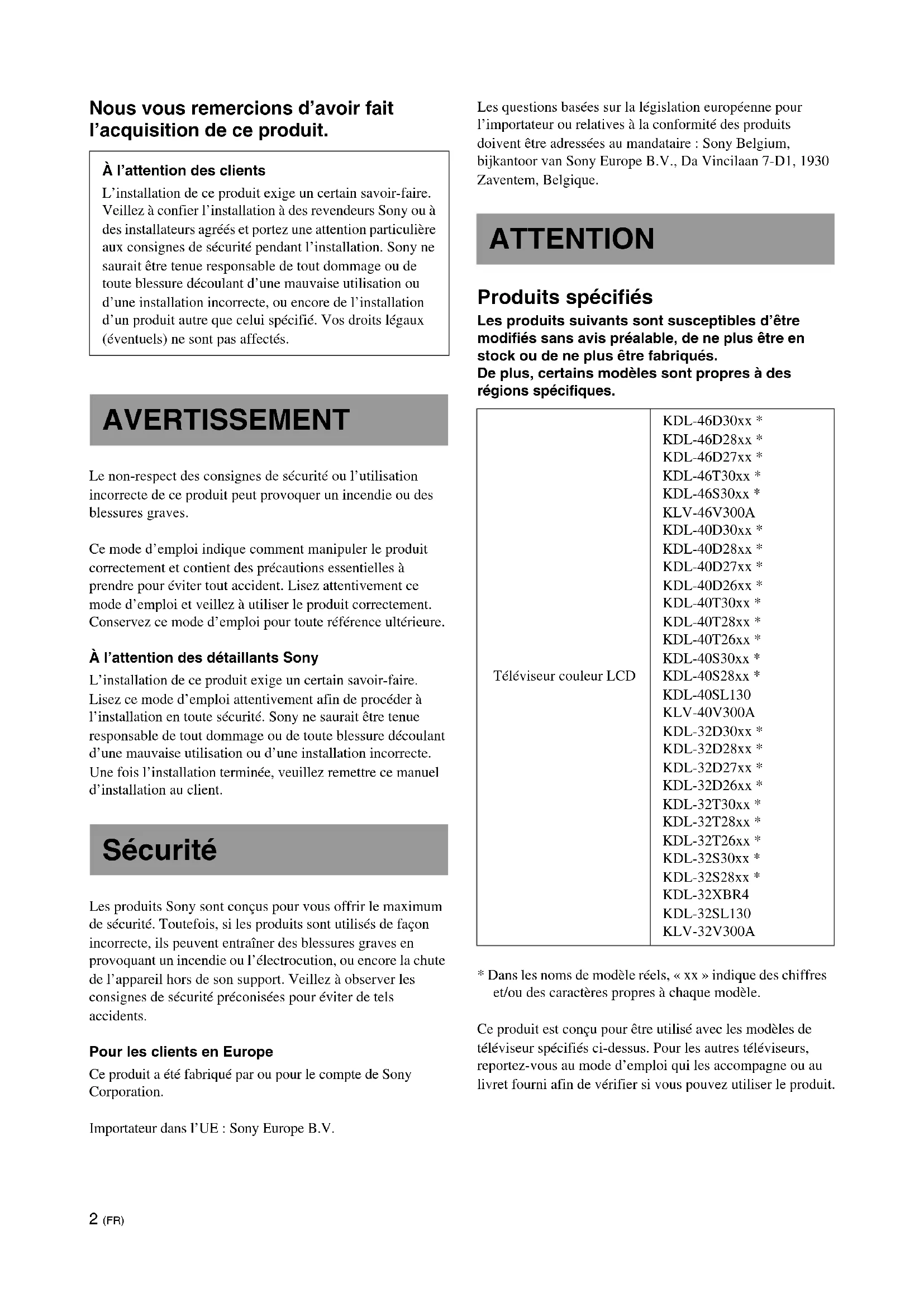 - Hook position “a” cannot be used for the models in the table above. c2 (FR) Nous vous remercions d’avoir fait l’acquisition de ce produit. Le non-respect des consignes de sécurité ou l’utilisation incorrecte de ce produit peut provoquer un incendie ou des blessures graves. Ce mode d’emploi indique comment manipuler le produit correctement et contient des précautions essentielles à prendre pour éviter tout accident. Lisez attentivement ce mode d’emploi et veillez à utiliser le produit correctement. Conservez ce mode d’emploi pour toute référence ultérieure. À l’attention des détaillants Sony L’installation de ce produit exige un certain savoir-faire. Lisez ce mode d’emploi attentivement afin de procéder à l’installation en toute sécurité. Sony ne saurait être tenue responsable de tout dommage ou de toute blessure découlant d’une mauvaise utilisation ou d’une installation incorrecte. Une fois l’installation terminée, veuillez remettre ce manuel d’installation au client. Les produits Sony sont conçus pour vous offrir le maximum de sécurité. Toutefois, si les produits sont utilisés de façon incorrecte, ils peuvent entraîner des blessures graves en provoquant un incendie ou l’électrocution, ou encore la chute de l’appareil hors de son support. Veillez à observer les consignes de sécurité préconisées pour éviter de tels accidents. Pour les clients en Europe Ce produit a été fabriqué par ou pour le compte de Sony Corporation. Importateur dans l’UE : Sony Europe B.V. Les questions basées sur la législation européenne pour l’importateur ou relatives à la conformité des produits doivent être adressées au mandataire : Sony Belgium, bijkantoor van Sony Europe B.V., Da Vincilaan 7-D1, 1930 Zaventem, Belgique. Produits spécifiés Les produits suivants sont susceptibles d’être modifiés sans avis préalable, de ne plus être en stock ou de ne plus être fabriqués. De plus, certains modèles sont propres à des régions spécifiques.