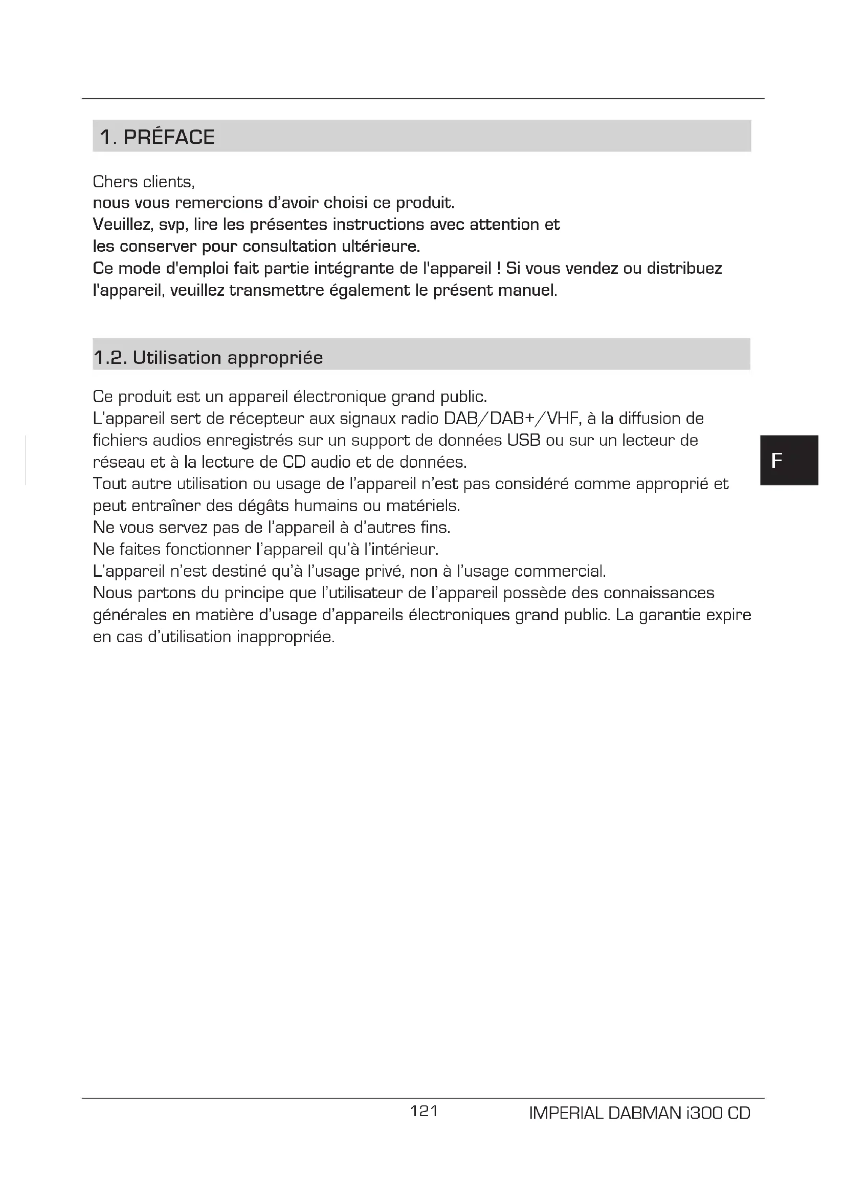 Chers clients, nous vous remercions d’avoir choisi ce produit. Veuillez, svp, lire les présentes instructions avec attention et les conserver pour consultation ultérieure. Ce mode d'emploi fait partie intégrante de l'appareil ! Si vous vendez ou distribuez l'appareil, veuillez transmettre également le présent manuel. 1.2. Utilisation appropriée Ce produit est un appareil électronique grand public. L’appareil sert de récepteur aux signaux radio DAB/DAB+/VHF, à la diffusion de fichiers audios enregistrés sur un support de données USB ou sur un lecteur de réseau et à la lecture de CD audio et de données. Tout autre utilisation ou usage de l’appareil n’est pas considéré comme approprié et peut entraîner des dégâts humains ou matériels. Ne vous servez pas de l’appareil à d’autres fins. Ne faites fonctionner l’appareil qu’à l’intérieur. L’appareil n’est destiné qu’à l’usage privé, non à l’usage commercial. Nous partons du principe que l’utilisateur de l’appareil possède des connaissances générales en matière d’usage d’appareils électroniques grand public. La garantie expire en cas d’utilisation inappropriée.122 Mode d‘emploi