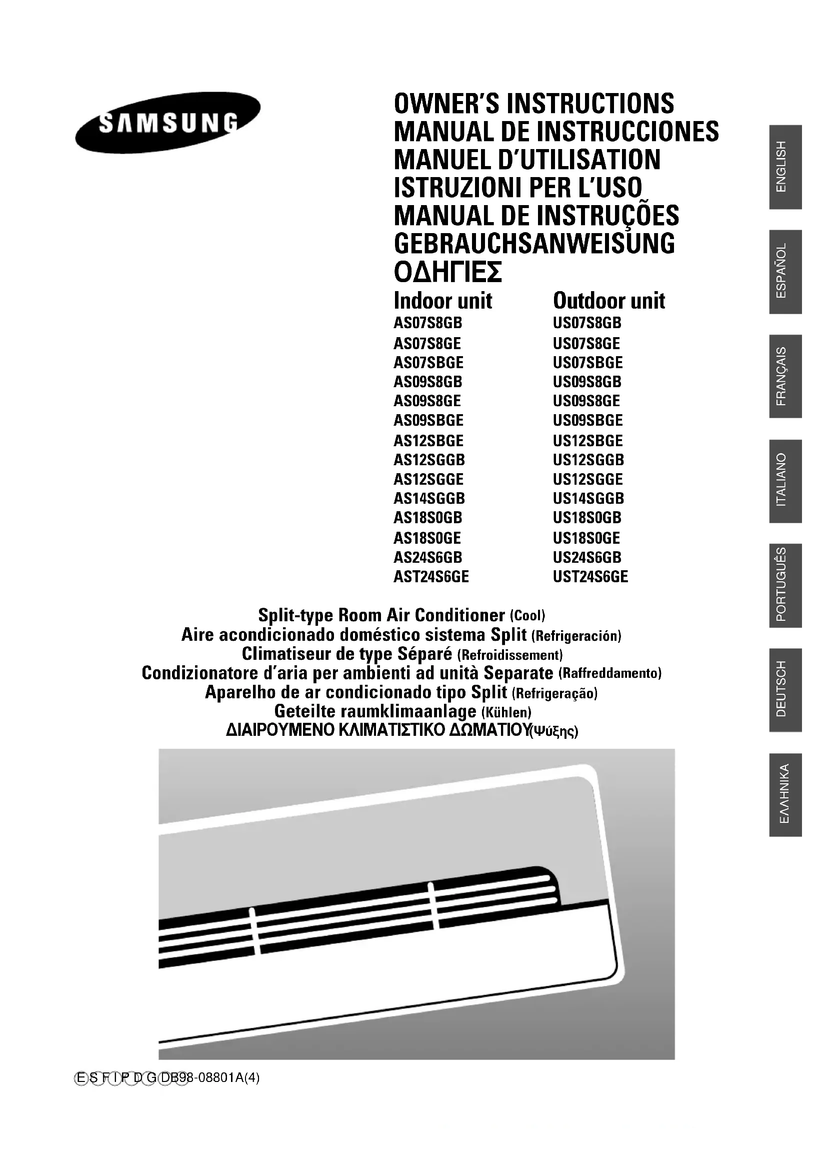 GEBRAUCHSANWEISUNG O¢H°IE™ Split-type Room Air Conditioner (Cool) Aire acondicionado doméstico sistema Split (Refrigeración) Climatiseur de type Séparé (Refroidissement) Condizionatore d’aria per ambienti ad unità Separate (Raffreddamento) Aparelho de ar condicionado tipo Split (Refrigeração) Geteilte raumklimaanlage (Kühlen) ¢IAIPOYMENO K§IMATI™TIKO ¢øMATIOY (æ‡Í˘)ESPAÑOLFRANÇAISITALIANOPORTUGUÊSDEUTSCHE S F I P D G DB98-08801A(4)AS07S8GBAS07S8GEAS07SBGEAS09S8GBAS09S8GEAS09SBGEAS12SBGEAS12SGGBAS12SGGEAS14SGGBAS18S0GBAS18S0GEAS24S6GBAST24S6GE Indoor unit US07S8GBUS07S8GEUS07SBGEUS09S8GBUS09S8GEUS09SBGEUS12SBGEUS12SGGBUS12SGGEUS14SGGBUS18S0GBUS18S0GEUS24S6GBUST24S6GE Outdoor unitF-2 Consignes de Sécurité ◆ Si le fil électrique de ce climatiseur est endommagé, il doit être remplacé par le fabricant ou le personnel de service après-vente autorisé pour éviter un accident. ATTENTION ◆ Ne pas installer le climatiseur par vous même. ◆ Cet appareil ne contient aucune partie que l’utilisateur peuvent manipuler. Toujours consulter le personnel de service après-vente autorisé pour la réparation. ◆ Lors de déménagement, consulter le personnel de service après-vente autorisé pour la déconnexion et l’installation de l’unité. ◆ Ne pas trop s’exposer à l’air froid en restant dans le chemin direct du flux d’air du climatiseur pendant des périodes prolongées. ◆ Ne pas mettre les doigts ou objets dans les grils d’orifice de sortie ou d’entrée. ◆ Ne pas actionner ou arrêter le climatiseur en débranchant le fil électrique et ainsi de suite. ◆ Faire attention à ne pas abîmer le fil électrique. ◆ En cas de dysfonctionnement (odeur de brûlé, etc), arrêter immédiatement le fonctionnement, éteindre le briseur électrique, puis consulter le personnel de service après-vente autorisé. DANGER ◆ Faire la ventilation de temps en temps pendant l’utilisation. ◆ Ne pas diriger la circulation d’air vers les cheminées ou aux appareils de chauffage. ◆ Ne pas monter sur le climatiseur ou mettre des objets là dessus. ◆ Ne pas suspender d’objets à l’unité intérieure. ◆ Ne pas mettre de vase de fleurs ou de contenant d’eau sur le climatiseur. ◆ Ne pas exposer directement le climatiseur à l’eau. ◆ Ne pas toucher la prise électrique avec les mains mouillées. ◆ Ne pas éteindre le climatiseur en tirant le fil électrique. ◆ Débrancher l’appareil lorsque vous ne l’utilisez pas pendant longtemps. ◆ Ne pas mettre d’animaux ou de plantes dans le chemin direct de la circulation d’air. ◆ Ne pas boire d’eau écoulée du climatiseur. ◆ Ne pas utiliser l’appareil comme l’endroit de stockage de la nourriture, des plantes ou des animaux, de l’équipement de précision, ou des oeuvres d’art. ◆ Ne pas bloquer ou couvre les grils de sortie et d’entrée qui sont en service. ◆ Ne pas utiliser de gaz inflammables près du climatiseur. ◆ Si la corde d’alimentation est endommagée, elle doit être immédiatement remplacée par un technicien agréé. (Pour l’Europe) ◆ Avant de jeter le dispositif, il est nécessaire de retirer les cellules de batterie et de s’en débarrasser en toute sécurité. AVERTISSEMENTSF-3 FRANÇAIS Sommaire
