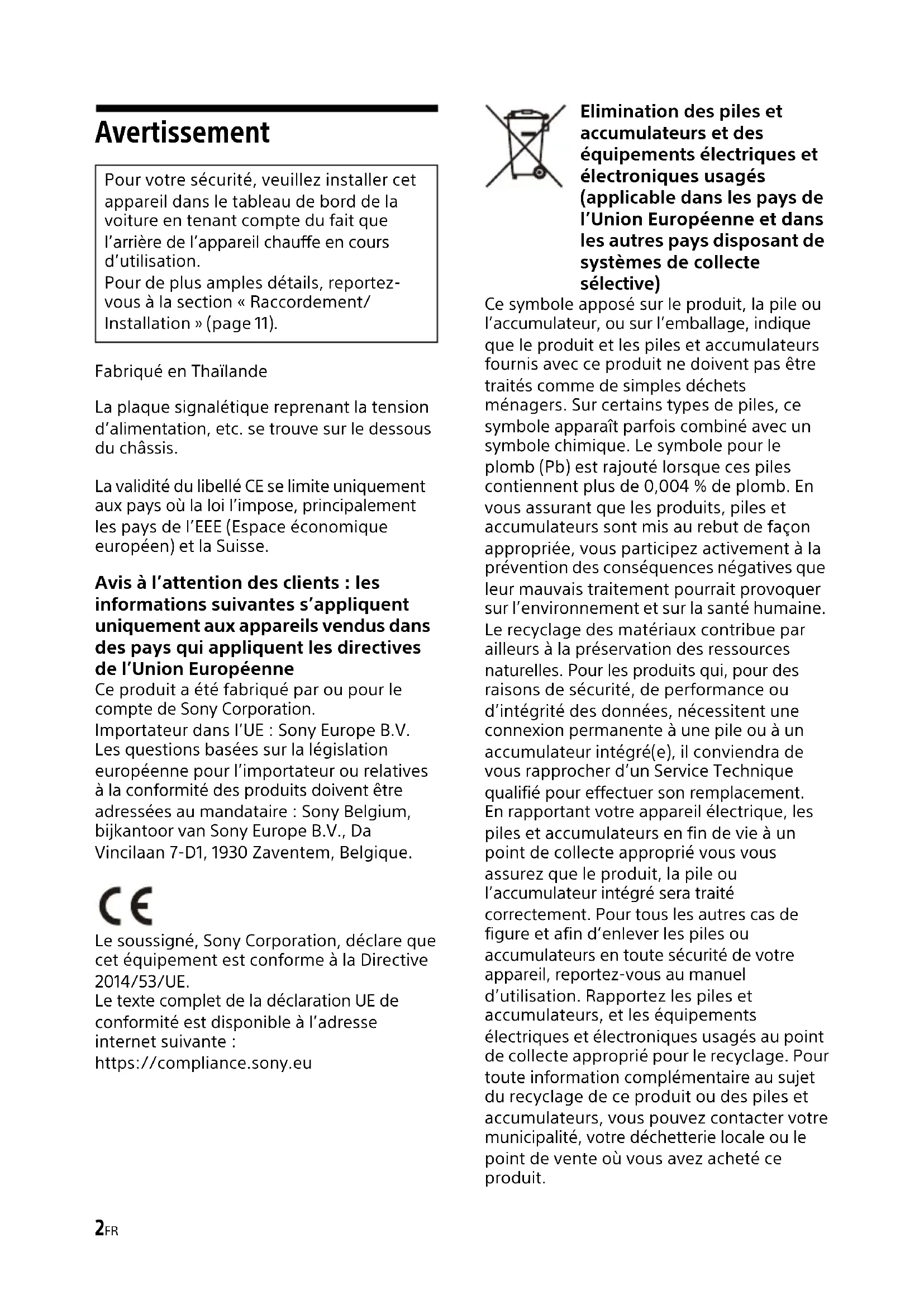 15GB For details, see “Detaching the Front Panel” (page 5). For details, see “Resetting the Unit” (page 6). When replacing the fuse, be sure to use one matching the amperage rating stated on the original fuse. If the fuse blows, check the power connection and replace the fuse. If the fuse blows again after replacement, there may be an internal malfunction. In such a case, consult your nearest Sony dealer. Detaching and attaching the front panel Resetting the unit Fuse replacement Fuse (10 A)2FR Avertissement Fabriqué en Thaïlande La plaque signalétique reprenant la tension d’alimentation, etc. se trouve sur le dessous du châssis. La validité du libellé CE se limite uniquement aux pays où la loi l’impose, principalement les pays de l’EEE (Espace économique européen) et la Suisse. Avis à l’attention des clients : les informations suivantes s’appliquent uniquement aux appareils vendus dans des pays qui appliquent les directives de l’Union Européenne Ce produit a été fabriqué par ou pour le compte de Sony Corporation. Importateur dans l’UE : Sony Europe B.V. Les questions basées sur la législation européenne pour l’importateur ou relatives à la conformité des produits doivent être adressées au mandataire : Sony Belgium, bijkantoor van Sony Europe B.V., Da Vincilaan 7-D1, 1930 Zaventem, Belgique. Le soussigné, Sony Corporation, déclare que cet équipement est conforme à la Directive 2014/53/UE. Le texte complet de la déclaration UE de conformité est disponible à l’adresse internet suivante : https://compliance.sony.eu Elimination des piles et accumulateurs et des équipements électriques et électroniques usagés (applicable dans les pays de l’Union Européenne et dans les autres pays disposant de systèmes de collecte sélective) Ce symbole apposé sur le produit, la pile ou l’accumulateur, ou sur l’emballage, indique que le produit et les piles et accumulateurs fournis avec ce produit ne doivent pas être traités comme de simples déchets ménagers. Sur certains types de piles, ce symbole apparaît parfois combiné avec un symbole chimique. Le symbole pour le plomb (Pb) est rajouté lorsque ces piles contiennent plus de 0,004 % de plomb. En vous assurant que les produits, piles et accumulateurs sont mis au rebut de façon appropriée, vous participez activement à la prévention des conséquences négatives que leur mauvais traitement pourrait provoquer sur l’environnement et sur la santé humaine. Le recyclage des matériaux contribue par ailleurs à la préservation des ressources naturelles. Pour les produits qui, pour des raisons de sécurité, de performance ou d’intégrité des données, nécessitent une connexion permanente à une pile ou à un accumulateur intégré(e), il conviendra de vous rapprocher d’un Service Technique qualifié pour effectuer son remplacement. En rapportant votre appareil électrique, les piles et accumulateurs en fin de vie à un point de collecte approprié vous vous assurez que le produit, la pile ou l’accumulateur intégré sera traité correctement. Pour tous les autres cas de figure et afin d’enlever les piles ou accumulateurs en toute sécurité de votre appareil, reportez-vous au manuel d’utilisation. Rapportez les piles et accumulateurs, et les équipements électriques et électroniques usagés au point de collecte approprié pour le recyclage. Pour toute information complémentaire au sujet du recyclage de ce produit ou des piles et accumulateurs, vous pouvez contacter votre municipalité, votre déchetterie locale ou le point de vente où vous avez acheté ce produit. Pour votre sécurité, veuillez installer cet appareil dans le tableau de bord de la voiture en tenant compte du fait que l’arrière de l’appareil chauffe en cours d’utilisation. Pour de plus amples détails, reportez- vous à la section « Raccordement/ Installation » (page 11).3FR Avis d’exclusion de responsabilité relatif aux services proposés par des tiers Les services proposés par des tiers peuvent être modifiés, suspendus ou clôturés sans avis préalable. Sony n’assume aucune responsabilité dans ce genre de situation. Attention SONY NE PEUT ÊTRE, EN AUCUN CAS, TENU