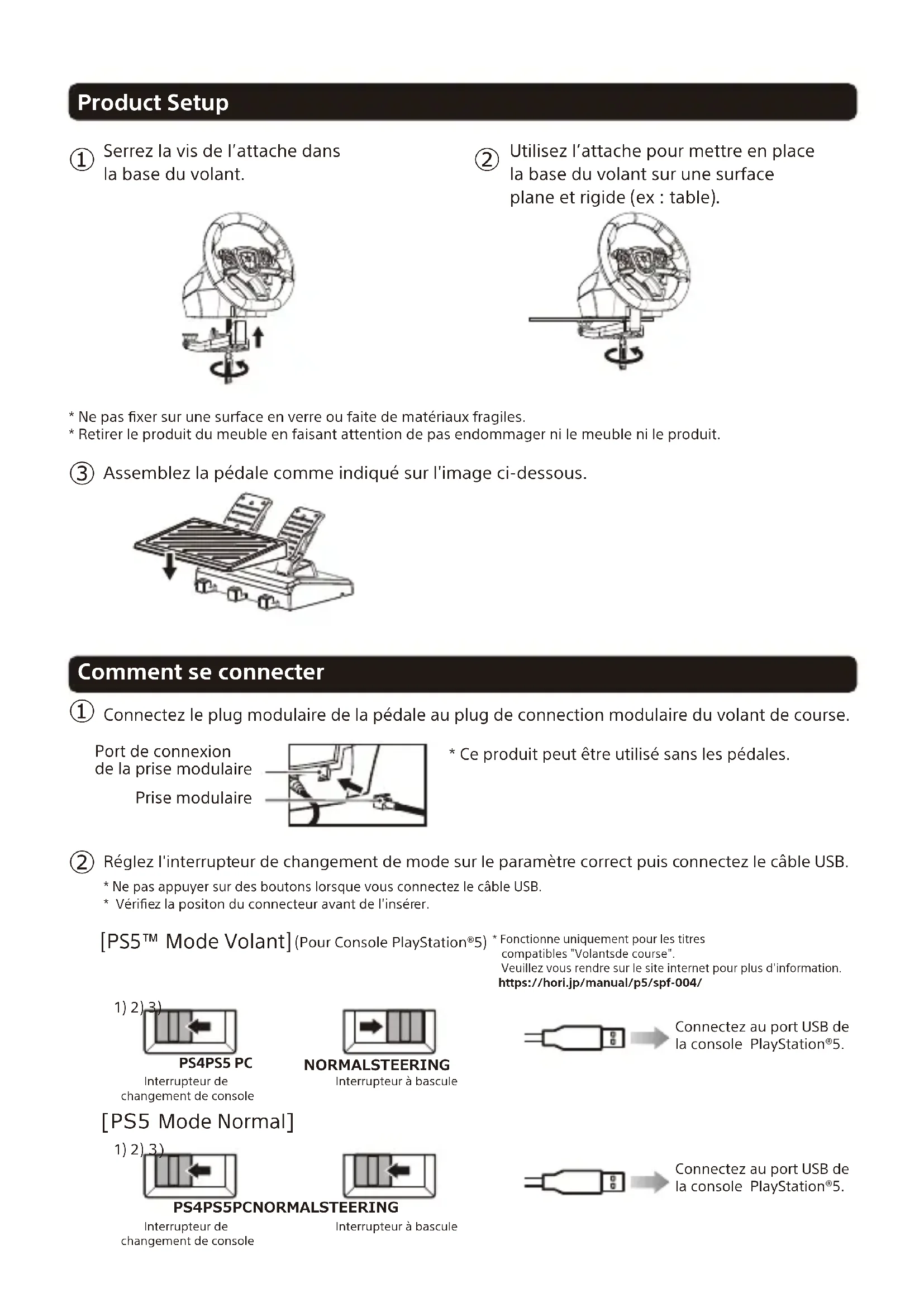 - Ne pas fixer sur une surface en verre ou faite de matériaux fragiles.* Retirer le produit du meuble en faisant attention de pas endommager ni le meuble ni le produit. Comment se connecter [PS5™ Mode Volant] (Pour Console PlayStation®5)Connectez au port USB de la console PlayStation®5.1) 2) 3)Interrupteur de changement de consolePS4PS5 PCInterrupteur à basculeNORMAL STEERINGConnectez au port USB de la console PlayStation®5.Interrupteur de changement de console [PS5 Mode Normal] Interrupteur à bascule1) 2) 3)PS4PS5 PC NORMAL STEERINGPrise modulaire* Ce produit peut être utilisé sans les pédales.