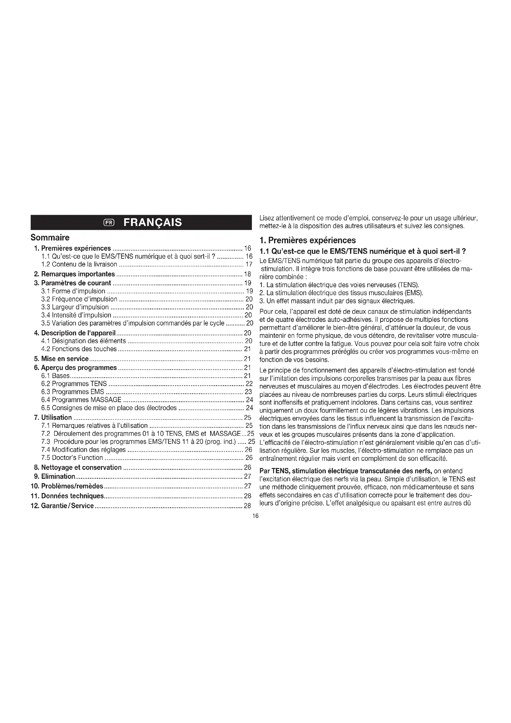 Mode d’emploi Appareil EMS/TENS numérique .................................16