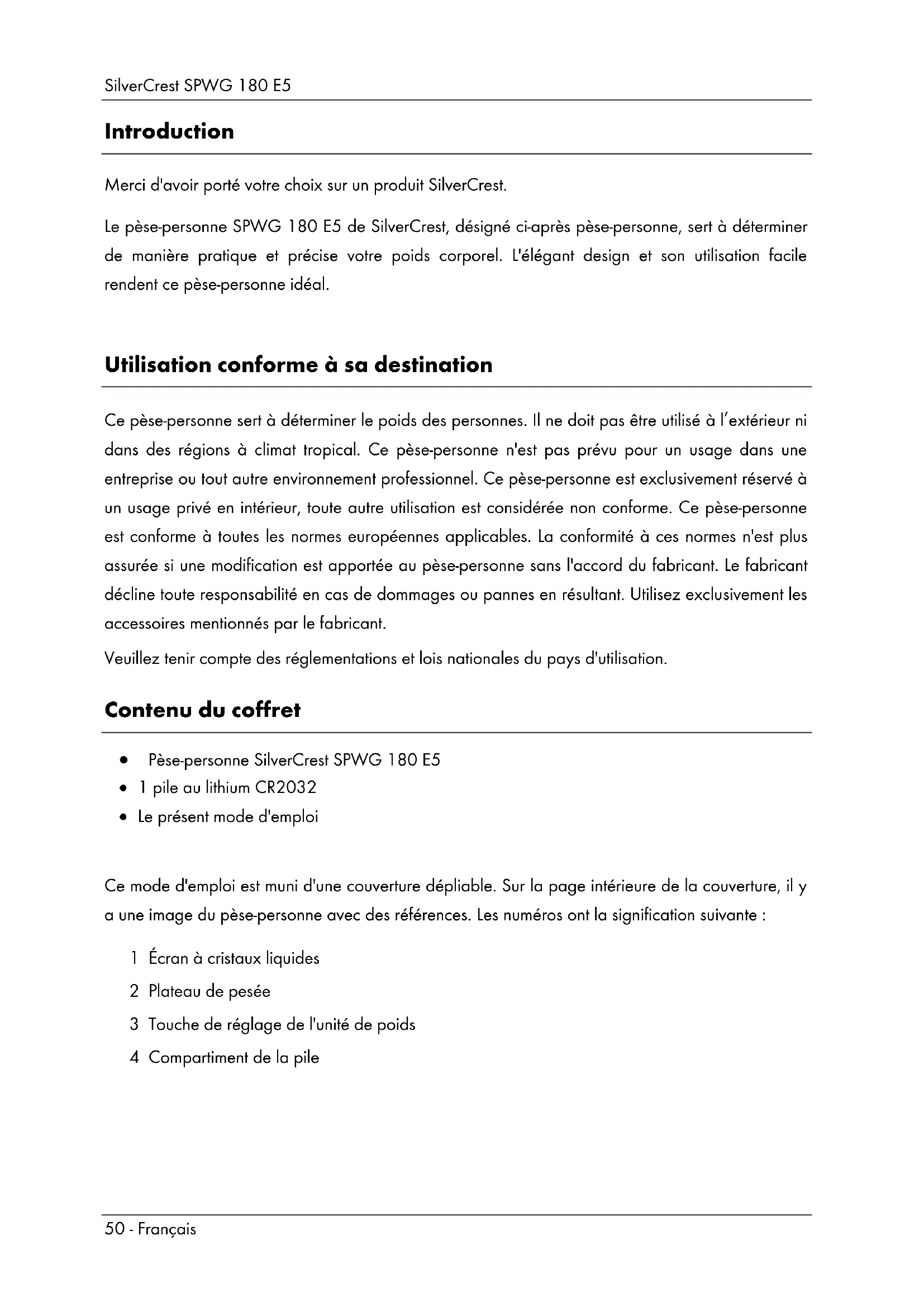 Introduction Merci d'avoir porté votre choix sur un produit SilverCrest. Le pèse-personne SPWG 180 E5 de SilverCrest, désigné ci-après pèse-personne, sert à déterminer de manière pratique et précise votre poids corporel. L'élégant design et son utilisation facile rendent ce pèse-personne idéal. Utilisation conforme à sa destination Ce pèse-personne sert à déterminer le poids des personnes. Il ne doit pas être utilisé à l’extérieur ni dans des régions à climat tropical. Ce pèse-personne n'est pas prévu pour un usage dans une entreprise ou tout autre environnement professionnel. Ce pèse-personne est exclusivement réservé à un usage privé en intérieur, toute autre utilisation est considérée non conforme. Ce pèse-personne est conforme à toutes les normes européennes applicables. La conformité à ces normes n'est plus assurée si une modification est apportée au pèse-personne sans l'accord du fabricant. Le fabricant décline toute responsabilité en cas de dommages ou pannes en résultant. Utilisez exclusivement les accessoires mentionnés par le fabricant. Veuillez tenir compte des réglementations et lois nationales du pays d'utilisation. Contenu du coffret Pèse-personne SilverCrest SPWG 180 E5 1 pile au lithium CR2032 Le présent mode d'emploi Ce mode d'emploi est muni d'une couverture dépliable. Sur la page intérieure de la couverture, il y a une image du pèse-personne avec des références. Les numéros ont la signification suivante : 1 Écran à cristaux liquides 2 Plateau de pesée 3 Touche de réglage de l'unité de poids 4 Compartiment de la pileSilverCrest SPWG 180 E5 Français - 51 Caractéristiques techniques Tension de service : 3 V Pile : 1 pile 3 V au lithium CR2032 Durée de vie de la pile : env. 5 ans (pour une utilisation quotidienne de 60 s.) Unités de poids : kg/lb/st (permutable) Poids maximal : max. 180 kg / 396 lb Graduation : 0,1 kg / 0,2 lb Tolérance de mesure : +/- (1 % +0,1 kg / 0,2 lb) de 30 kg à 180 kg Arrêt automatique : au bout de 10 secondes env. Dimensions (l x p x h) : 300 x 315 x 23 mm Poids : env. 2 kg Température de fonctionnement : +10 °C à +40 °C Les données techniques et la conception de l'appareil peuvent être modifiées sans préavis. Consignes de sécurité Avant d'utiliser le pèse-personne pour la première fois, veuillez lire attentivement les instructions du présent mode d'emploi et prendre en compte tous les avertissements qui y sont mentionnés, même si vous êtes habitué à manipuler des appareils électroniques. Conservez soigneusement ce mode d'emploi pour pouvoir le consulter à l'avenir. Si vous vendez ou cédez le pèse-personne à une tierce personne, veillez à lui remettre également ce mode d'emploi. AVERTISSEMENT ! Ce symbole indique des remarques importantes portant sur l'utilisation en toute sécurité du pèse-personne et sur la protection de l'utilisateur. Ce symbole indique qu'il ne faut pas monter sur le pèse-personne avec les pieds humides ou mouillés. Ne pas monter dessus non plus lorsque le plateauSilverCrest SPWG 180 E5