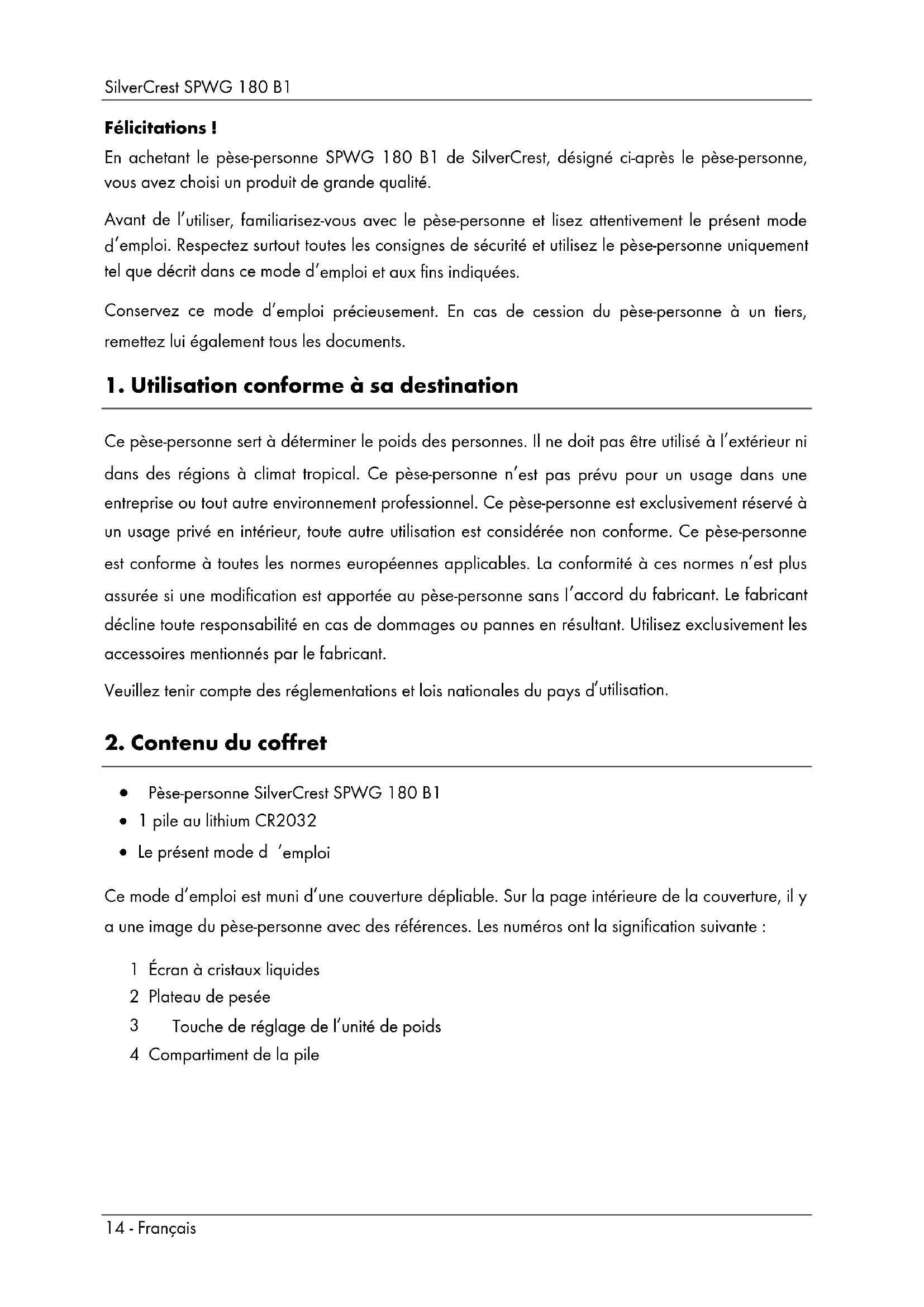 Pèse-personne SilverCrest SPWG 180 B1 1 pile au lithium CR2032 Le présent mode d ’emploi Ce mode d’emploi est muni d’une couverture dépliable. Sur la page intérieure de la couverture, il y a une image du pèse-personne avec des références. Les numéros ont la signification suivante : 1 Écran à cristaux liquides 2 Plateau de pesée