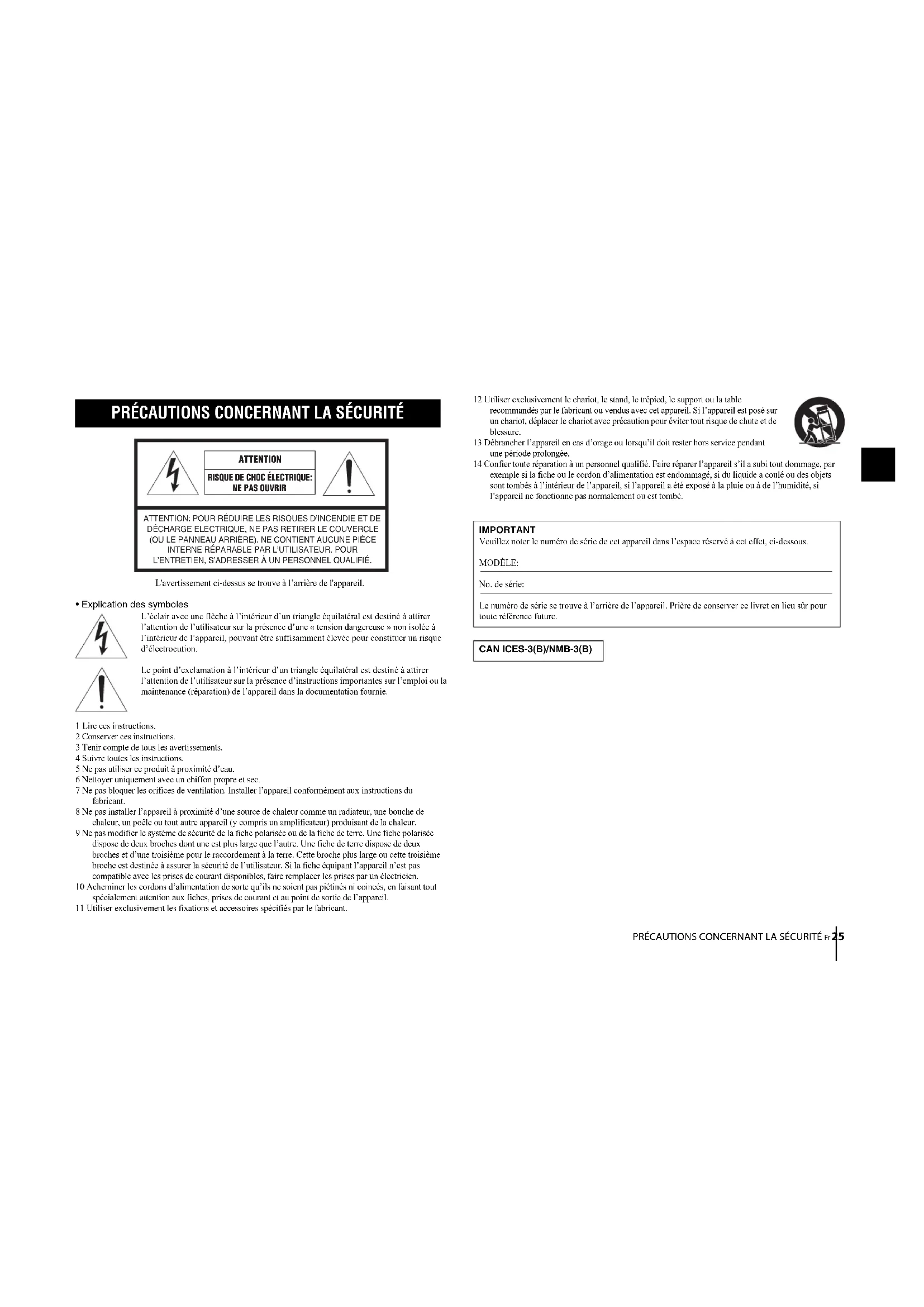 IMPORTANT Veuillez noter le numéro de série de cet appareil dans l’espace réservé à cet effet, ci-dessous.MODÈLE:No. de série:Le numéro de série se trouve à l’arrière de l’appareil. Prière de conserver ce livret en lieu sûr pour toute référence future. CAN ICES-3(B)/NMB-3(B) Français26 Fr PRÉCAUTIONS D’USAGE