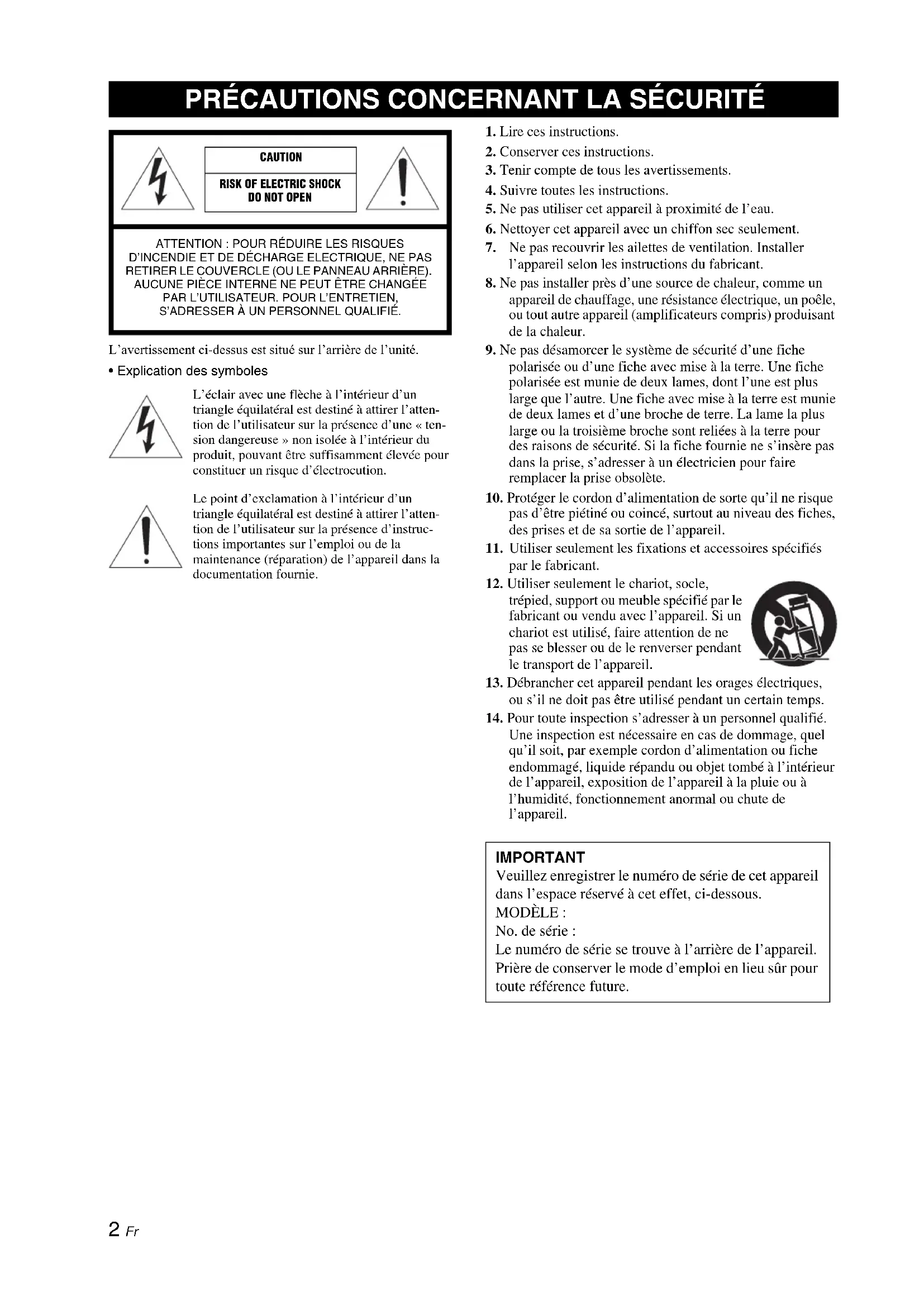 - Explication des symboles L’éclair avec une flèche à l’intérieur d’un triangle équilatéral est destiné à attirer l’atten- tion de l’utilisateur sur la présence d’une « ten- sion dangereuse » non isolée à l’intérieur du produit, pouvant être suffisamment élevée pour constituer un risque d’électrocution. Le point d’exclamation à l’intérieur d’un triangle équilatéral est destiné à attirer l’atten- tion de l’utilisateur sur la présence d’instruc- tions importantes sur l’emploi ou de la maintenance (réparation) de l’appareil dans la documentation fournie. IMPORTANT Veuillez enregistrer le numéro de série de cet appareil dans l’espace réservé à cet effet, ci-dessous. MODÈLE : No. de série : Le numéro de série se trouve à l’arrière de l’appareil. Prière de conserver le mode d’emploi en lieu sûr pour toute référence future.3 Fr Français Cet équipement est conforme aux limites d’exposition aux rayonnements énoncées pour un environnement non contrôlé et respecte les règles les radioélectriques (RF) de la FCC lignes directrices d’exposition et d’exposition aux fréquences radioélectriques (RF) CNR-102 de l’IC. Cet équipement doit être installé et utilisé en gardant une distance de 20 cm ou plus entre le dispositif rayonnant et le corps humain. Le présent appareil est conforme aux la partie 15 des règles de la FCC et CNR d’Industrie Canada applicables aux appareils radio exempts de licence. L’exploitation est autorisée aux deux conditions suivantes : (1) l’appareil ne doit pas produire de brouillage, et (2) l’utilisateur de l’appareil doit accepter tout brouillage radioélectrique subi, même si le brouillage est susceptible d’en compromettre le fonctionnement. Ce émetteur ne peut pas être placé à proximité de ou utilisé conjointement avec tout autre émetteur ou antenne. (pour le Canada) Pour une utilisation en intérieur uniquement. (can_b_02) CAN ICES-3 (B)/NMB-3(B)4 Fr