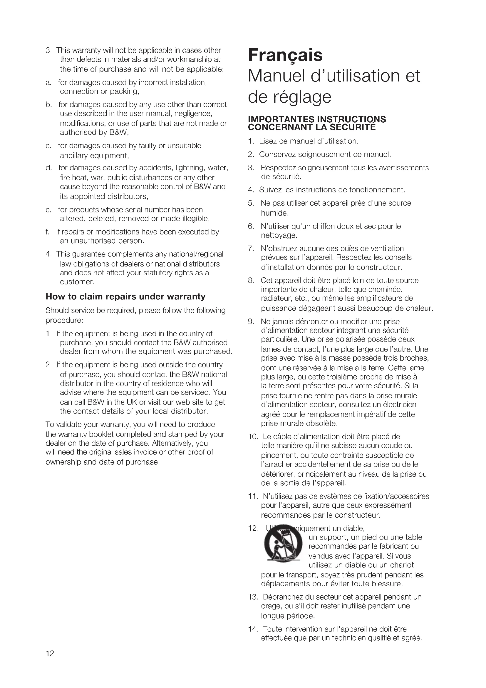 Garantie limitée Ce produit a été conçu et fabriqué en vertu des normes de qualité les plus rigoureuses. Toutefois, en cas de problème, B&W Group Ltd. et ses distributeurs nationaux garantissent une main d’œuvre (exclusions possibles) et des pièces de rechange gratuites dans tout pays desservi par un distributeur agréé de B&W. Cette garantie limitée est valide pour une période de cinq ans à compter de la date d’achat ou une période de deux ans pour les composants électroniques, y compris les haut-parleurs amplifiés. Conditions 1 La garantie est limitée à la réparation de l’équipement. Les frais de transport ou autres, les risques associés à l’enlèvement, au transport et à l’installation des produits ne sont pas couverts par cette garantie. 2 La garantie est exclusivement réservée au propriétaire d’origine et ne peut pas être transférée. 3 Cette garantie ne s’applique qu’aux produits faisant l’objet de vices de matériaux et/ou de construction au moment de l’achat et ne sera pas applicable dans les cas suivants : a. détériorations entraînées par une installation, connexion ou un emballage incorrect, b. détériorations entraînées par un usage autre que l’usage correct décrit dans le manuel de l’utilisateur, la négligence, des modifications ou l’usage de pièces qui ne sont pas fabriquées ou agréées par B&W, c. détériorations entraînées par un équipement auxiliaire défectueux ou qui ne convient pas, 7702 ISW-4 manual.indd 19 6/4/09 10:36:4820 d. détériorations résultant de : accidents, foudre, eau, chaleur, guerre, troubles de l’ordre public ou autre cause ne relevant pas du contrôle raisonnable de B&W ou de ses distributeurs agréés, e. les produits dont le numéro de série a été modifié, effacé, éliminé ou rendu illisible, f. les produits qui ont été réparés ou modifiés par une personne non autorisée. 4 Cette garantie vient en complément à toute obligation juridique nationale / régionale des revendeurs ou distributeurs nationaux et n’affecte pas vos droits statutaires en tant que client. Comment faire une réclamation en vertu de la garantie Veuillez respecter la procédure ci-dessous, si vous souhaitez faire une réclamation sous garantie : 1 Si l’équipement est utilisé dans le pays d’achat, veuillez contacter le distributeur agréé de B&W qui a vendu l’équipement. 2 Si l’équipement est utilisé dans un pays autre que le pays d’achat, veuillez contacter le distributeur national B&W du pays de résidence, qui vous indiquera où vous pouvez faire réparer l’équipement. Vous pouvez appeler B&W au Royaume-Uni ou consulter notre site Web pour obtenir les coordonnées de votre distributeur local. Afin de valider votre garantie, vous devrez présenter ce livret de garantie qui aura été rempli et tamponné par votre revendeur le jour de l’achat. En l’absence de ce livret, vous devrez présenter l’original de la facture commerciale ou une autre preuve d’achat et de la date d’achat. Deutsch Bedienungsanleitung für die Installation und das Setup Wichtige Sicherheitshinweise