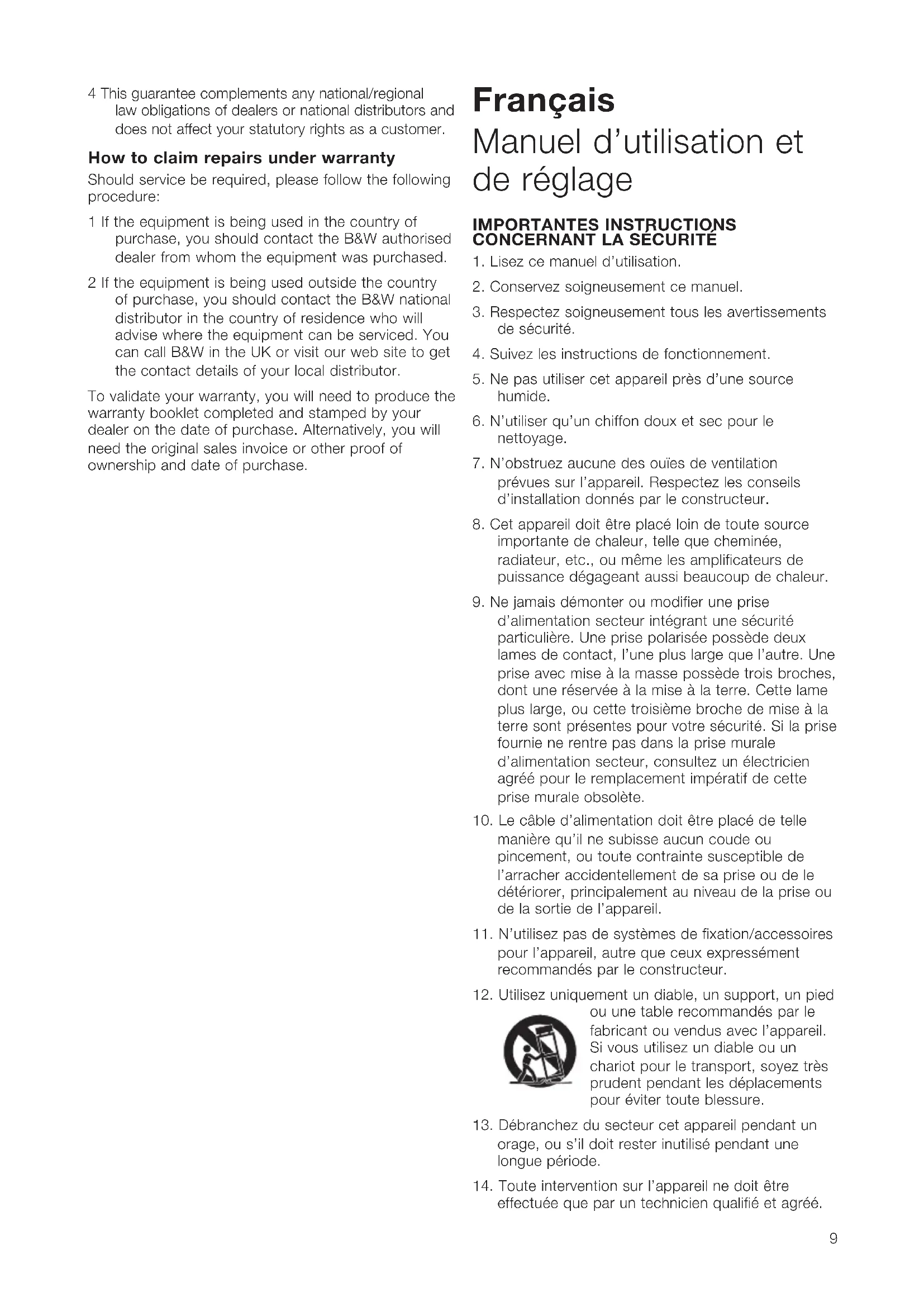 Garantie limitée Ce produit a été conçu et fabriqué en vertu des normes de qualité les plus rigoureuses. Toutefois, en cas de problème, B&W Group Ltd. et ses distributeurs nationaux garantissent une main d’œuvre (exclusions possibles) et des pièces de rechange gratuites dans tout pays desservi par un distributeur agréé de B&W. Cette garantie limitée est valide pour une période de cinq ans à compter de la date d’achat ou une période de deux ans pour les composants électroniques, y compris les haut-parleurs amplifiés. Conditions 1 La garantie est limitée à la réparation de l’équipement. Les frais de transport ou autres, les risques associés à l’enlèvement, au transport et à l’installation des produits ne sont pas couverts par cette garantie. 2 La garantie est exclusivement réservée au propriétaire d’origine et ne peut pas être transférée. 3 Cette garantie ne s’applique qu’aux produits faisant l’objet de vices de matériaux et/ou de construction au moment de l’achat et ne sera pas applicable dans les cas suivants : a. détériorations entraînées par une installation, connexion ou un emballage incorrect, b. détériorations entraînées par un usage autre que l’usage correct décrit dans le manuel de l’utilisateur, la négligence, des modifications ou l’usage de pièces qui ne sont pas fabriquées ou agréées par B&W, c. détériorations entraînées par un équipement auxiliaire défectueux ou qui ne convient pas, d. détériorations résultant de : accidents, foudre, eau, chaleur, guerre, troubles de l’ordre public ou autre cause ne relevant pas du contrôle raisonnable de B&W ou de ses distributeurs agréés, e. les produits dont le numéro de série a été modifié, effacé, éliminé ou rendu illisible, f. les produits qui ont été réparés ou modifiés par une personne non autorisée. 4 Cette garantie vient en complément à toute obligation juridique nationale / régionale des revendeurs ou distributeurs nationaux et n’affecte pas vos droits statutaires en tant que client. Comment faire une réclamation en vertu de la garantie Veuillez respecter la procédure ci-dessous, si vous souhaitez faire une réclamation sous garantie : 1 Si l’équipement est utilisé dans le pays d’achat, veuillez contacter le distributeur agréé de B&W qui a vendu l’équipement. 2 Si l’équipement est utilisé dans un pays autre que le pays d’achat, veuillez contacter le distributeur national B&W du pays de résidence, qui vous indiquera où vous pouvez faire réparer l’équipement. Vous pouvez appeler B&W au Royaume-Uni ou consulter notre site Web pour obtenir les coordonnées de votre distributeur local. Afin de valider votre garantie, vous devrez présenter ce livret de garantie qui aura été rempli et tamponné par votre revendeur le jour de l’achat. En l’absence de ce livret, vous devrez présenter l’original de la facture commerciale ou une autre preuve d’achat et de la date d’achat.