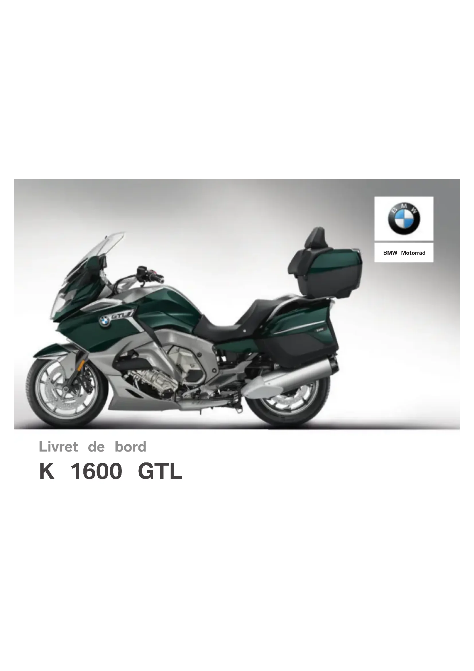 Livret de bord K 1600 GTL BMW MotorradDonnées moto / concessionnaire Données de la moto Modèle Numéro d'identification du véhicule Code couleur Première immatriculation N° d'immatriculation Données du concessionnaire Interlocuteur au service après-vente Madame/Monsieur N° de téléphone Adresse du concessionnaire/Téléphone (cachet de la société)Bienvenue chez BMW Nous vous félicitons d'avoir porté votre choix sur un véhicule de BMW Motorrad et avons le plaisir de vous accueillir dans le cercle des pilotes BMW. Familiarisez- vous avec votre nouveau véhicule afin d'être en mesure de vous déplacer en toute sécurité sur les routes. À propos de cette notice d'utilisation Lisez cette notice d'utilisation avant de démarrer votre nouvelle BMW. Vous y trouverez des in- dications importantes concernant l'utilisation du véhicule qui vous permettront de profiter pleine- ment des avantages techniques de votre BMW. Vous y trouverez également des informations sur l'entretien et la maintenance de façon à assurer la sécurité de fonctionnement, la sécurité routière et une conser- vation optimale de la valeur de votre véhicule. La justification de l'exécution des travaux de maintenance est une condition préalable à toute pres- tation fournie à titre commercial. Si vous étiez amené un jour à vendre votre BMW, pensez à re- mettre la notice d'utilisation. Elle constitue un élément important de votre véhicule. Suggestions et critiques Votre concessionnaire BMW Motorrad se fera un plaisir de vous conseiller et de répondre à toutes les questions que vous pourrez lui poser au sujet de votre moto. Nous espérons que votre BMW vous donnera entière satisfaction et vous souhaitons bonne route BMW Motorrad.