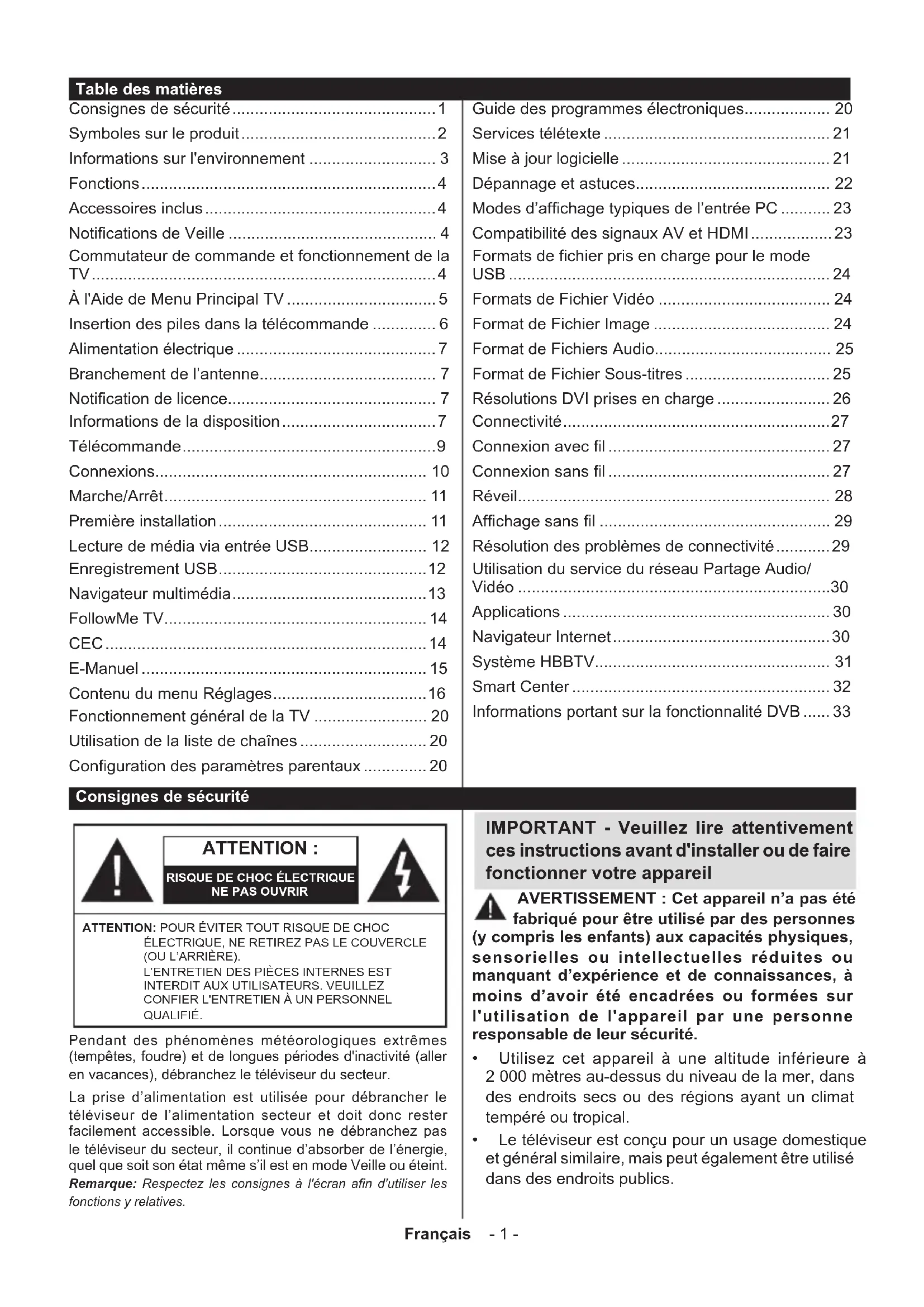 - (requis pour les fonctions d’enregistrement USB, si disponibles) Remarques : Pour les appareils Android, les dimensions d'écran Normal (mdpi), Large (hdpi) et Extra Large (xhdpi) sont prises en charges. Les appareils avec des écrans de 3” ou plus petits ne sont pas pris en charge. Pour les appareils iOS, toutes les dimensions d'écran sont prises en charge. L'interface utilisateur de l'application Smart Center peut changer en fonction de la version installée sur votre appareil. Informations portant sur la fonctionnalité DVB L’utilisation de ce récepteur DVB est indiquée uniquement dans le pays pour lequel il a été fabriqué. Bien que ce récepteur DVB soit conforme aux spécifications DVB les plus récentes au moment de sa fabrication, nous ne saurions en garantir la compatibilité avec les transmissions DVB ultérieures en raison des changements susceptibles d’intervenir dans les signaux et technologies de diffusion. Certaines fonctions du téléviseur numérique peuvent ne pas être disponibles dans tous les pays. Nous nous efforçons chaque jour à améliorer davantage la qualité de nos produits ; par conséquent, leurs spécifications peuvent changer sans préavis. Pour savoir où acheter des accessoires, veuillez contacter le magasin dans lequel vous avez acheté votre équipement.English - 1 - Safety Information Contents Safety Information p. 1