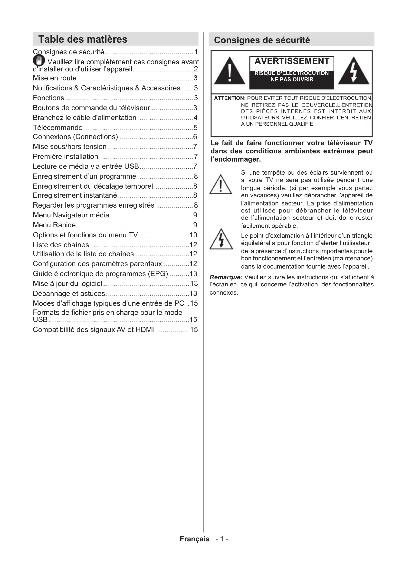 - Compatibilité des signaux AV et HDMI Consignes de sécurité Le fait de faire fonctionner votre téléviseur TV dans des conditions ambiantes extrêmes peut l’endommager. AVERTISSEMENT RISQUE D’ELECTROCUTIONNE PAS OUVRIRATTENTION: POUR EVITER TOUT RISQUE D’ELECTROCUTION, NE RETIREZ PAS LE COUVERCLE.L’ENTRETIEN DES PIÈCES INTERNES EST INTERDIT AUX UTILISATEURS. VEUILLEZ CONFIER L’ENTRETIEN A UN PERSONNEL QUALIFIE.Remarque: Veuillez suivre les instructions qui s’afchent à l’écran en ce qui concerne l’activation des fonctionnalités connexes.Si une tempête ou des éclairs surviennent ou si votre TV ne sera pas utilisée pendant une longue période. (si par exemple vous partez en vacances) veuillez débrancher l’appareil de l’alimentation secteur. La prise d’alimentation est utilisée pour débrancher le téléviseur de l’alimentation secteur et doit donc rester facilement opérable.Le point d’exclamation à l’intérieur d’un triangle équilatéral a pour fonction d’alerter l’utilisateur de la présence d’instructions importantes pour le bon fonctionnement et l’entretien (maintenance) dans la documentation fournie avec l’appareil.Français - 2 - p. 15