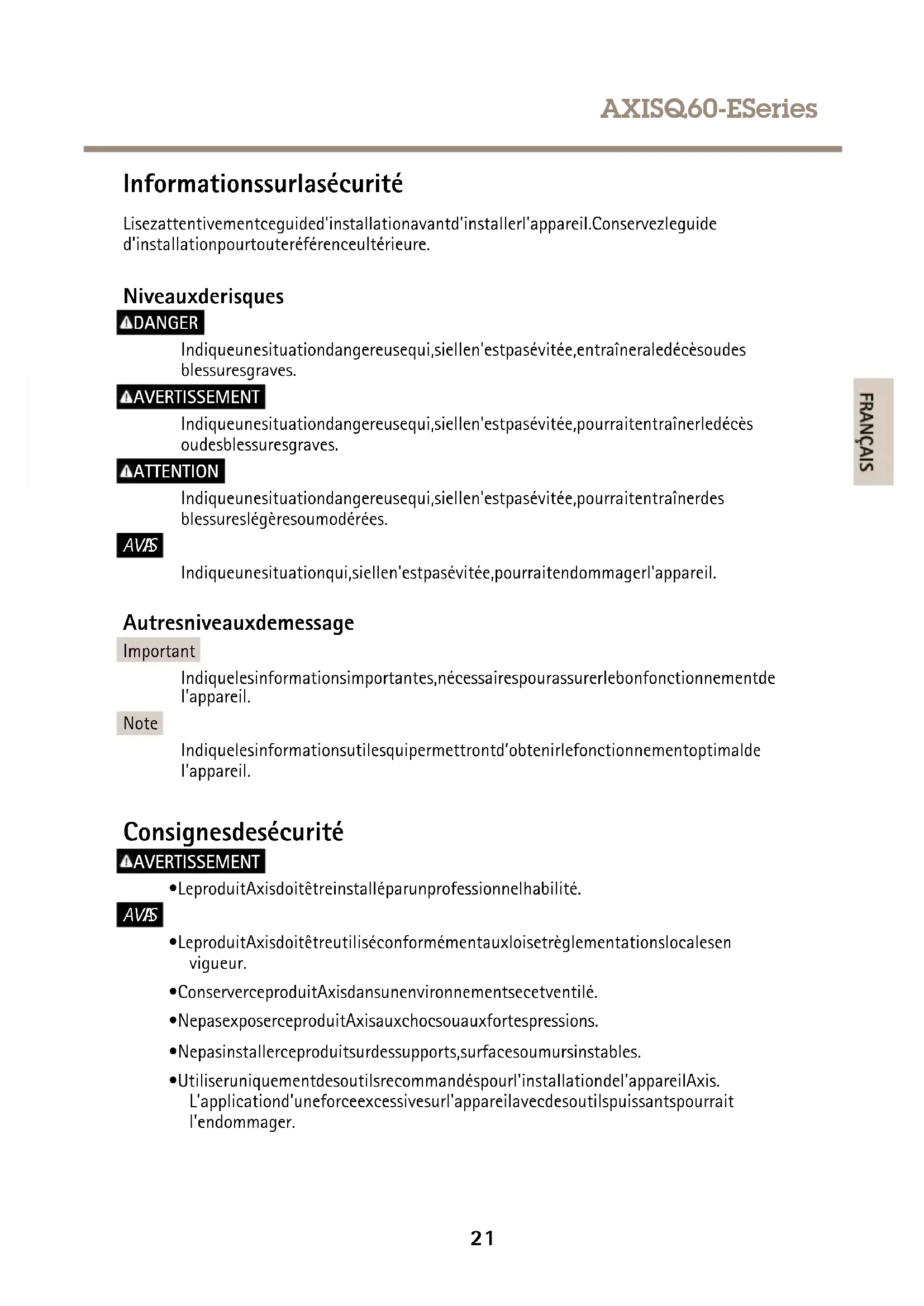 - Utiliseruniquementdesaccessoiresconformesauxcaractéristiquestechniquesduproduit. IlspeuventêtrefournisparAxisouuntiers.