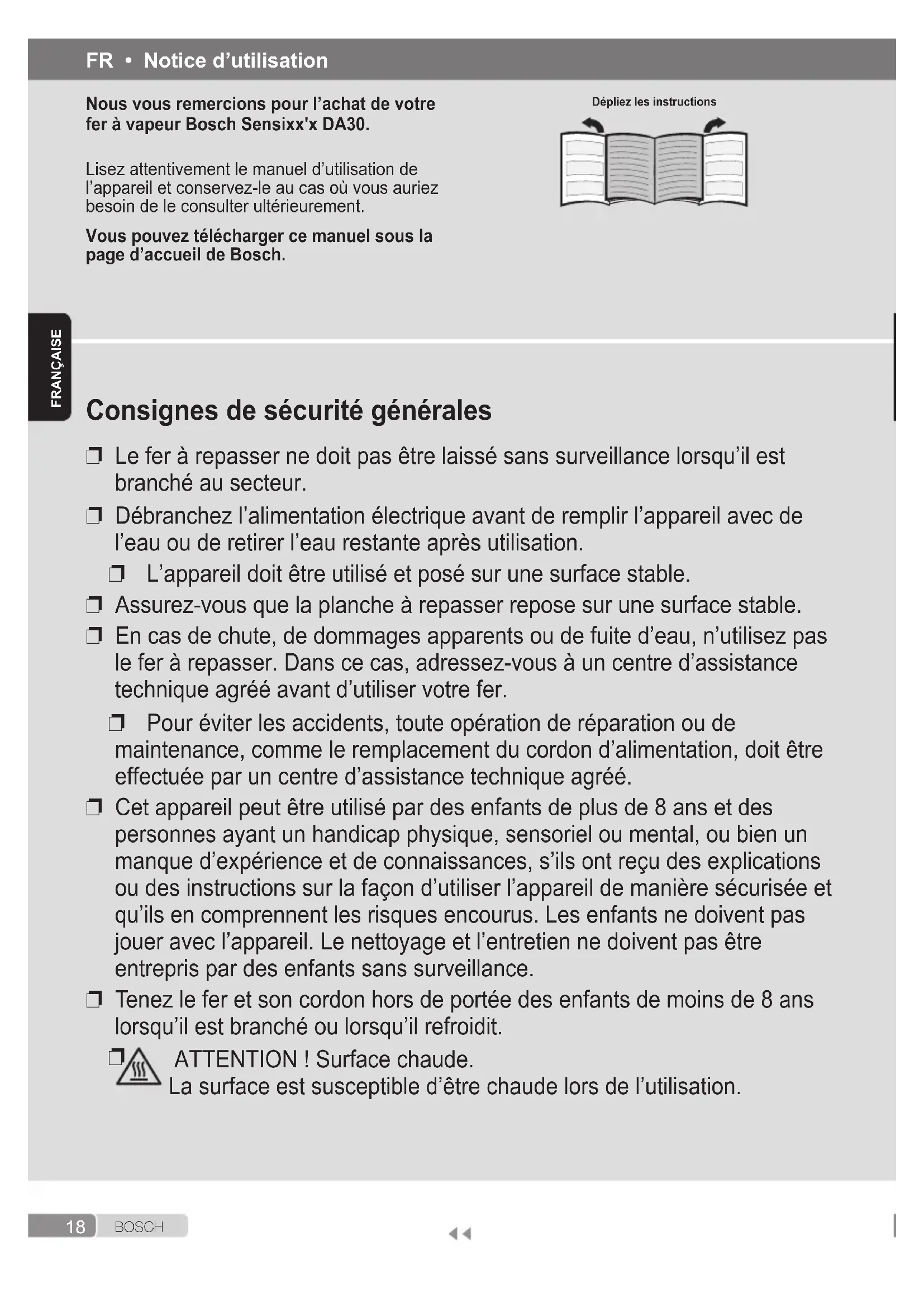 ❐ Le fer à repasser ne doit pas être laissé sans surveillance lorsqu’il est branché au secteur. ❐ Débranchez l’alimentation électrique avant de remplir l’appareil avec de l’eau ou de retirer l’eau restante après utilisation. ❐ L’appareil doit être utilisé et posé sur une surface stable. ❐ Assurez-vous que la planche à repasser repose sur une surface stable. ❐ En cas de chute, de dommages apparents ou de fuite d’eau, n’utilisez pas le fer à repasser. Dans ce cas, adressez-vous à un centre d’assistance technique agréé avant d’utiliser votre fer. ❐ Pour éviter les accidents, toute opération de réparation ou de maintenance, comme le remplacement du cordon d’alimentation, doit être effectuée par un centre d’assistance technique agréé. ❐ Cet appareil peut être utilisé par des enfants de plus de 8 ans et des personnes ayant un handicap physique, sensoriel ou mental, ou bien un manque d’expérience et de connaissances, s’ils ont reçu des explications ou des instructions sur la façon d’utiliser l’appareil de manière sécurisée et qu’ils en comprennent les risques encourus. Les enfants ne doivent pas jouer avec l’appareil. Le nettoyage et l’entretien ne doivent pas être entrepris par des enfants sans surveillance. ❐ Tenez le fer et son cordon hors de portée des enfants de moins de 8 ans lorsqu’il est branché ou lorsqu’il refroidit.