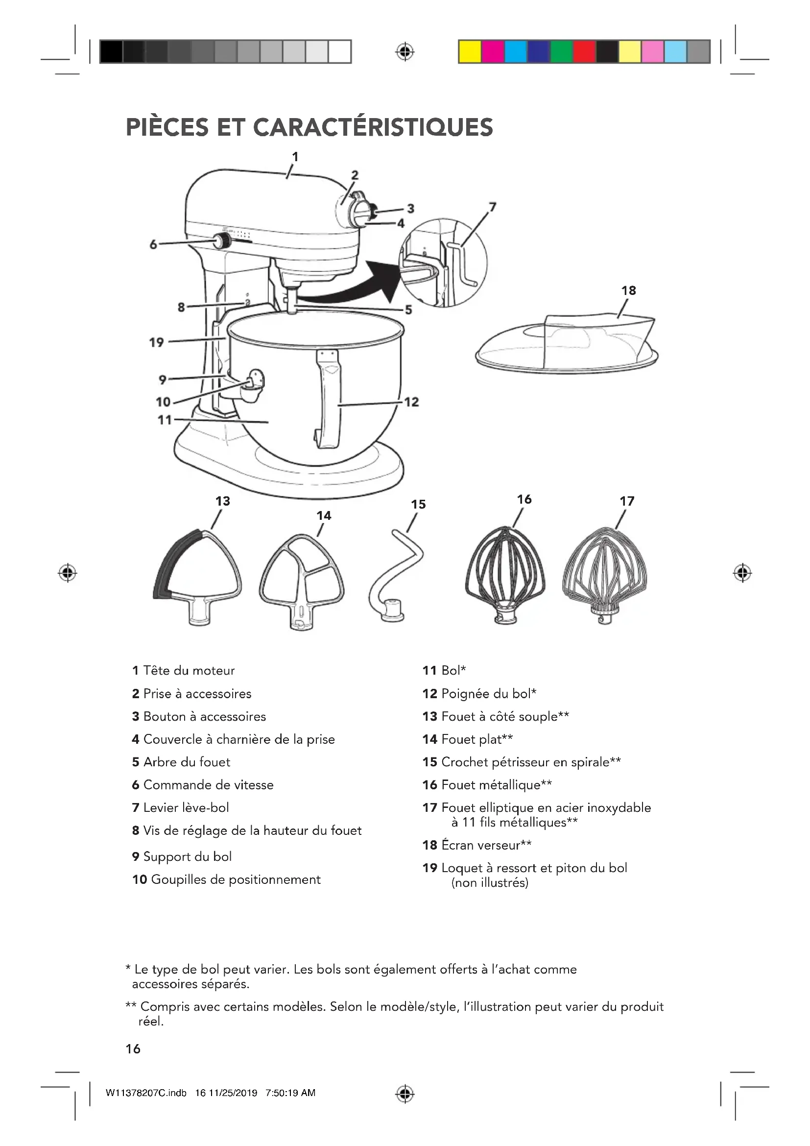 1 Tête du moteur 2 Prise à accessoires 3 Bouton à accessoires 4 Couvercle à charnière de la prise 5 Arbre du fouet 6 Commande de vitesse 7 Levier lève-bol 8 Vis de réglage de la hauteur du fouet 9 Support du bol 10 Goupilles de positionnement 11 Bol* 12 Poignée du bol* 13 Fouet à côté souple** 14 Fouet plat** 15 Crochet pétrisseur en spirale** 16 Fouet métallique** 17 Fouet elliptique en acier inoxydable à11 fils métalliques** 18 Écran verseur** 19 Loquet à ressort et piton du bol (nonillustrés)